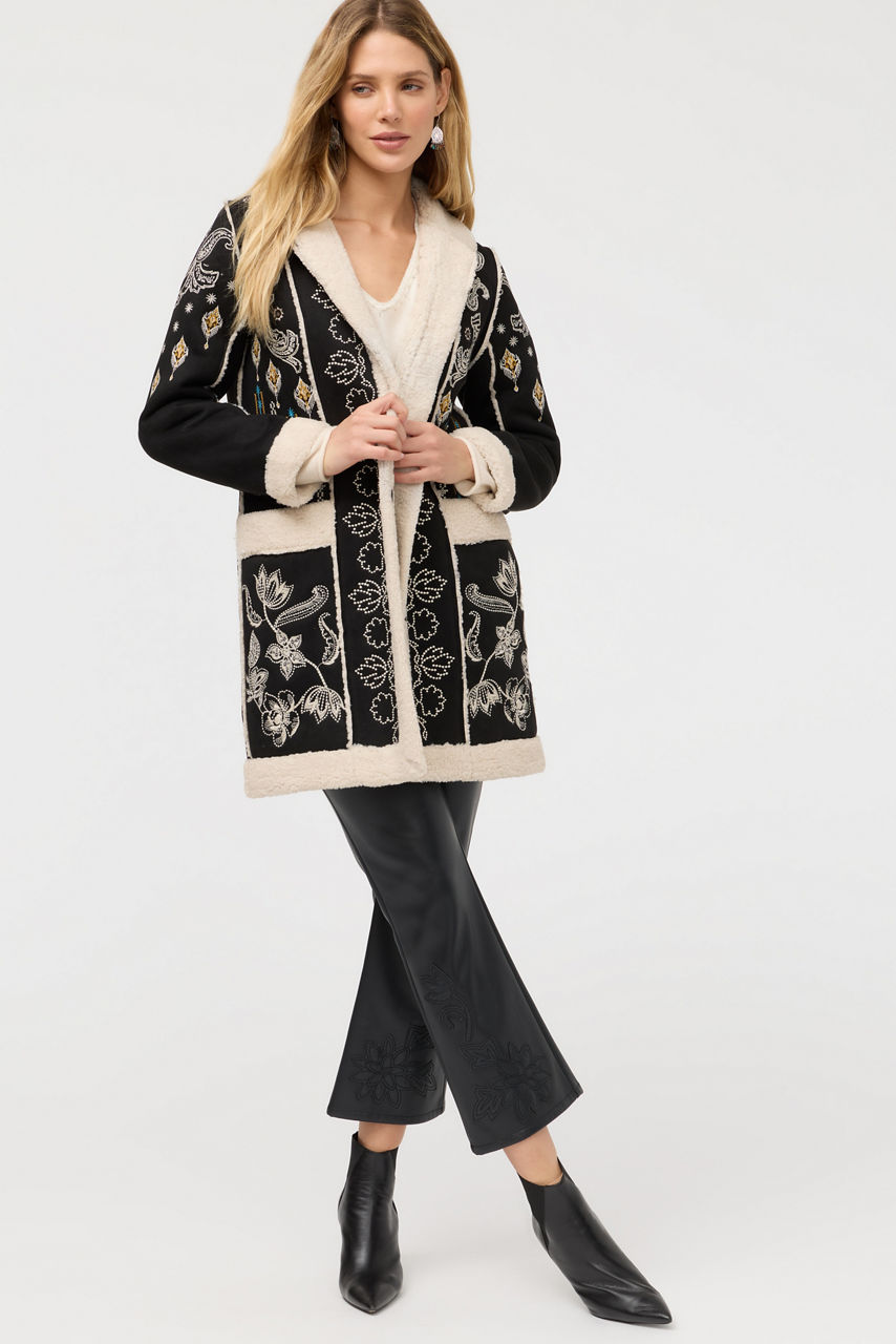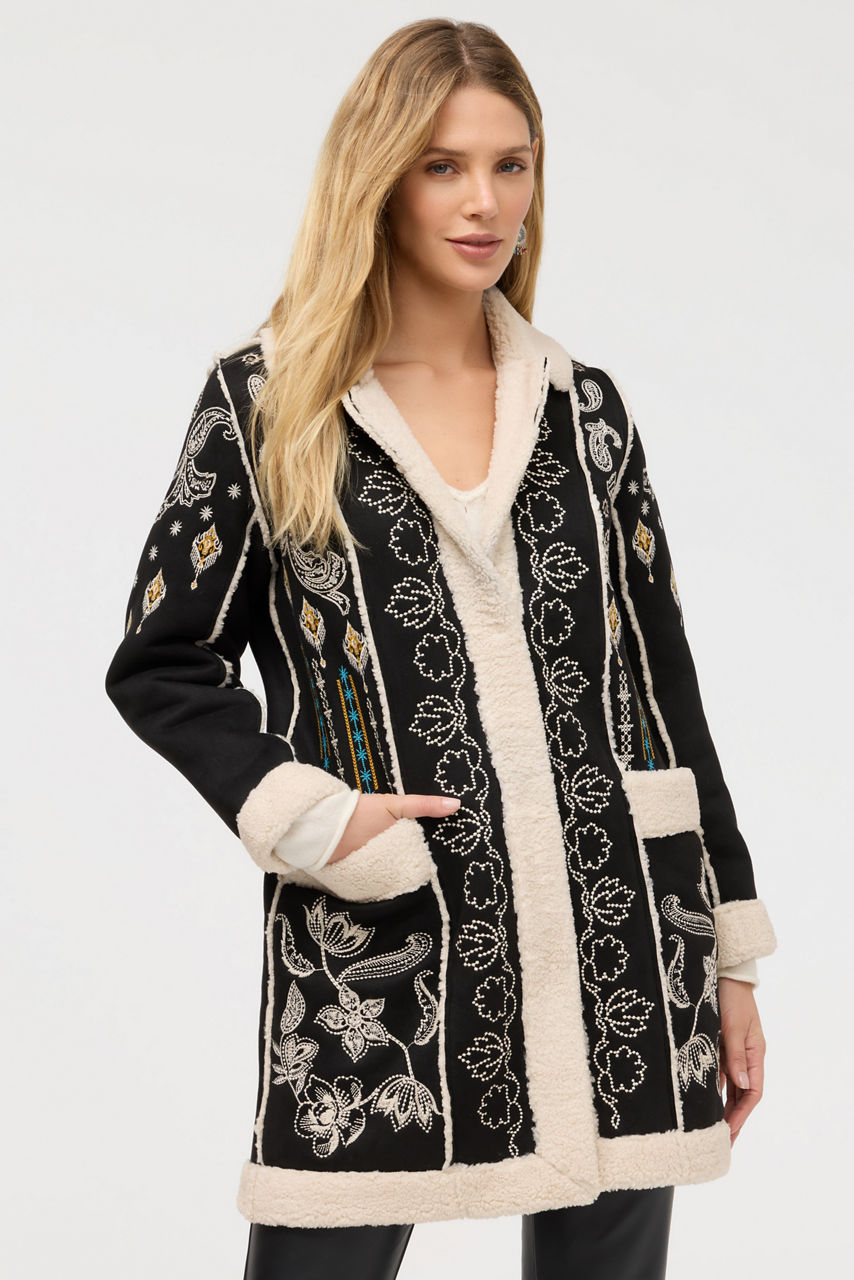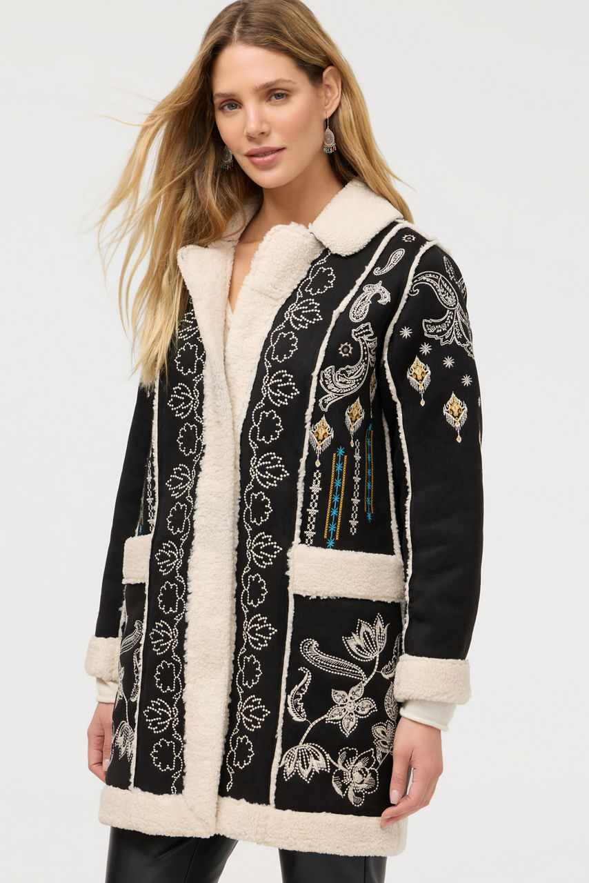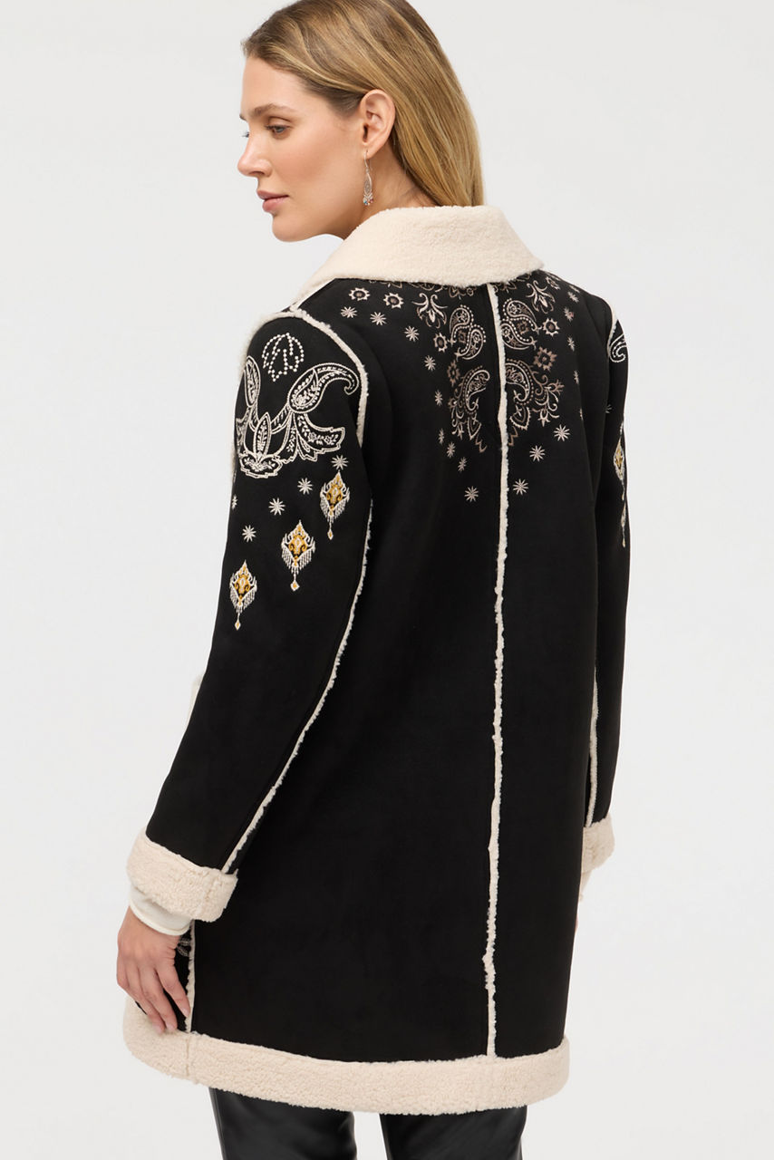Beautifully embroidered with intricate detailing, the Cheyenne Lori Faux Suede Sherpa Jacket is equal parts cozy and stylish. Designed with an attached hood and a snap-front closure, this jacket is crafted from faux fur suede backed with sherpa and finished with exterior slip pockets. Layer over a turtleneck and black jeans for a polished night out with friends.