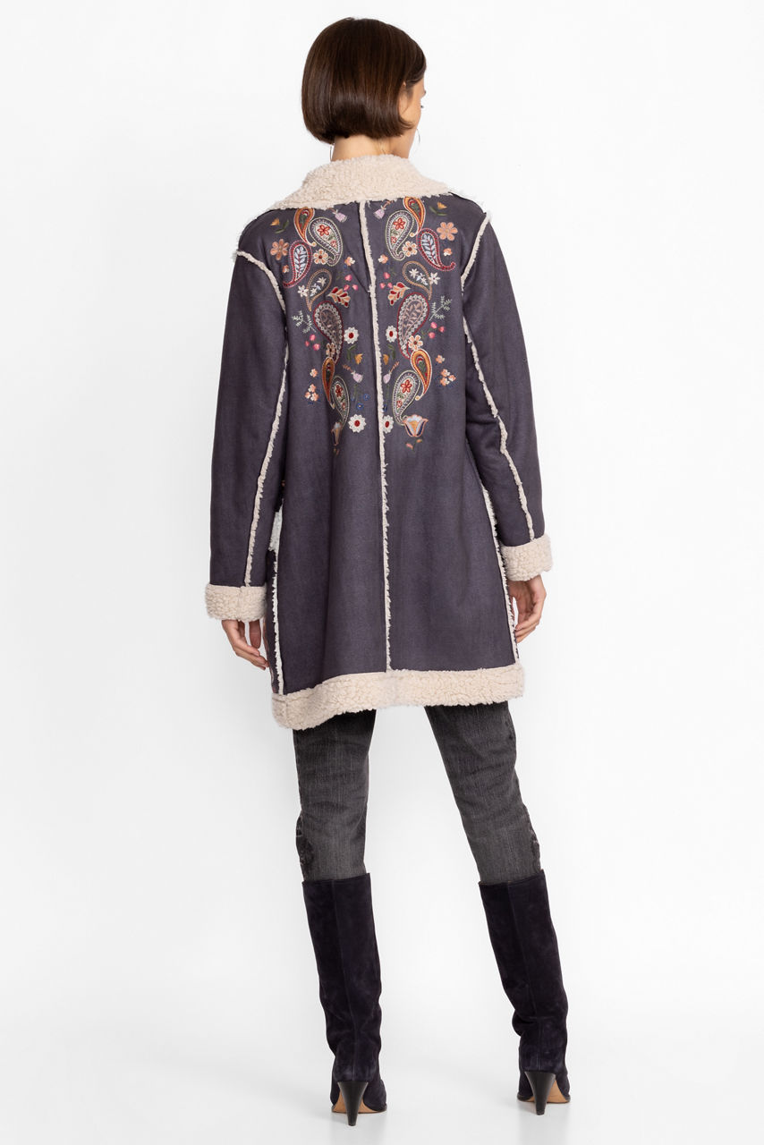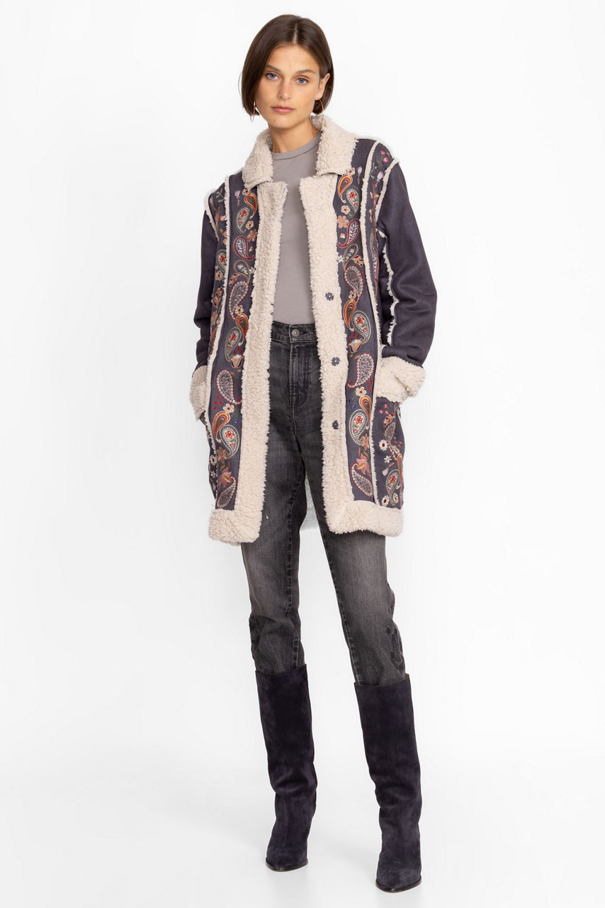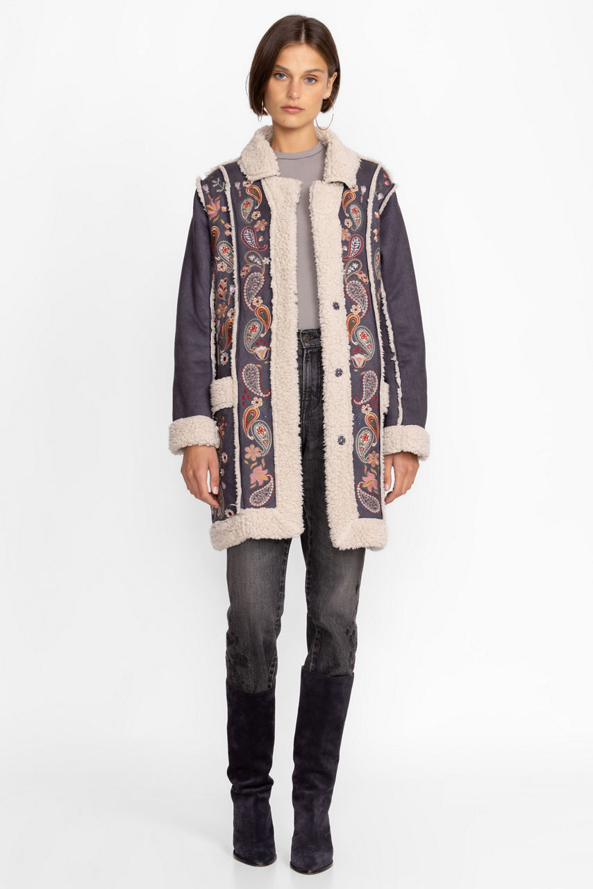 Delivering old world charm in a distinctively modern wardrobe piece, the Lori Suede Sherpa Jacket is a cozy addition to your cold weather wardrobe. Featuring colorful placement embroidery and an easy snap button closure, this beautiful suede features a comforting sherpa trim for additional warmth. Layer over a bold color sweater and relaxed denim for an unforgettable look.