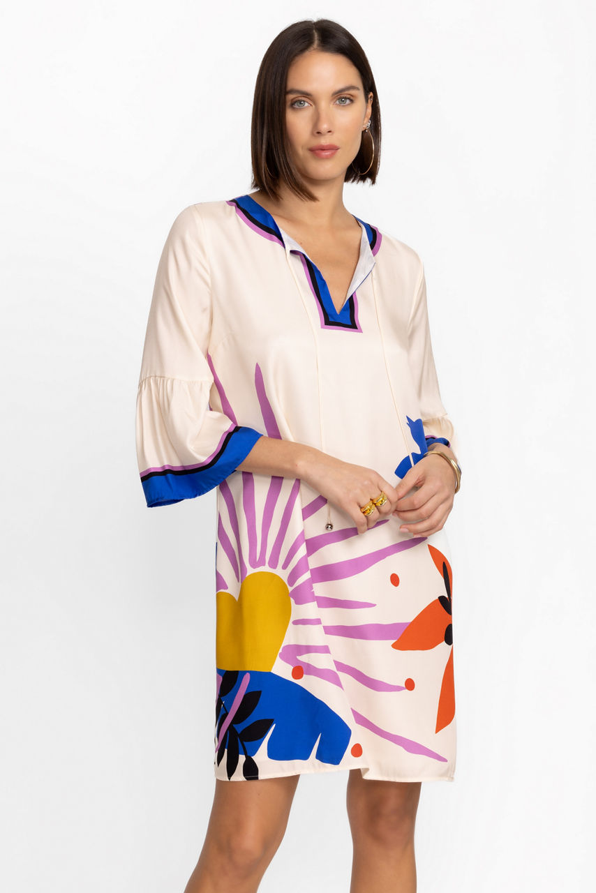 Crafted from a unique silk blend, the Lorianne Mini Dress is alive with vibrant color. Featuring a split V-neckline bordered in deep blue and ruffled sleeves, this A-line dress is adorned with bold decorative florals for an eye-catching look. Pair with casual sandals and a vibrant handbag for a resort-inspired look.