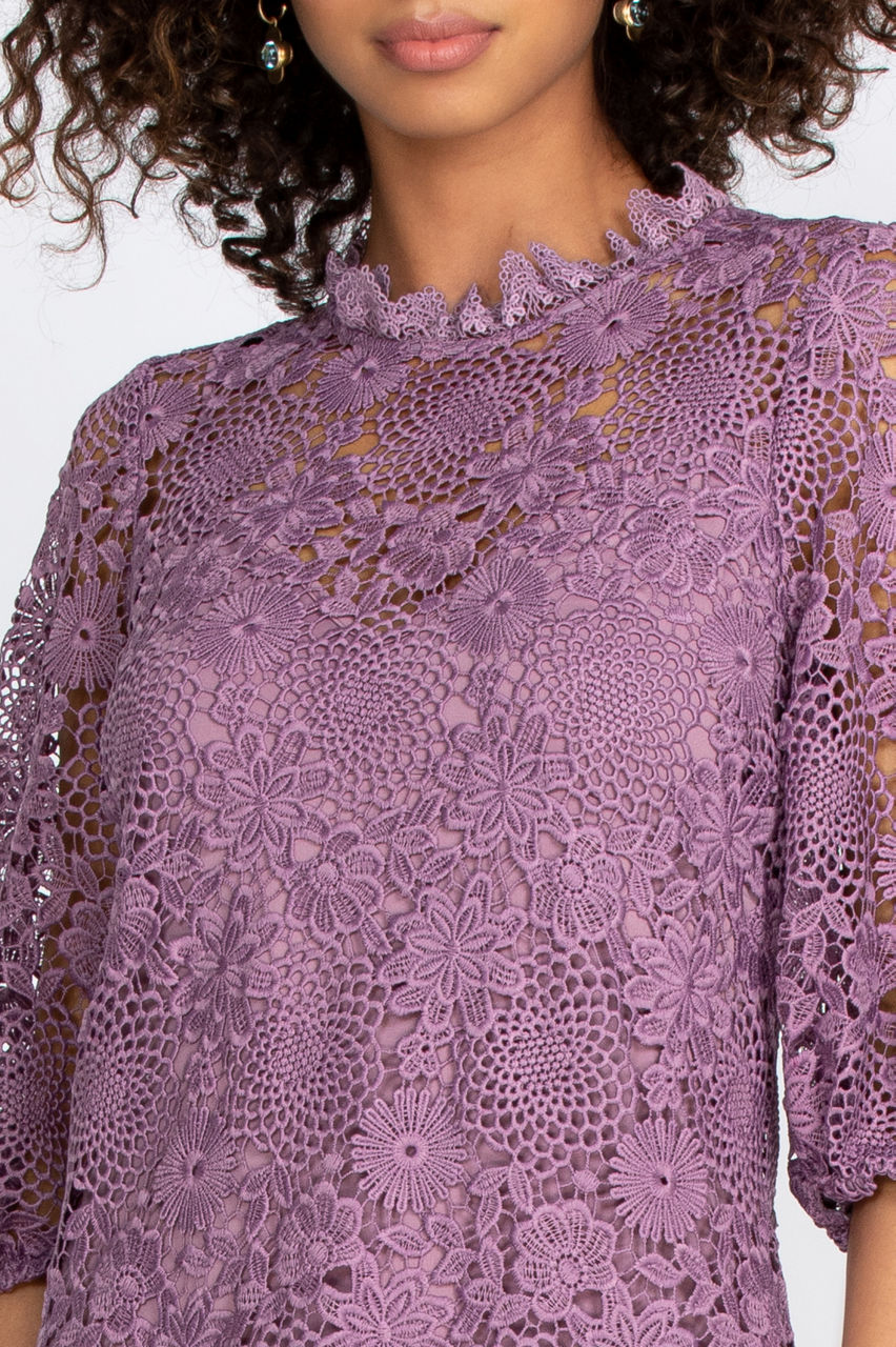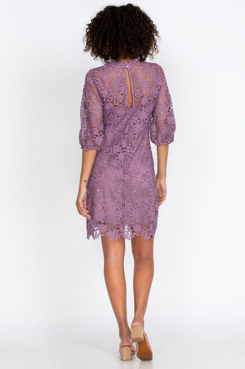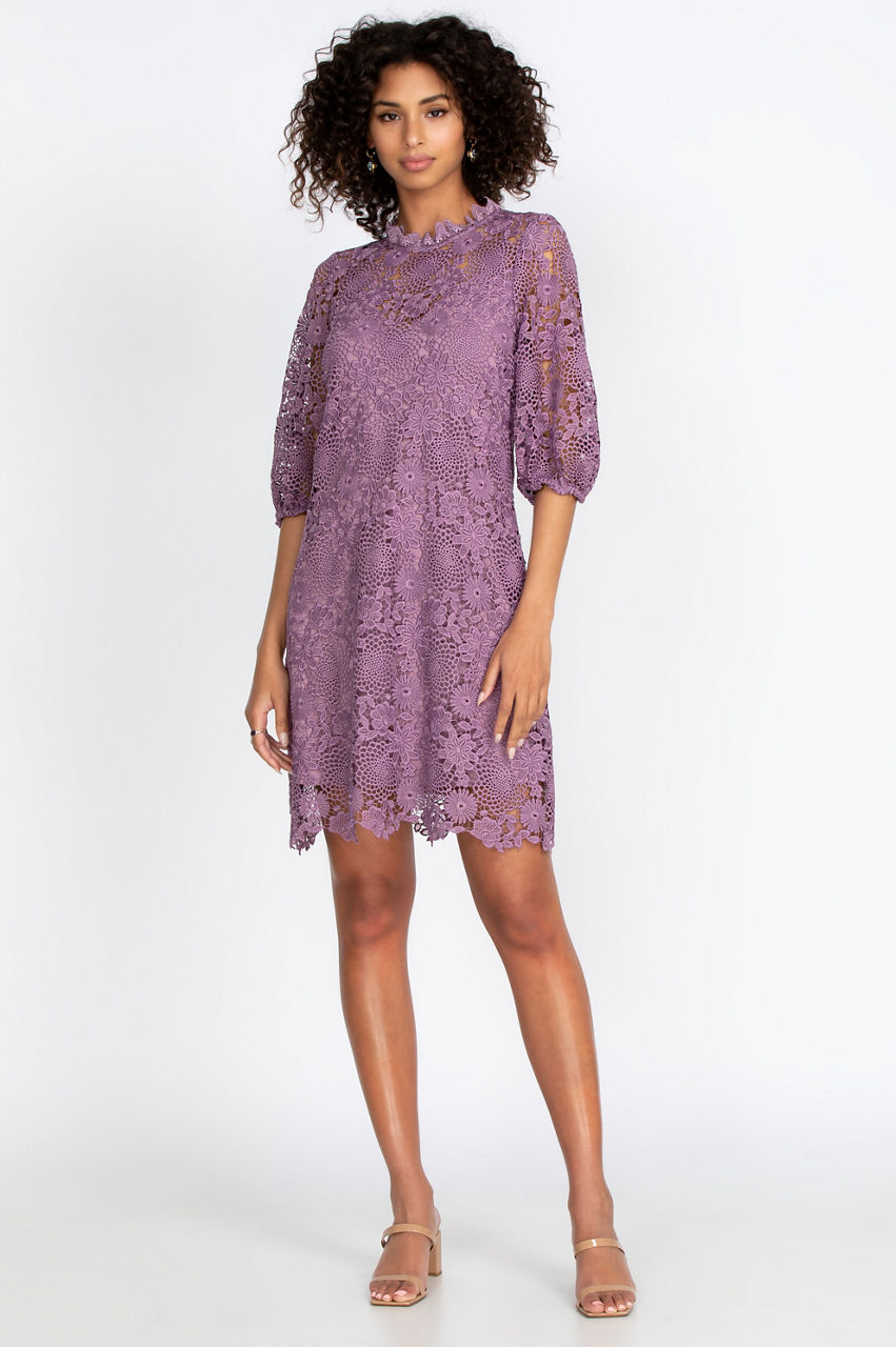 The Lorrie Mini Dress is a gorgeous piece with its delicate cotton crochet details. The ruffle collar and hem design create a sophisticated retro-inspired look. The puff sleeve and layered effect add structure to the dress and make it versatile. You can dress down this stylish garment with some sneakers or dress it up with a blazer.