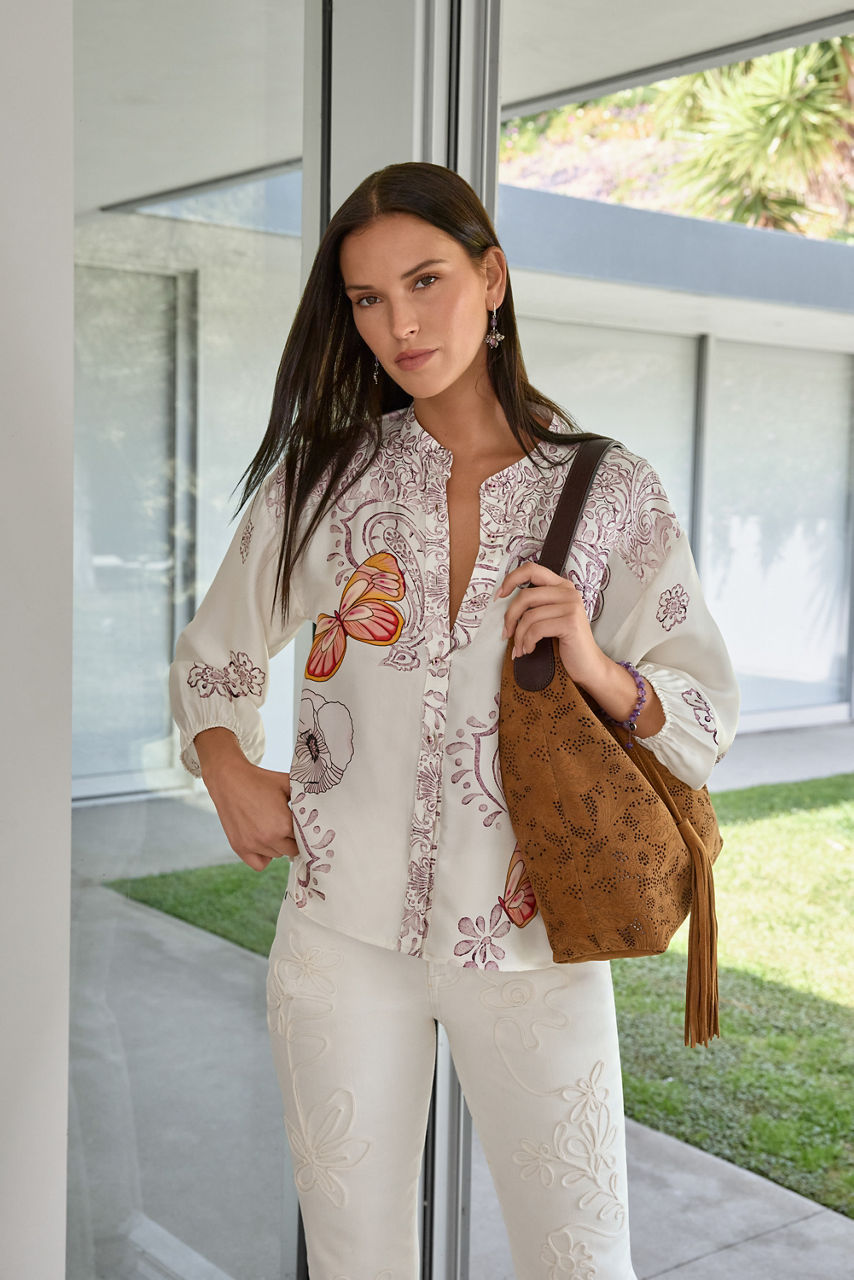 Crafted from a rich silk blend, the Lucinda Button Down Shirt is adorned with a vibrant floral pattern accented with rich paisley. Featuring a banded collar with a button front, this vibrant blouse is finished with gently puffed 3/4 sleeves and a keyhole at the back. Pair with fitted jeans and trendy ankle boots for a fun girls' night out.