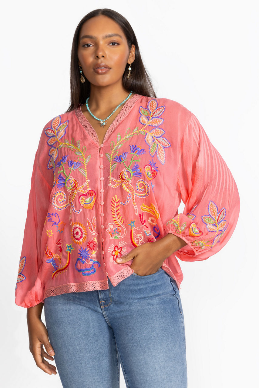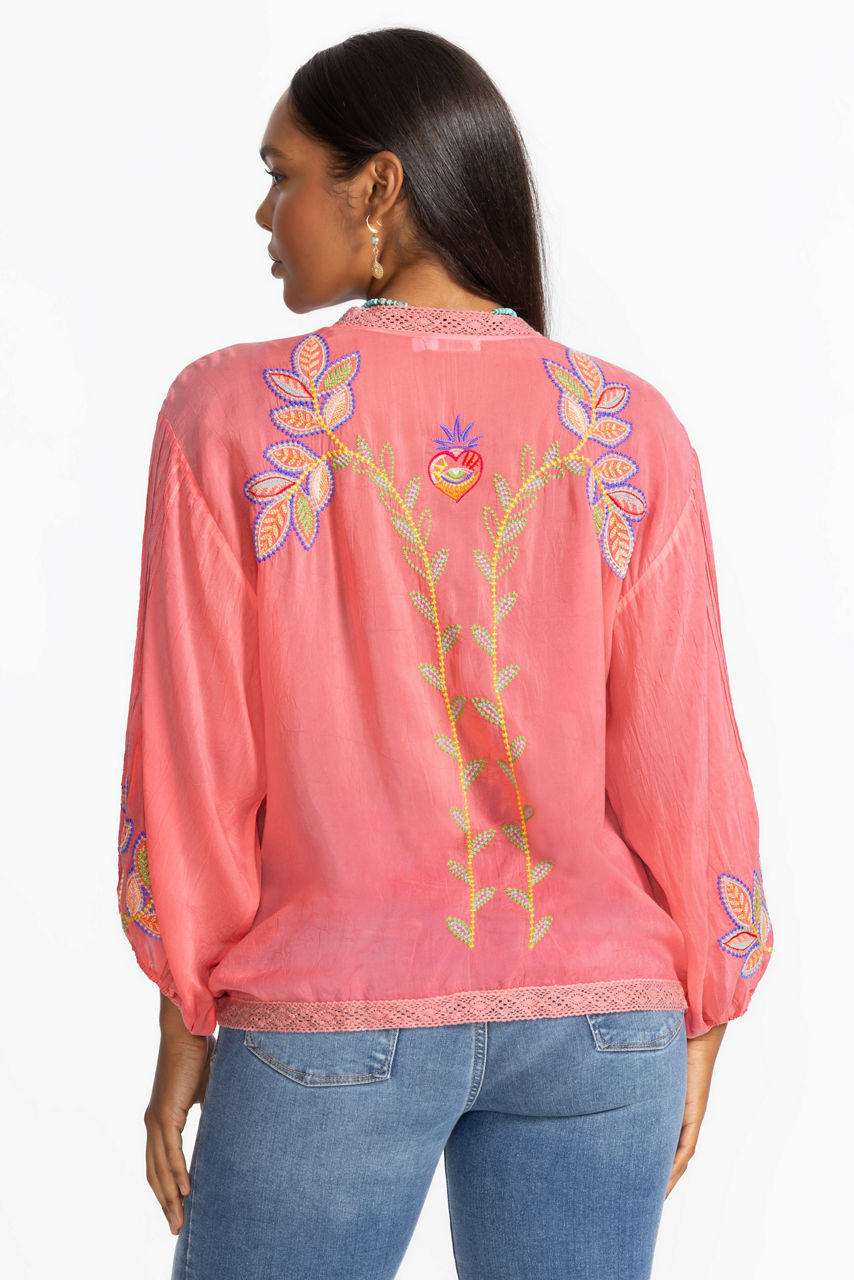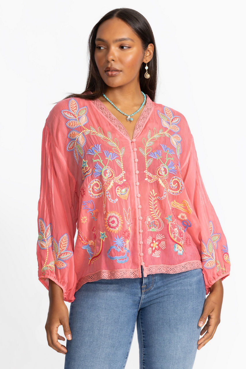Crafted from a lightweight and breathable fabric, the Luna Shirt is thoughtfully embellished with intricate embroidered floral details. Designed with a V-neckline and gently puffed long sleeves, this breezy top offers lace detailing at the neck and hemline for a uniquely feminine look. Pair with a maxi skirt and wide belt for a fresh warm weather look.
