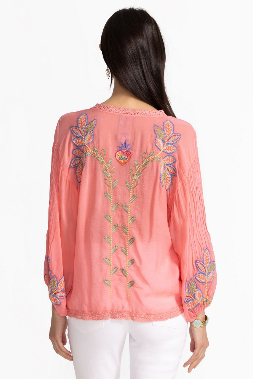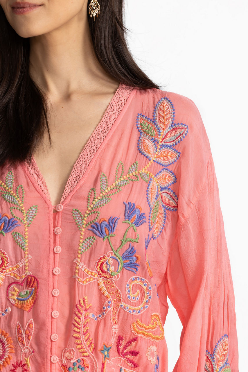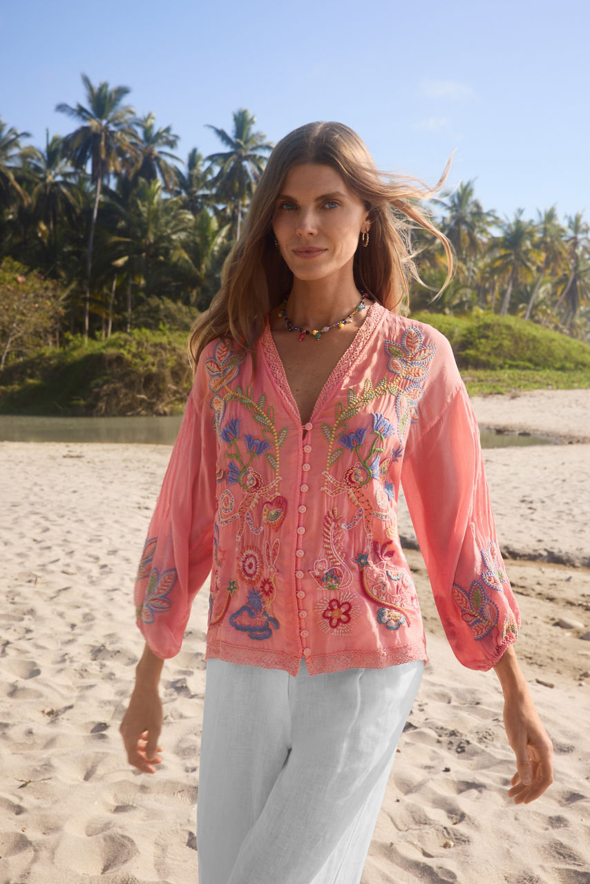 Crafted from a lightweight and breathable fabric, the Luna Shirt is thoughtfully embellished with intricate embroidered floral details. Designed with a V-neckline and gently puffed long sleeves, this breezy top offers lace detailing at the neck and hemline for a uniquely feminine look. Pair with a maxi skirt and wide belt for a fresh warm weather look.