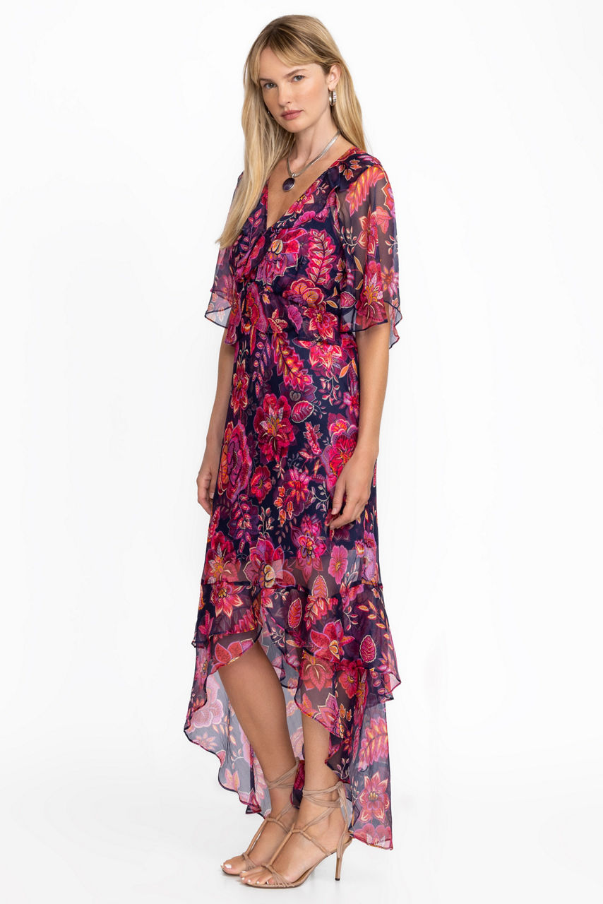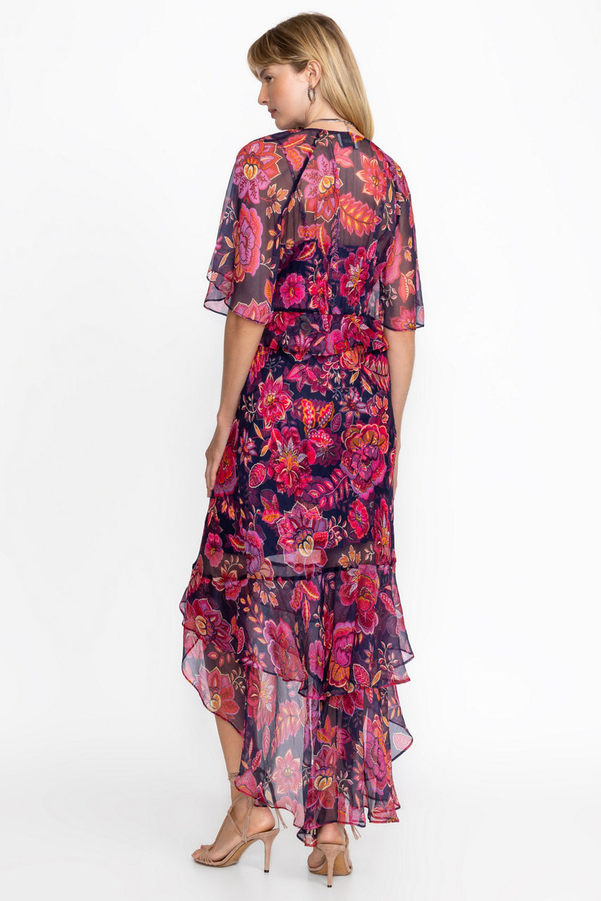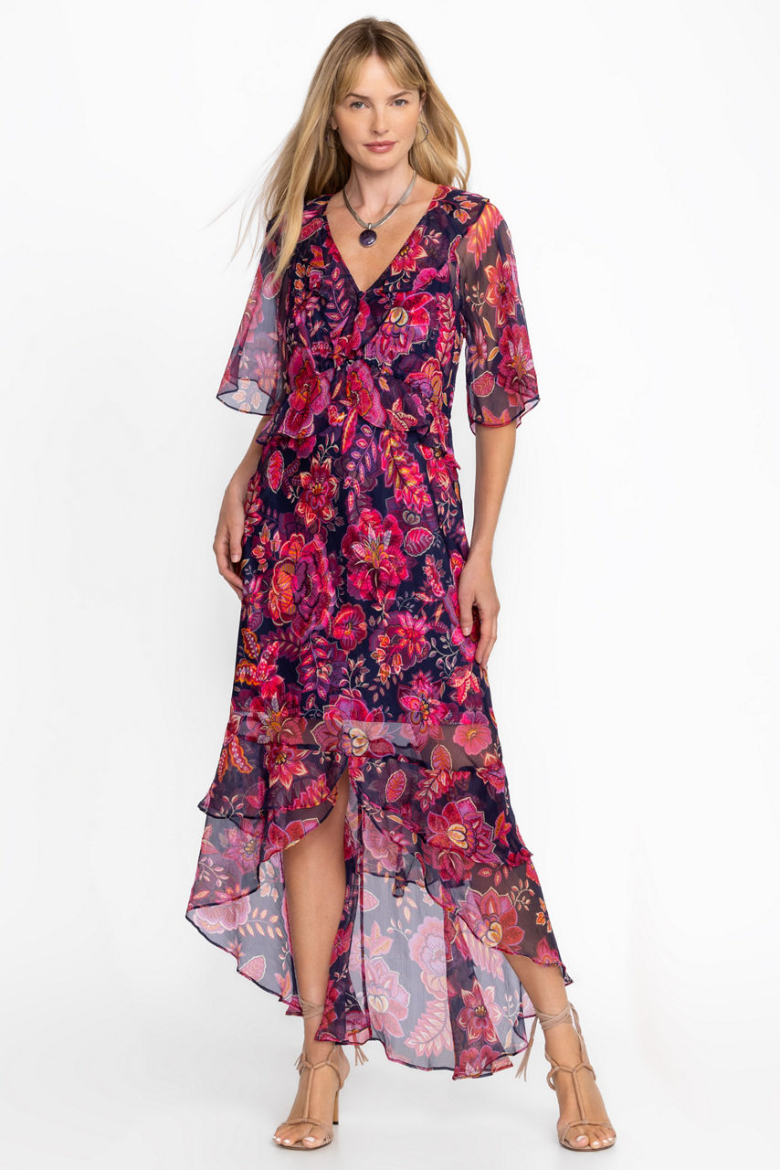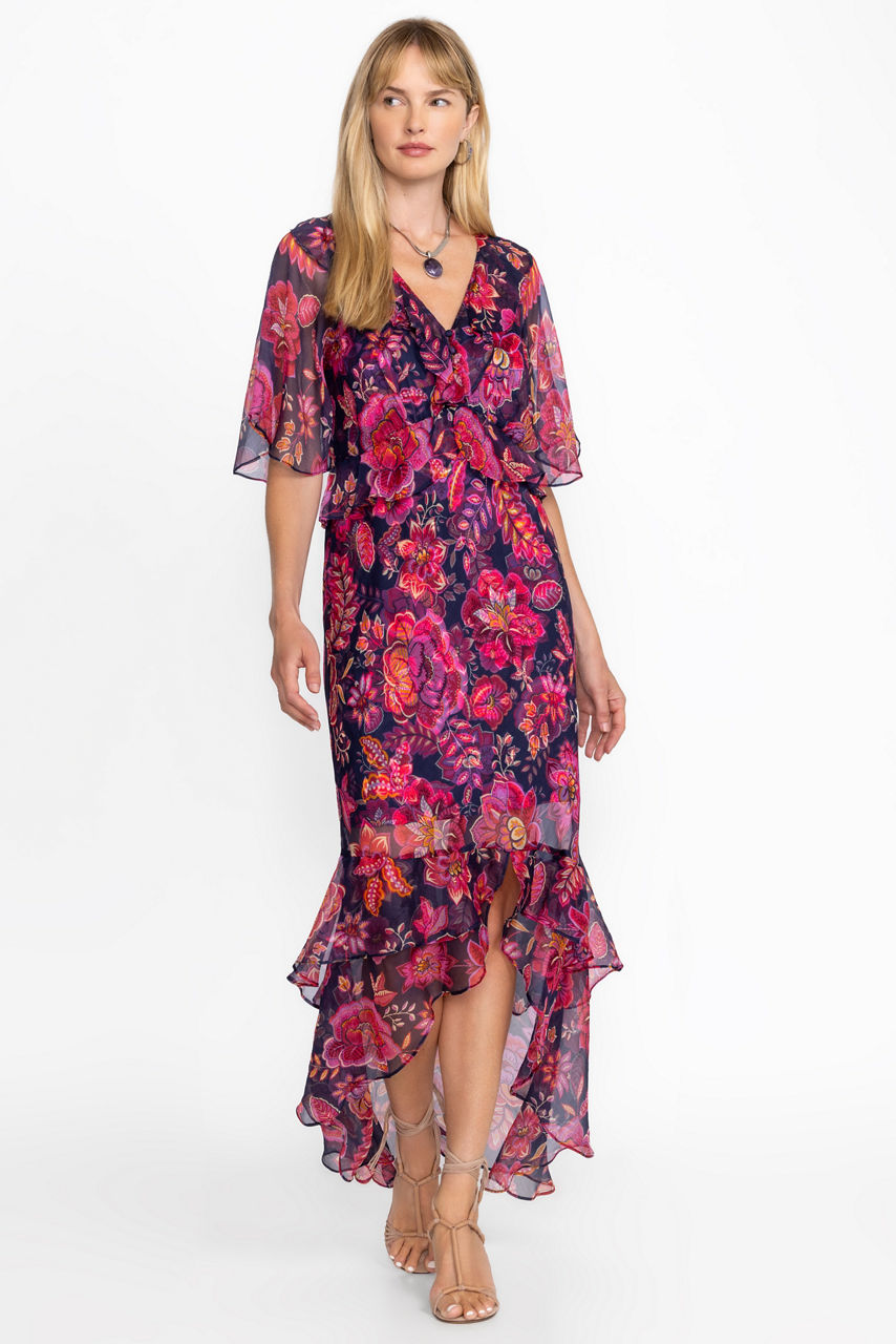 Crafted from 100% luxurious silk, the Luxee Ruffle Maxi Dress is adorned with bold floral blooms. Featuring a V-neckline and flounced sleeves, this wrap-front dress is finished with shirring at the waist and a split hemline. Pair with strappy heeled sandals and a classic clutch for a night out.