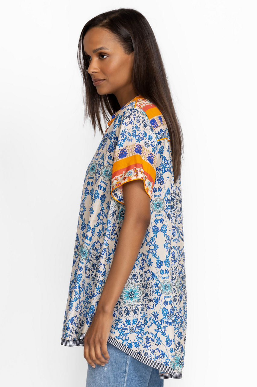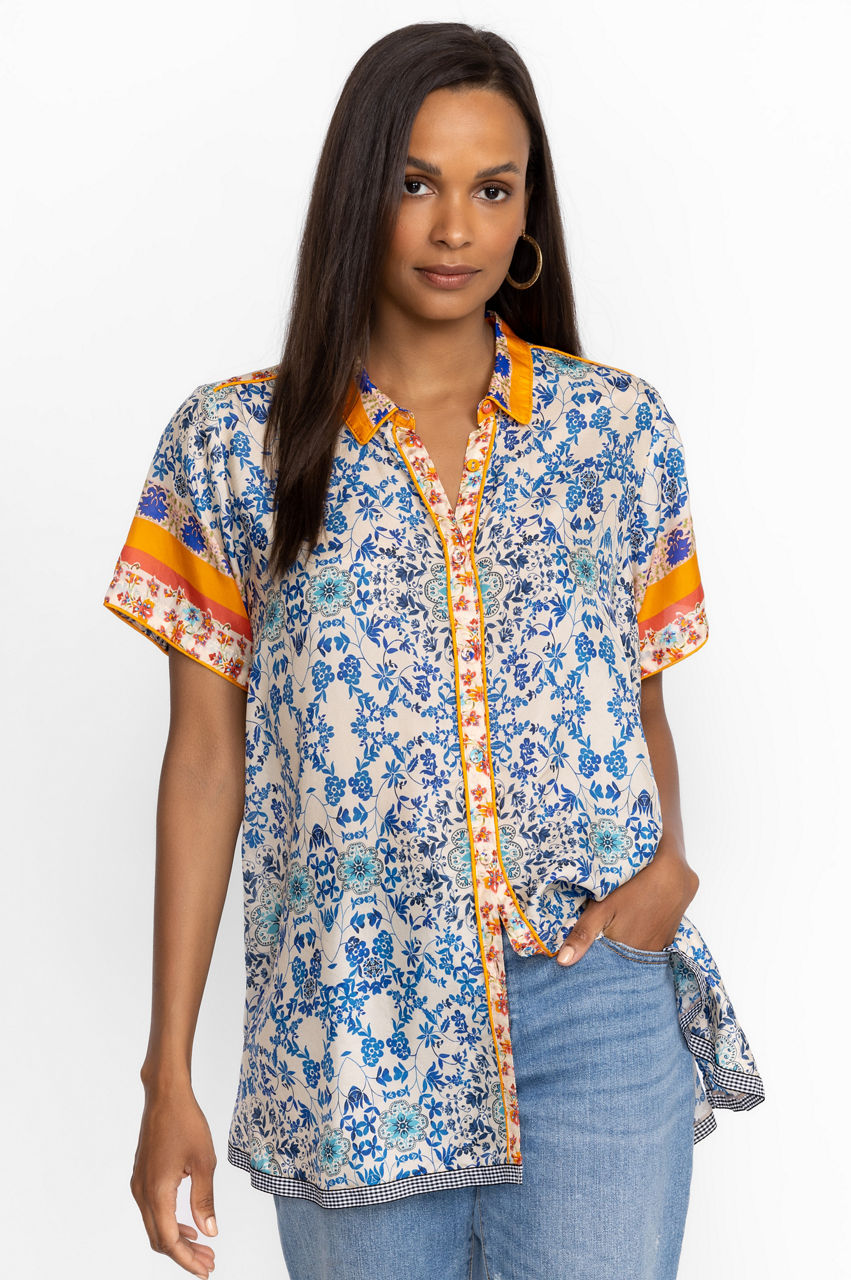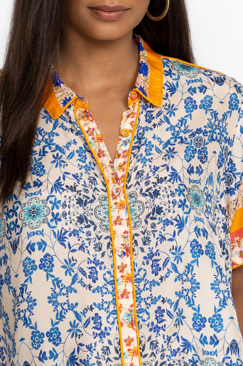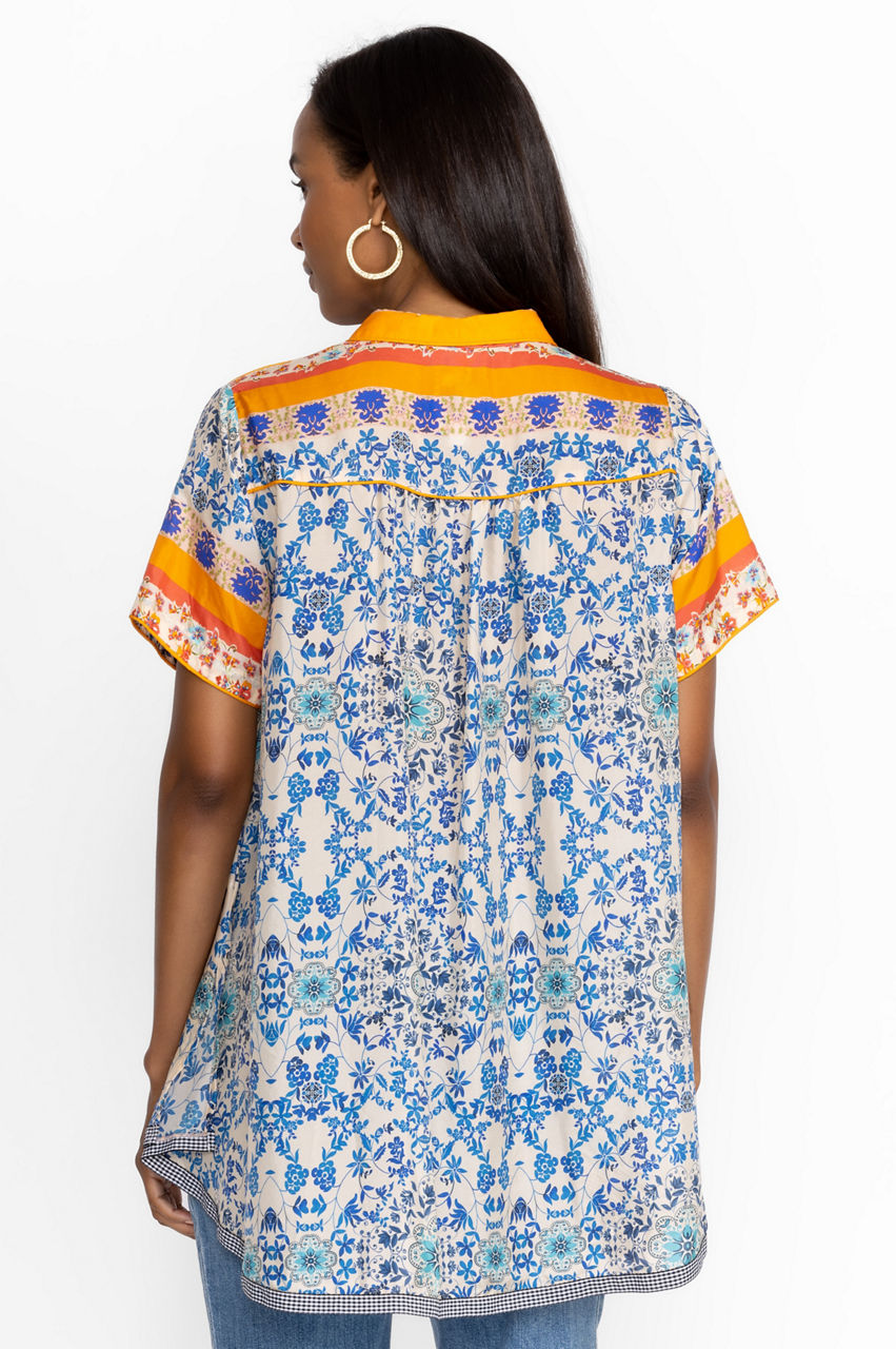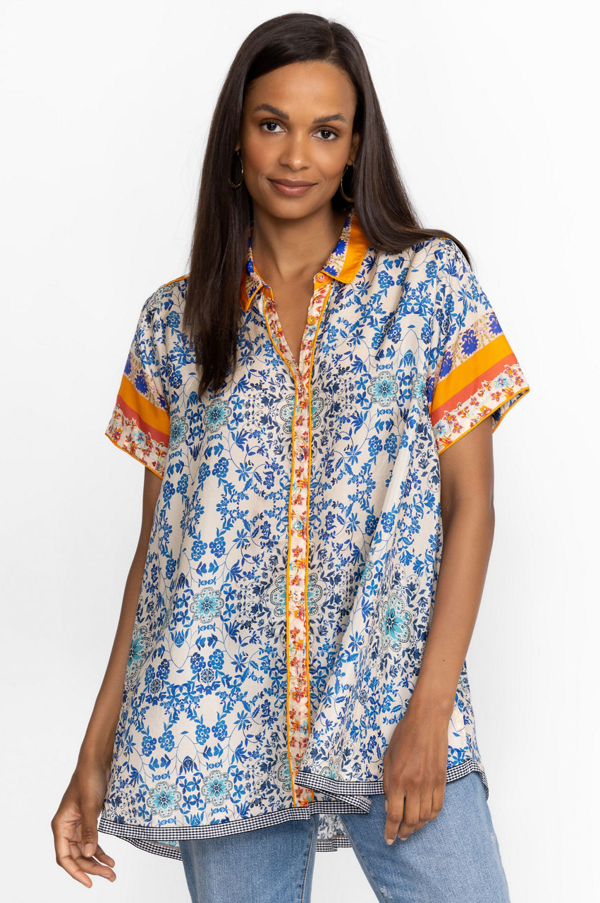Spun from lustrous silk, the Lylarae Maddie Tunic emanates a vintage charm that's unexpectedly punctuated with orange tones. A stylish yet timeless choice for sun-filled days, this tunic features a classic collar, a button front fastening, and a detailed repeated pattern in a blue and white color scheme. Layer over wide-leg pants and sign off the look with leather footwear and accessories.