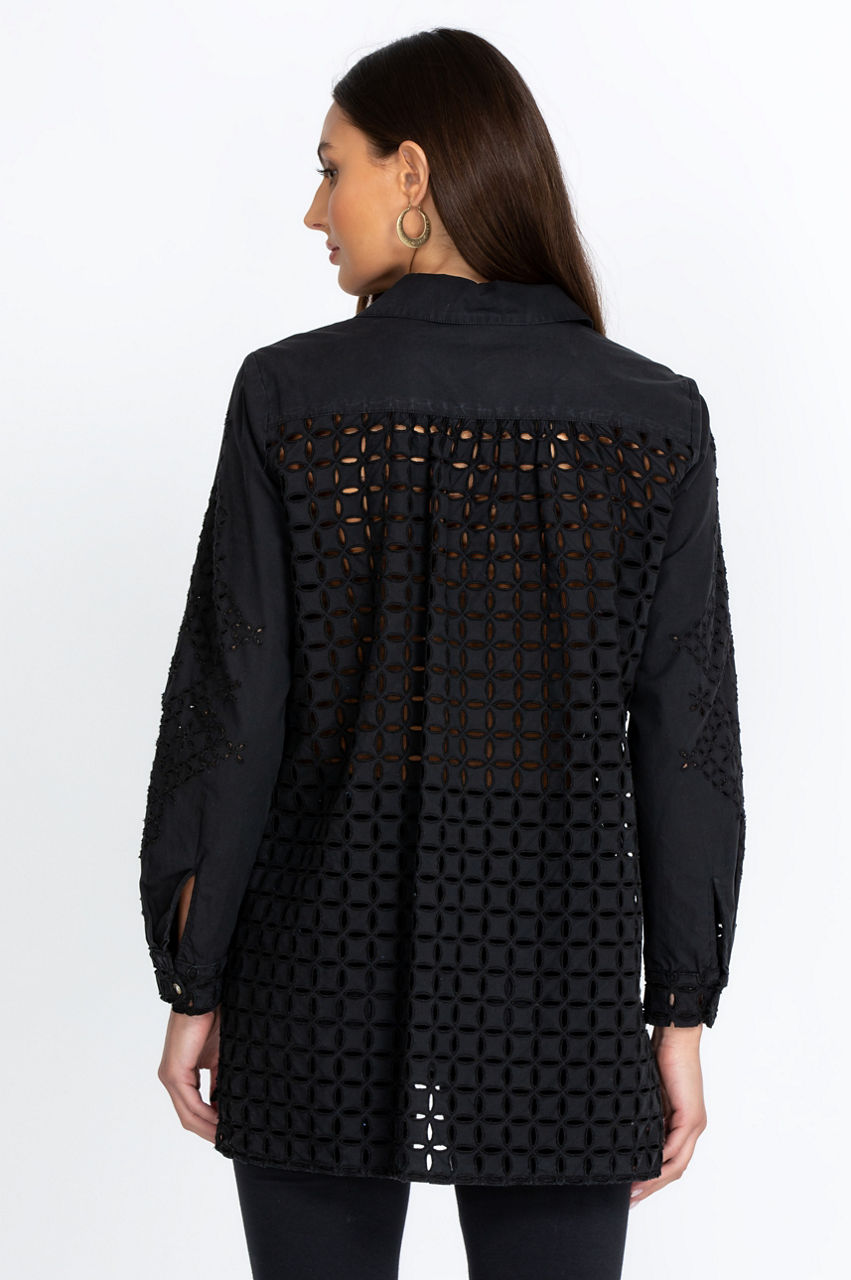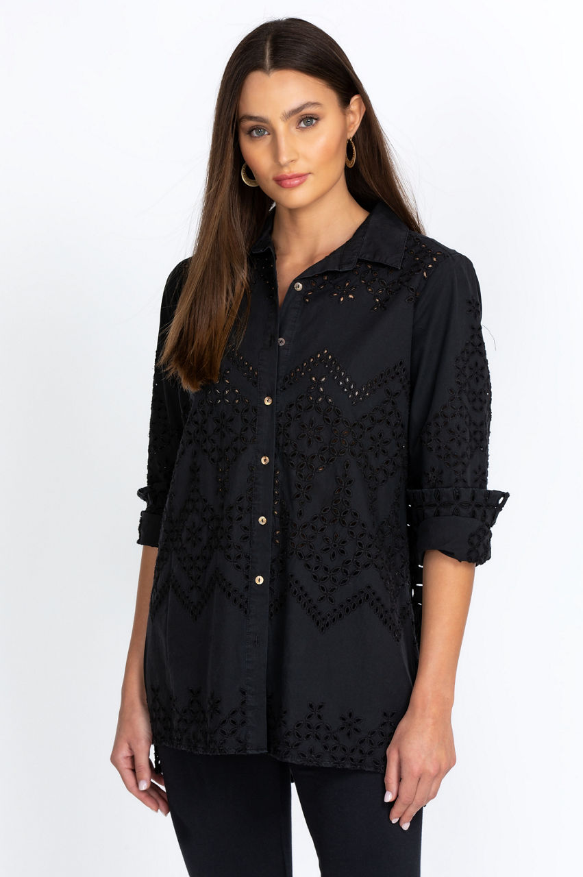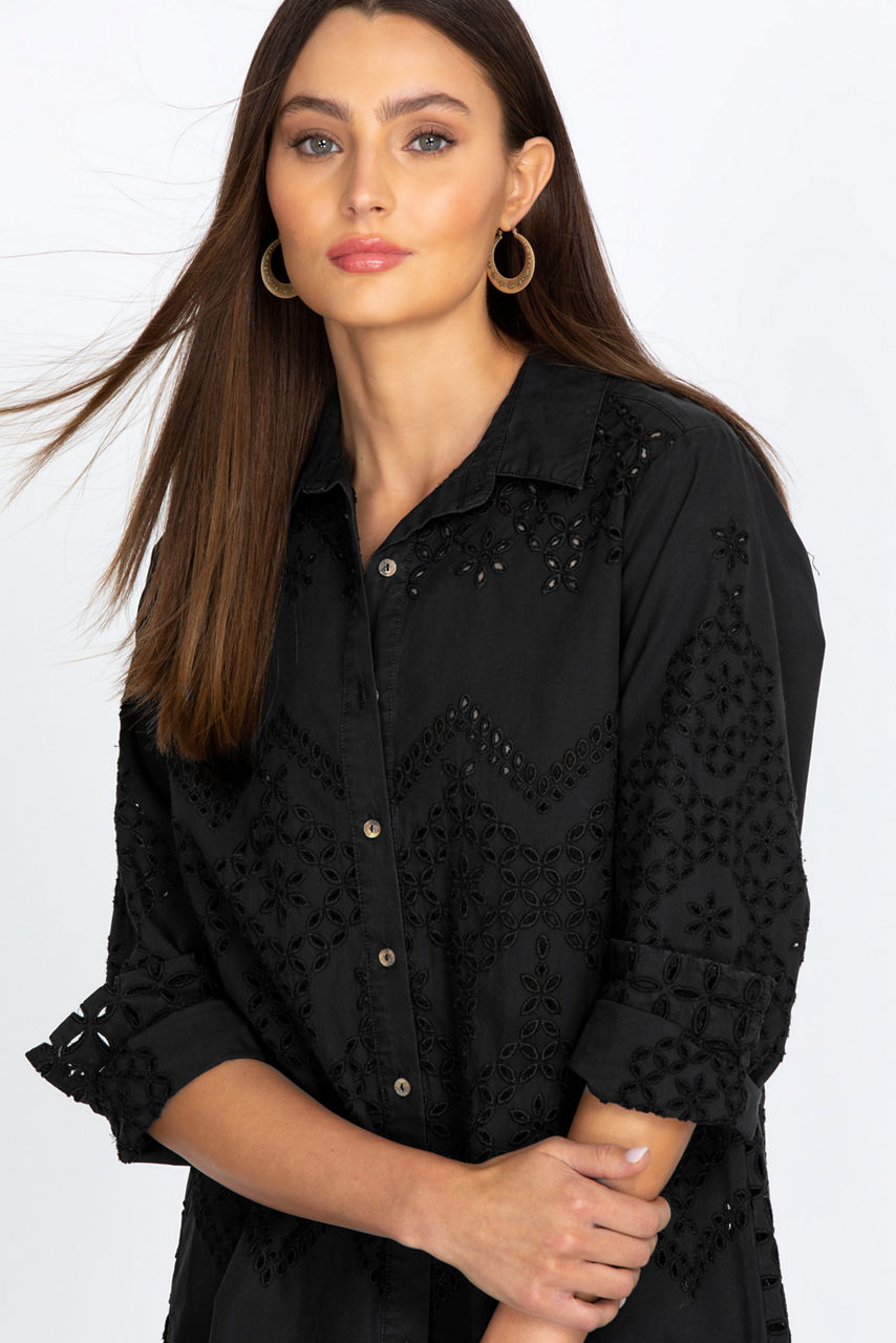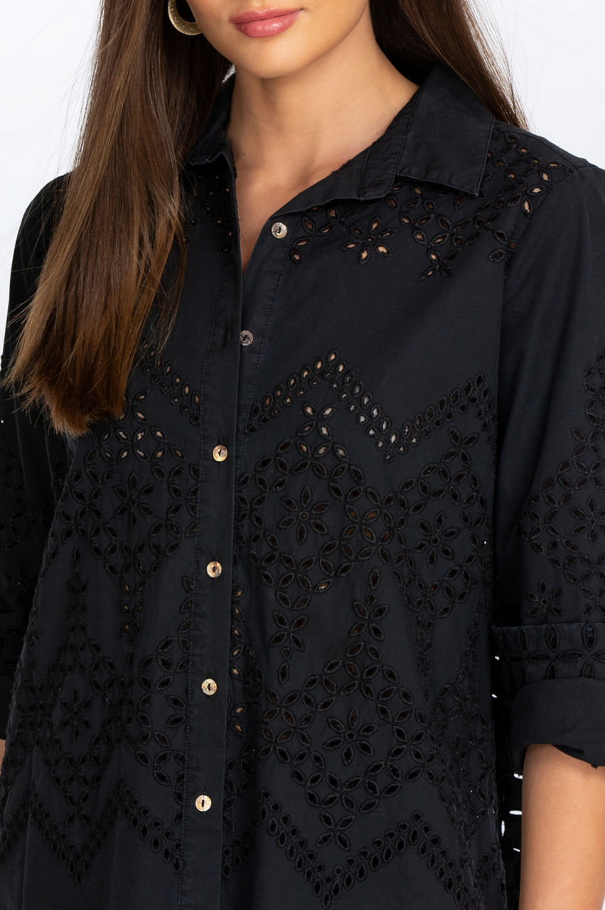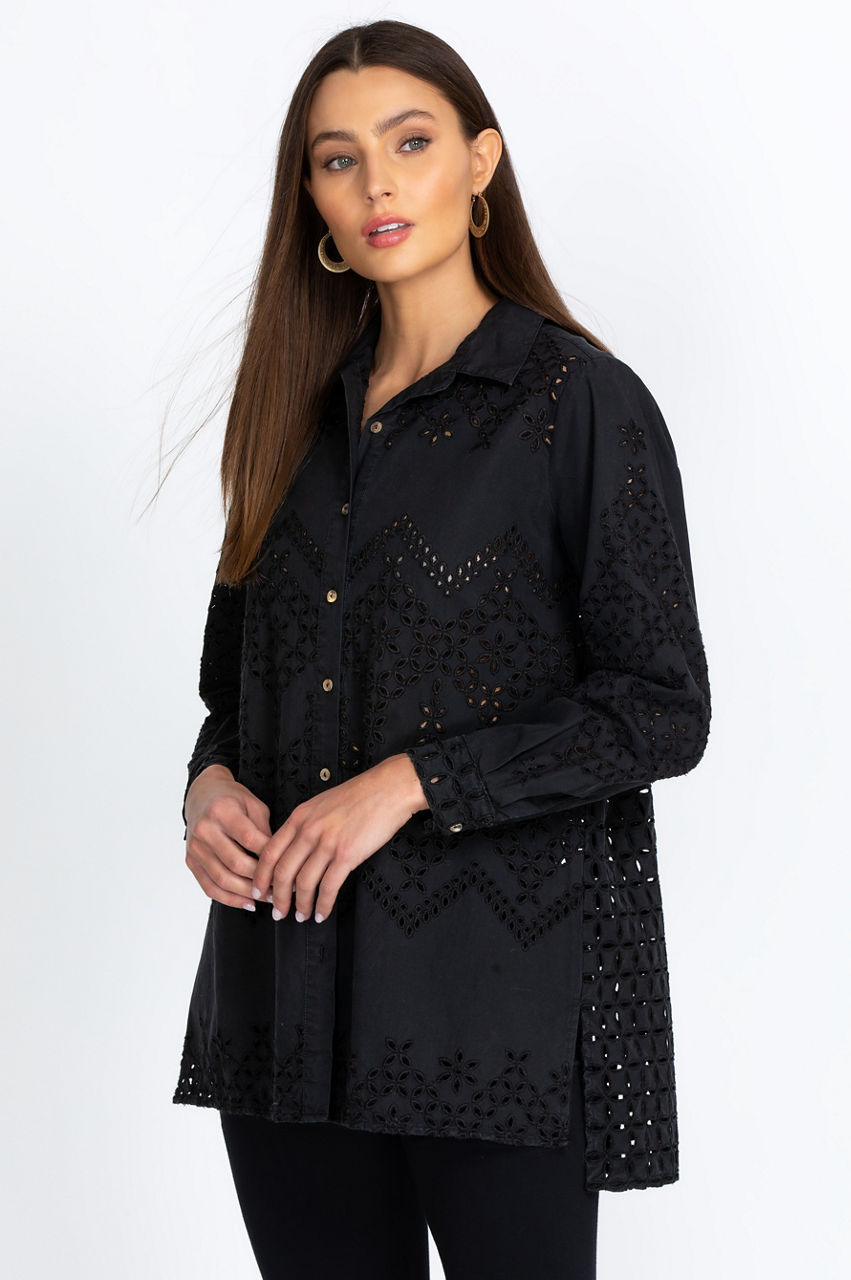 If you have searched for a practical, comfortable, and beautifully designed shirt, search no more. Our Lynx Button Down Shirt is all you have been looking for in a shirt. The shirt in is an all-over black color, with a solid, pointed collar and long, cuffed, two-button sleeves, covering the practical part of your search. It is made from fine cotton poplin, covering the comfortable part. Lovely black embroidery in a zig-zag and floral pattern makes this shirt a wardrobe staple. All elements are combined to form the beautifully-designed shirt to end your search.