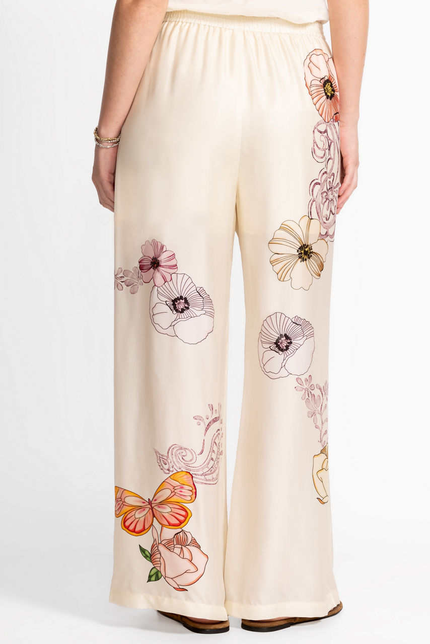 Crafted from a rich silk blend, the Lyra Easy Pants are embellished with a vibrant floral pattern featuring butterflies in flight. Designed with an elastic waist and flowing wide legs, these pants are partially lined for additional coverage. Pair with the Lucinda Button Down Shirt for a perfectly coordinated lounge look.