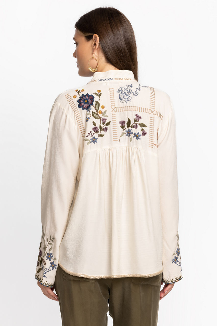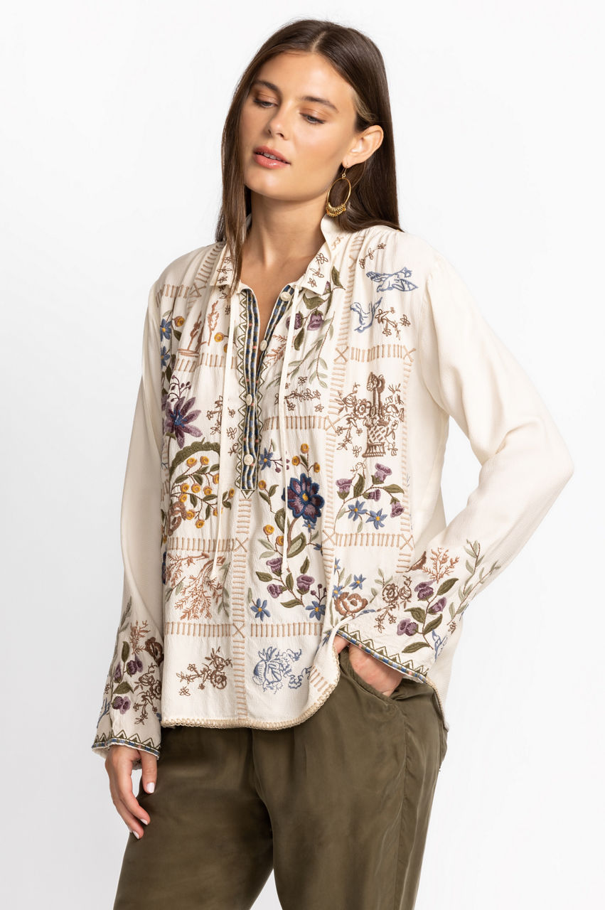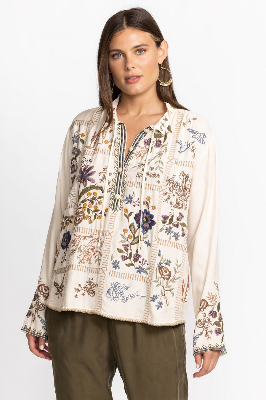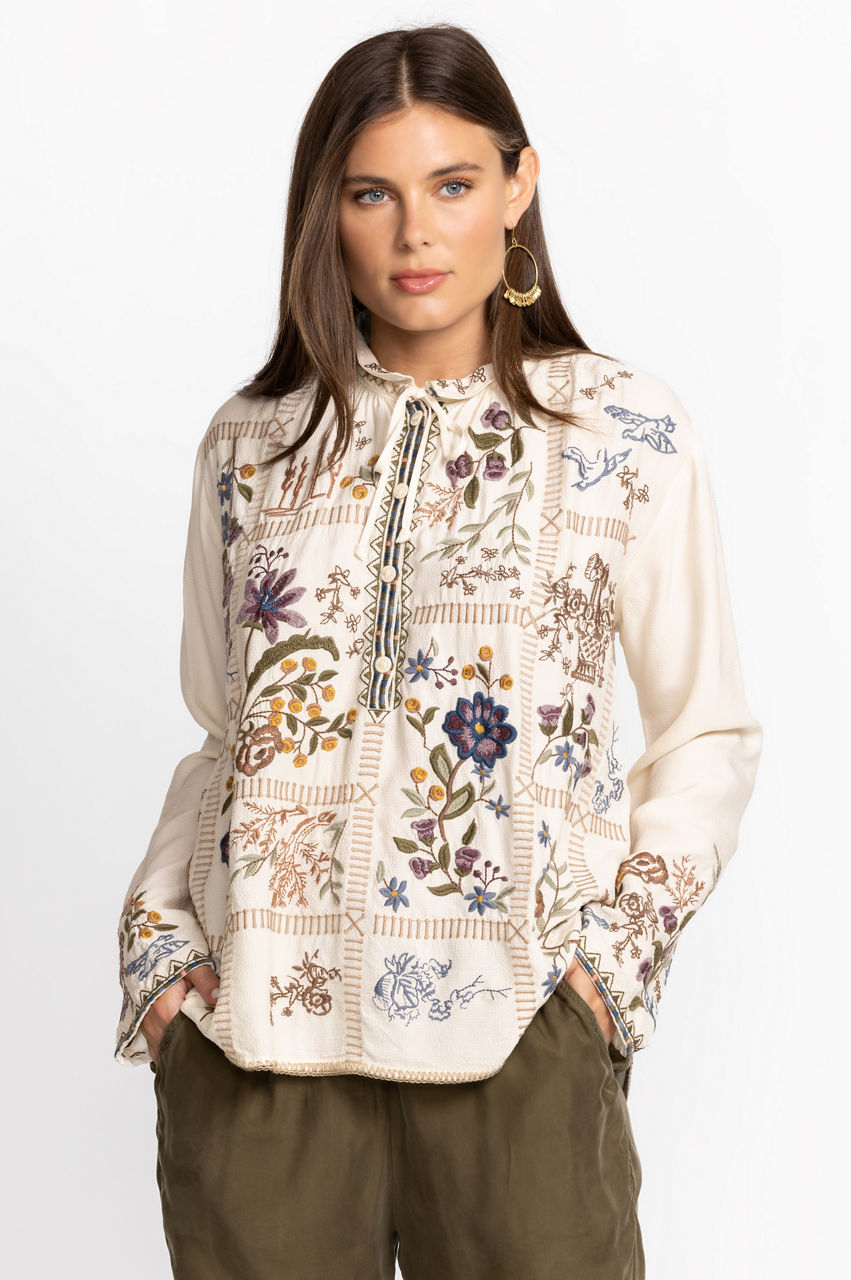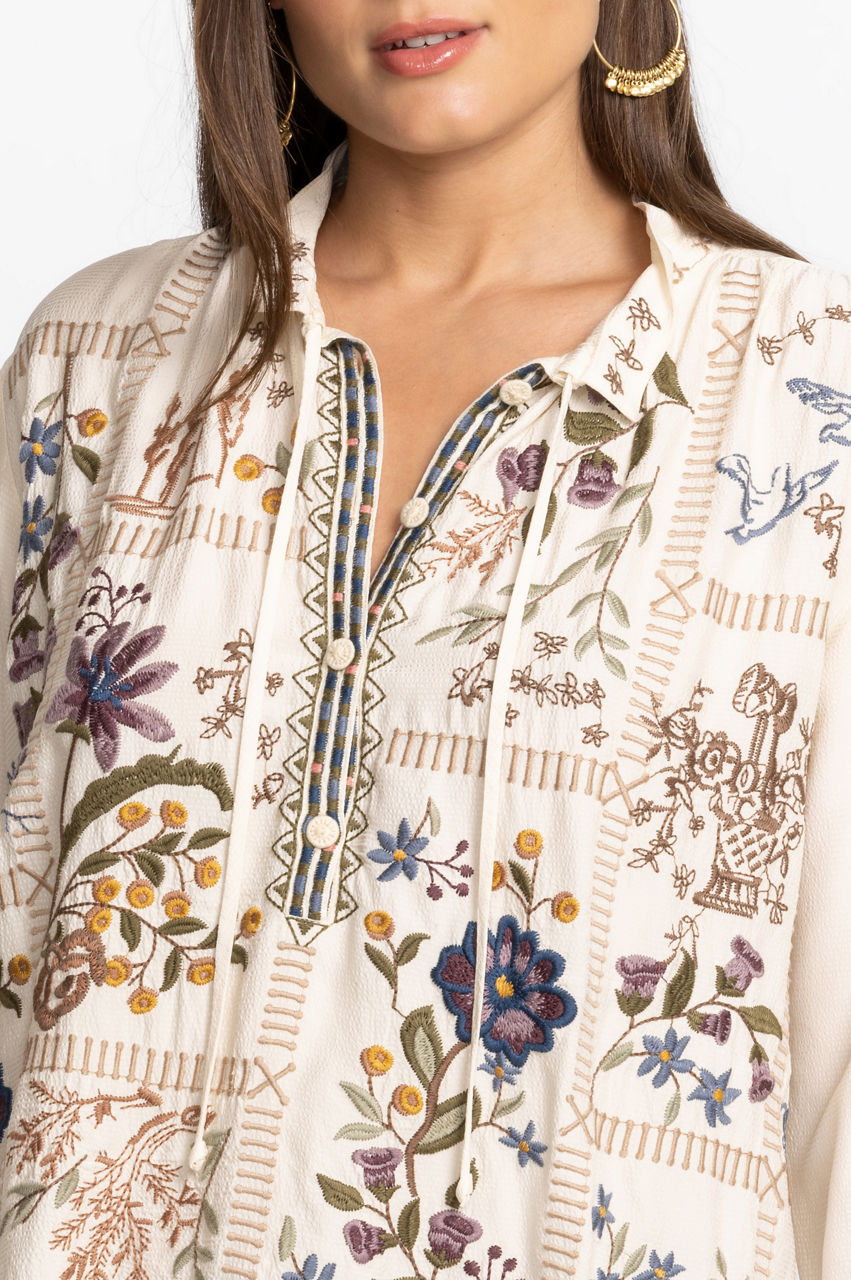 Intricately detailed with stunning placement embroidery, the Mabel Blouse is the perfect finishing touch for casual wardrobe perfection. Featuring a delicate tie at the neckline and a flowing tunic silhouette this blouse is made for breezy days. Pair with linen pants and leather sandals for a complete weekend look.