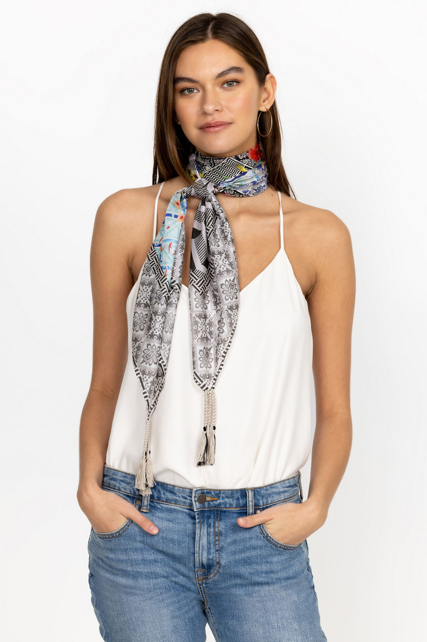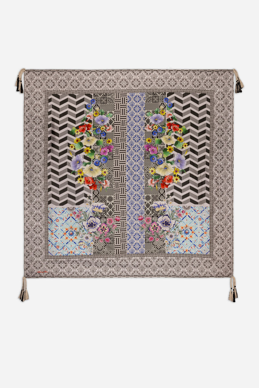 An optical delight, the Madrigal Scarf is a striking fusion of graphic-inspired patterns and romantic florals. This multicolored scarf is spun from pure silk and features a patterned border and a mix of rich blooms and a monochromatic design. Tie around your neck or style as a headscarf for a glamorous look.