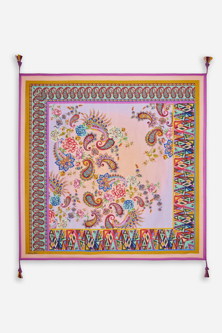 Crafted from 100% sumptuous silk, the Magaly Silk Scarf adds a splash of color and hint of elegance to any look. Embellished with a vibrant paisley design against a backdrop of pink and purple hues, this flowing scarf is finished with decorative tassels at the edges. Wear tied loosely at the neck or add to the handle of a posh handbag for a colorful accessory.