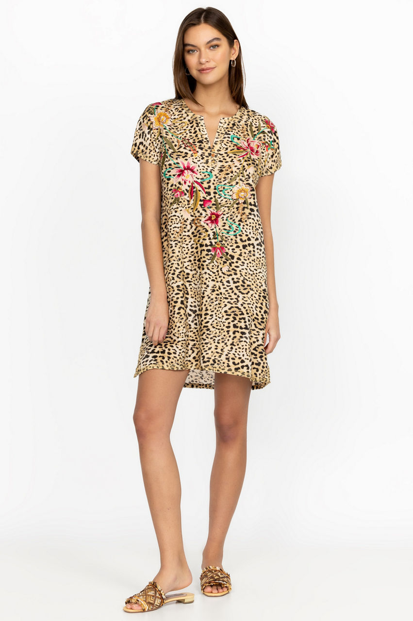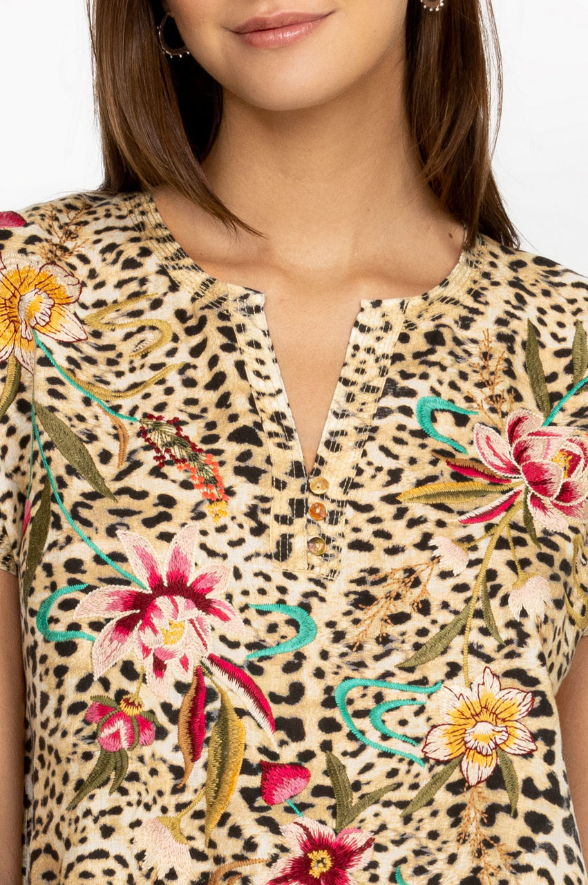 A colorful slip-on-and-go design, the Maisie Easy Button Tunic Dress is a versatile choice for sun-drenched vacations and lazy summer afternoons. This tunic dress is crafted from pure, breathable linen and boasts a round neck with a button closure, short sleeves, and beautiful tropical blooms in the form of an intricate placement embroidery. Wear around the home or pair with a tote for a beach-ready look.