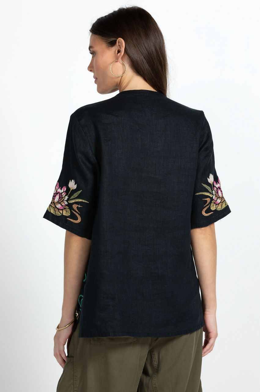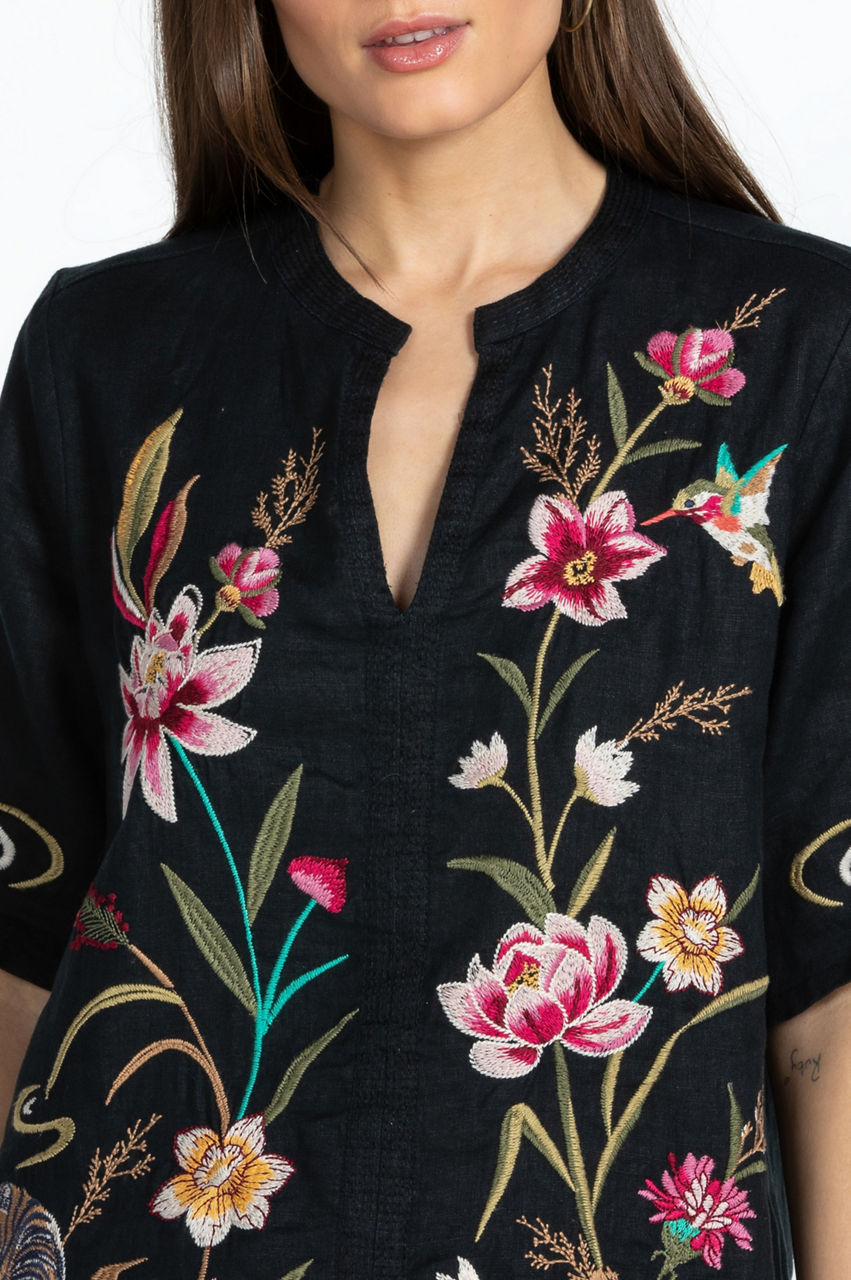 Emanating laid-back elegance, the Maisie Easy V-Neck Top is a stylish choice for sun-filled days and tropical escapes. This top is crafted from linen - a practical fabric for warmer weather - and features a V-neck, short sleeves, a tropical floral placement embroidery, and a relaxed construction. Pair with wide-leg pants for a nonchalant approach to daytime dressing.