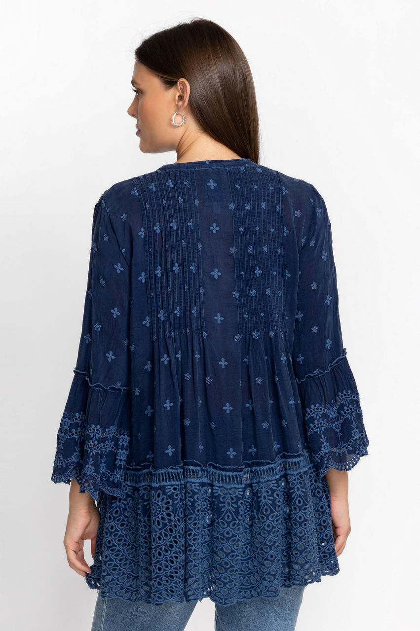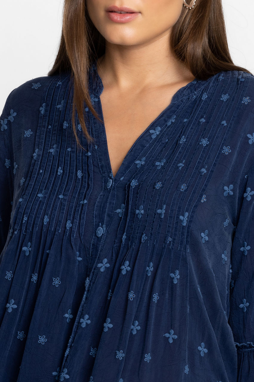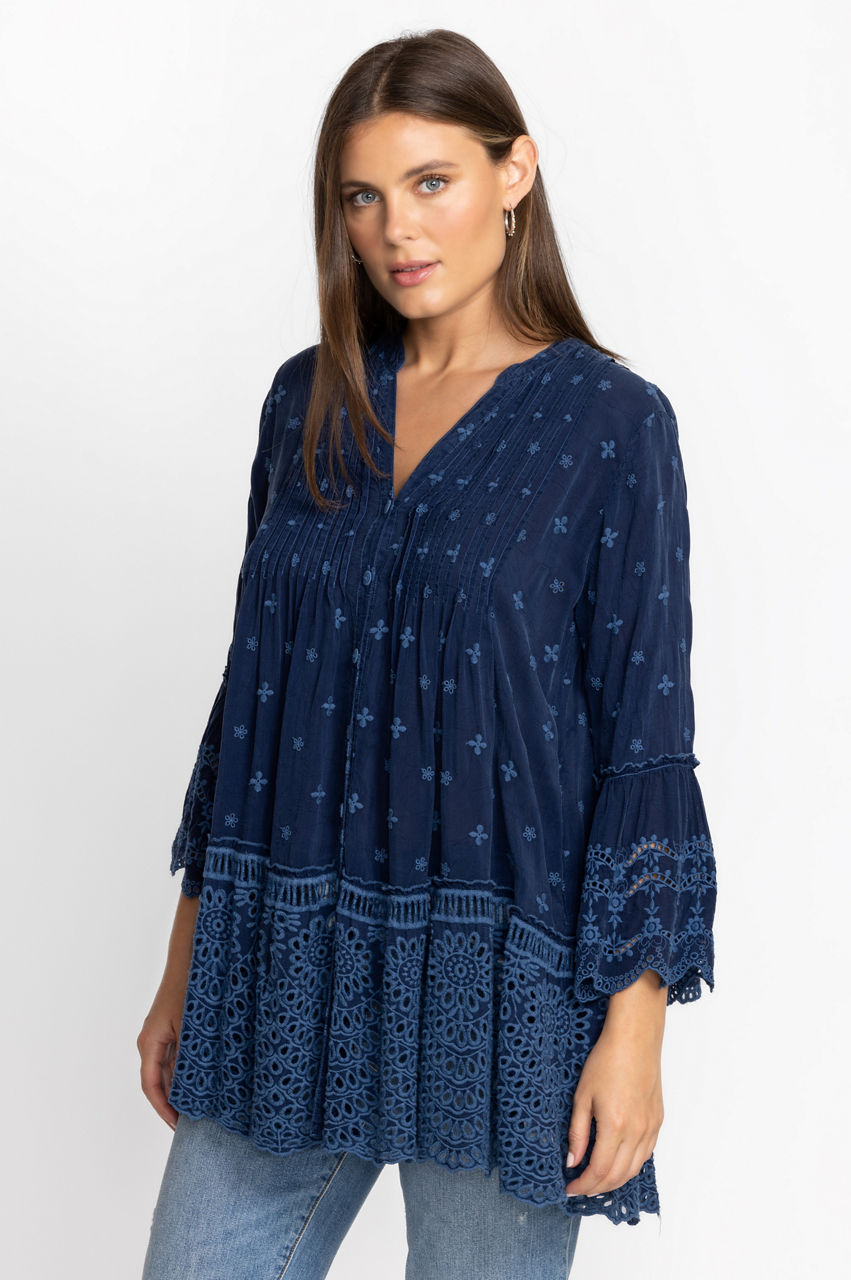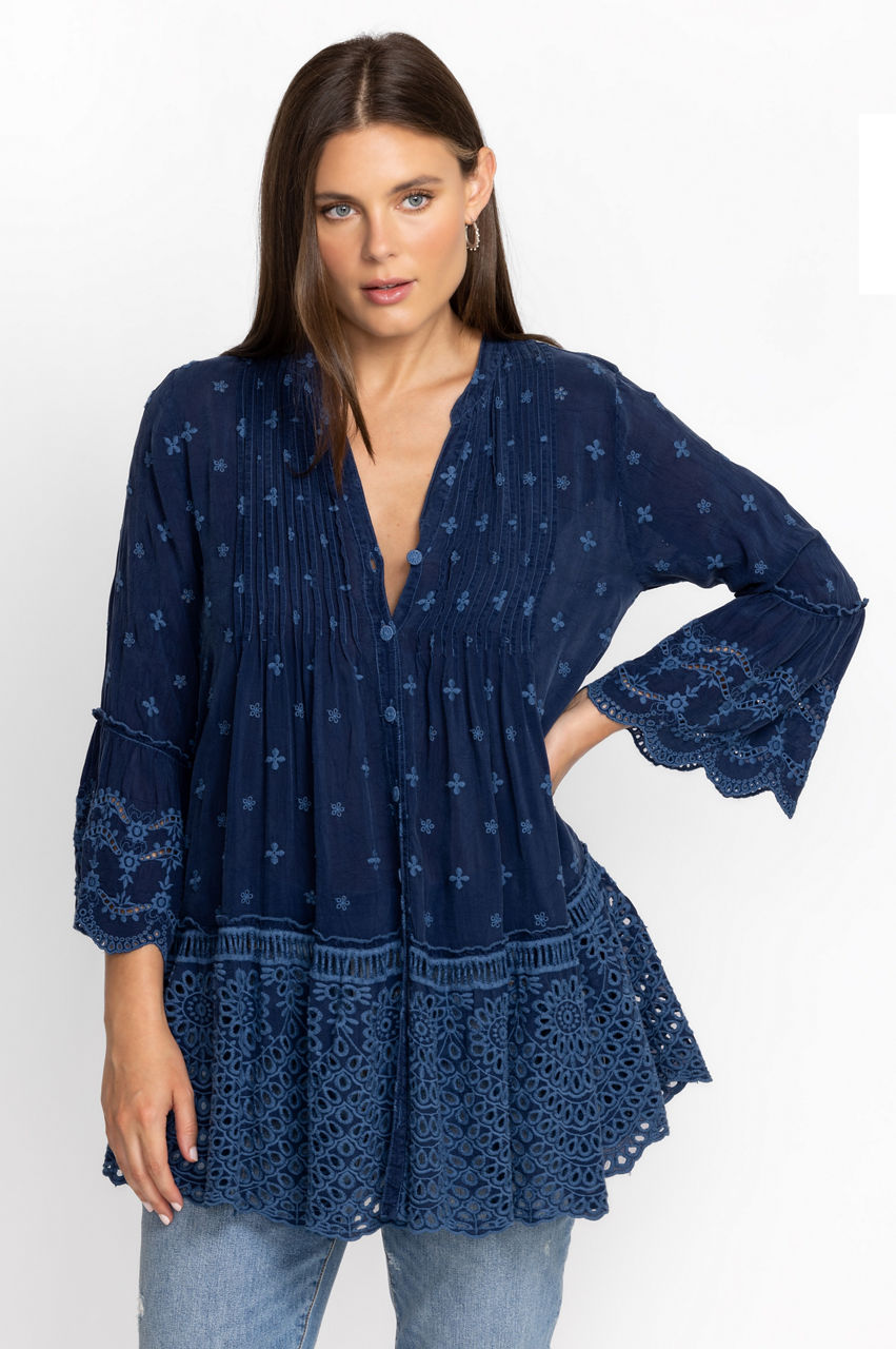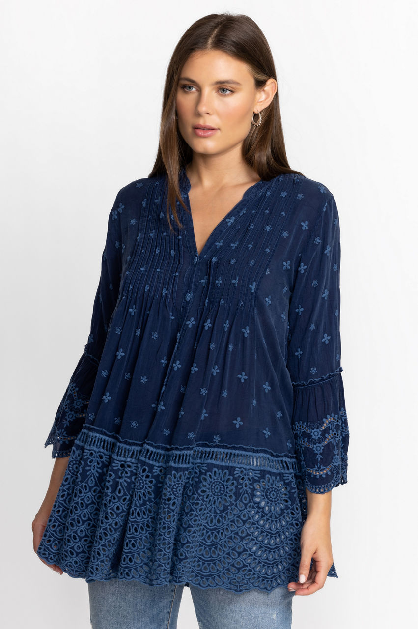 Delivering a delightfully fresh take on casual shirting, the Manchengo Tunic provides a feminine silhouette and intricate detailing to this button front blouse. This top features a unique embroidered scalloped trim at both the sleeve and hemline providing a delicate air of femininity. Pair with cigarette pants and leather flats for a brunch-ready outfit.