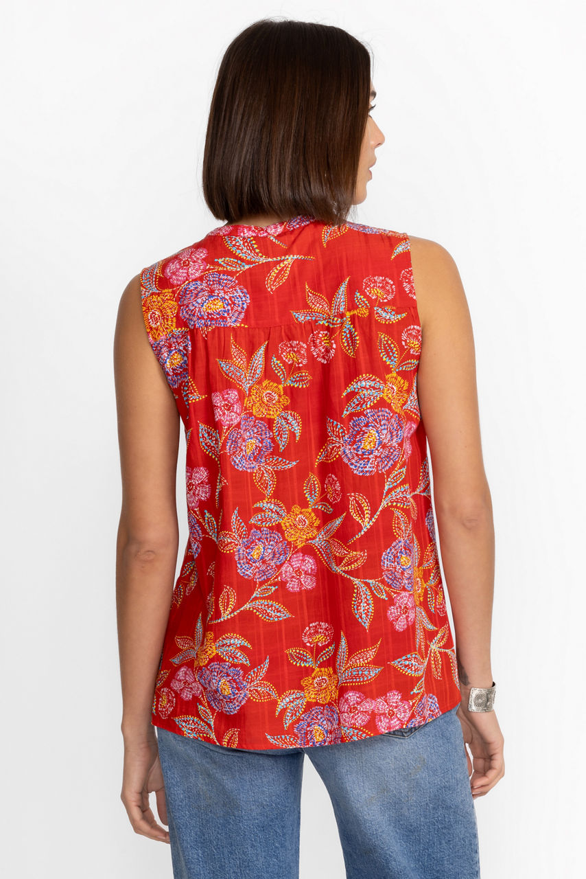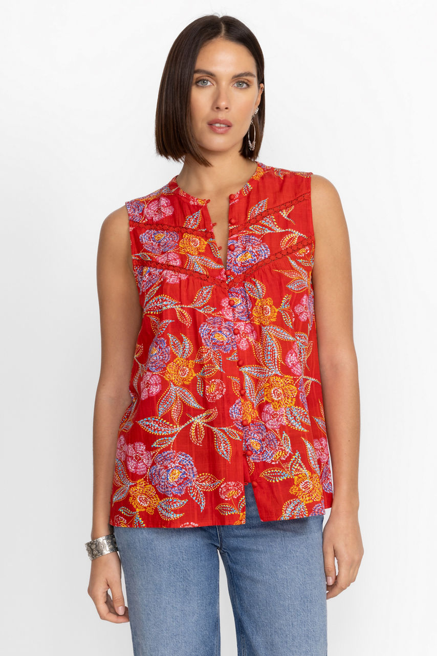 Crafted from a lightweight fabric with plenty of stretch, the Whimsical Hibiscus Mandarin Tank is perfect for a midday walk or running errands. Featuring fabric covered buttons lining the front center, this top is adorned in a vibrant floral print. Pair with dark blue jeans to highlight this colorful top.