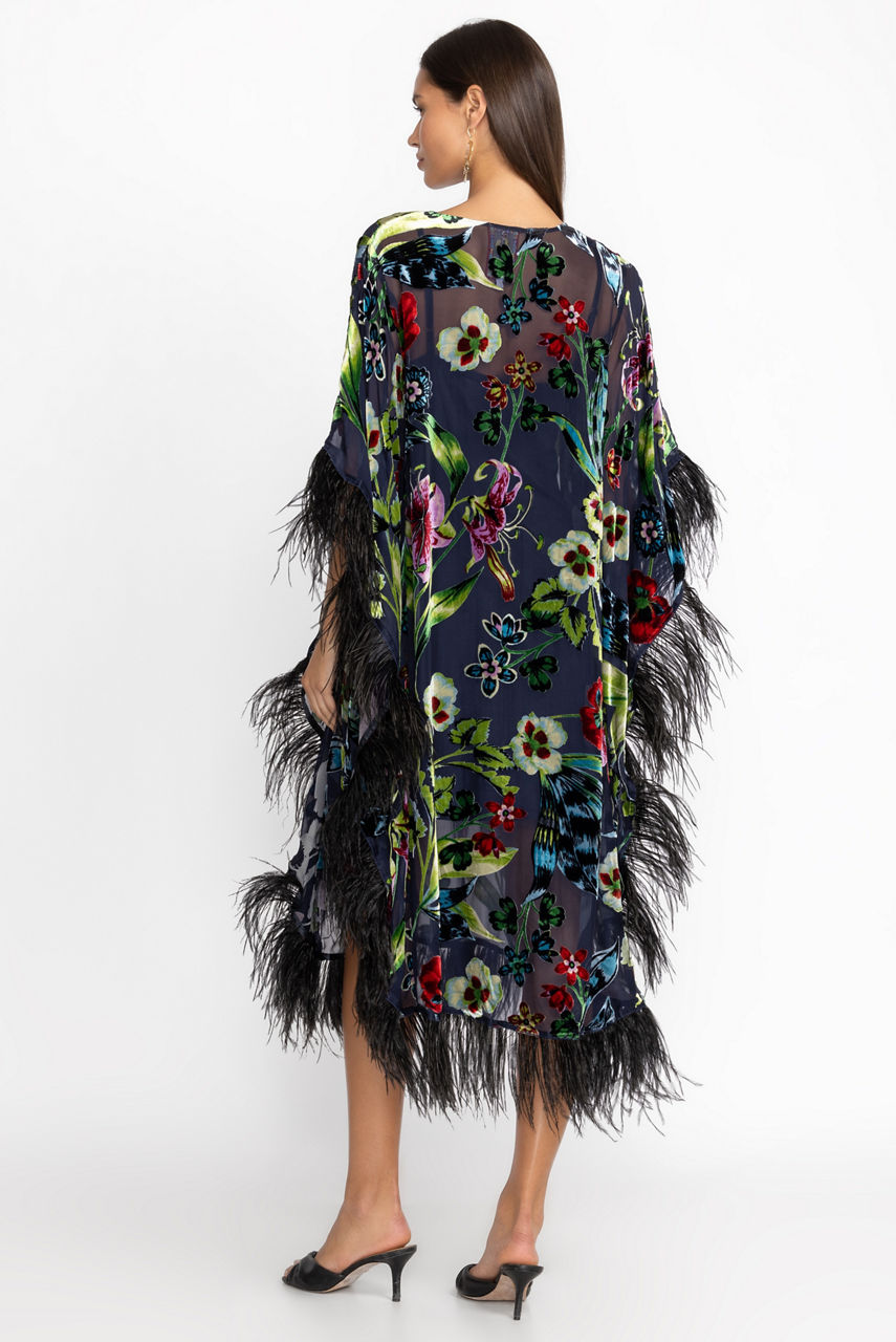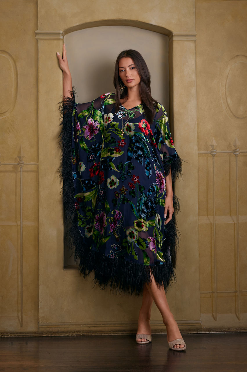 Transcending traditional lounge wear, the Maple Dress exudes an aura of refinement. Artfully fashioned from a sumptuous silk blend fabric and meticulously adorned with feathers, this flowing dress serves as a testament to elegance. Whether you're unwinding on a serene lanai or basking by a crackling fire, drape yourself in this fashionable gown for a hint of subtle sophistication.