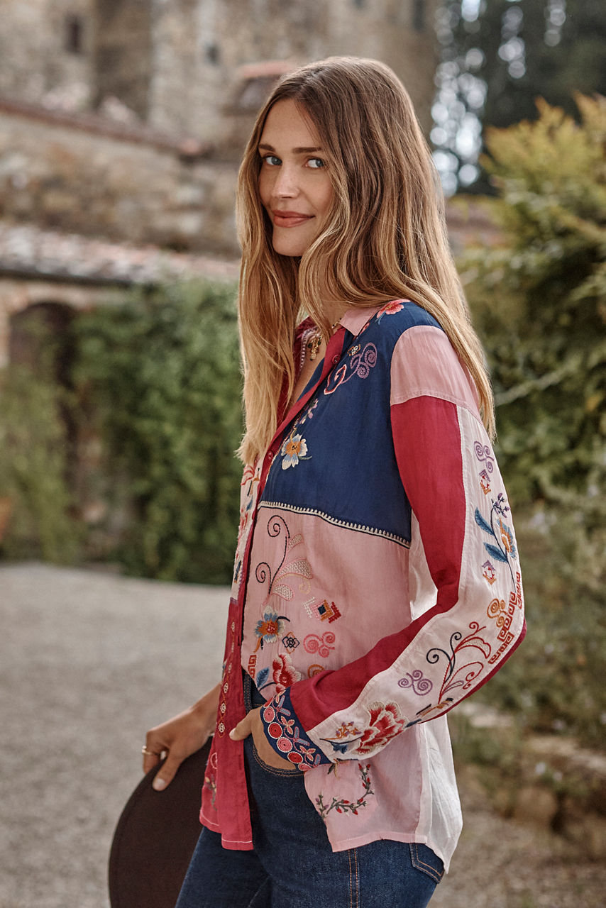 Crafted from a lightweight breathable fabric, the Marcia Color Block Shirt is adorned with rich color and a vibrant floral pattern. Featuring a classic collared button-front and a bold patchwork of color, this unique shirt is finished with intricate embroidered detailing. Pair with classic trousers and loafers for a modern work look.