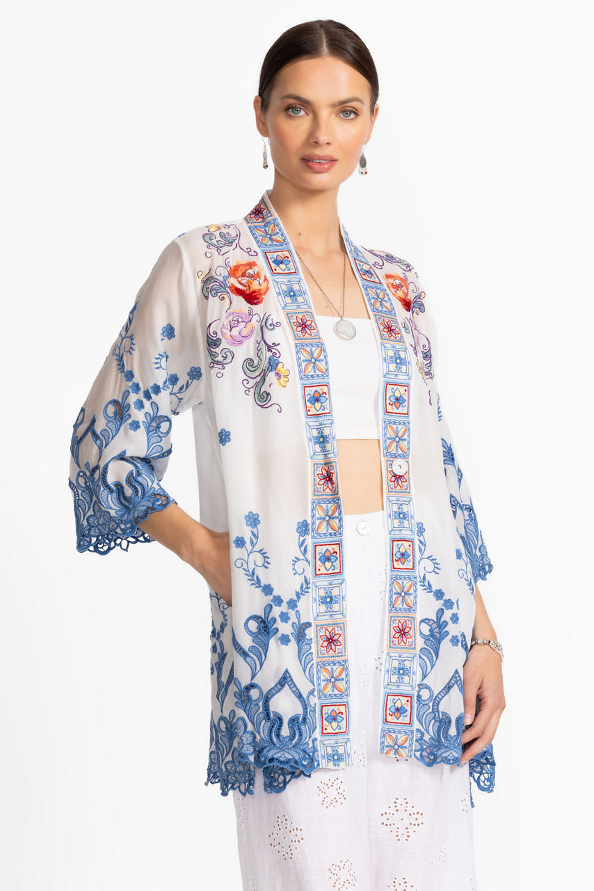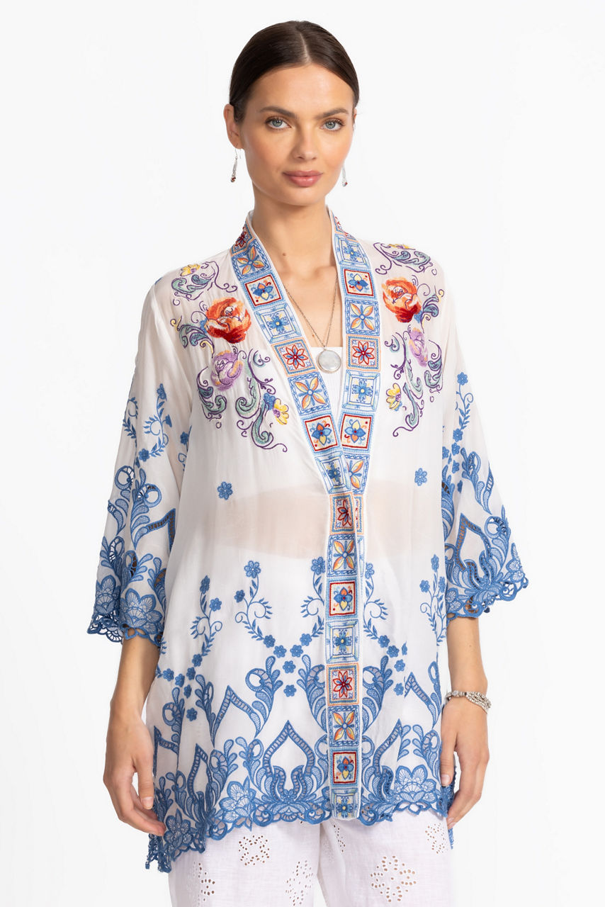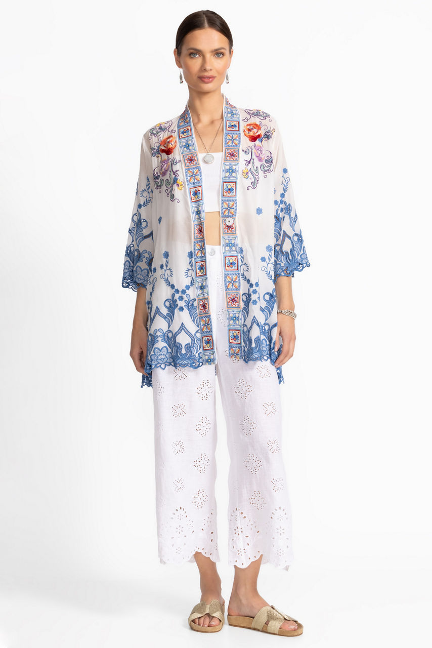 Crafted from a lightweight flowing fabric, the Marcia Kimono is intricately embroidered with a vibrant floral pattern. Featuring an open front and 3/4 kimono sleeves, this layering piece offers scalloped eyelet edges at the sleeves and hemline. Layer over a relaxed-fit jumpsuit and pair with platform sandals for an eclectic casual ensemble.