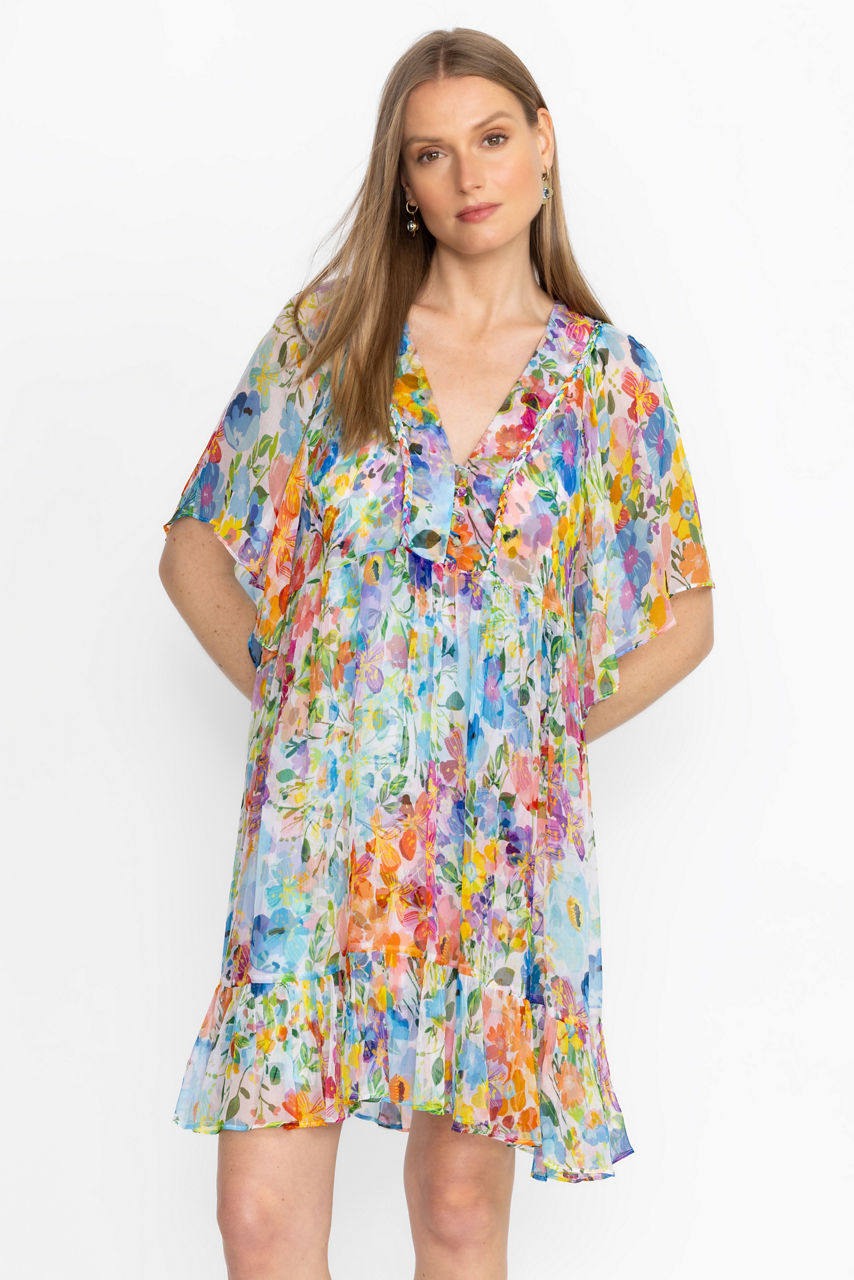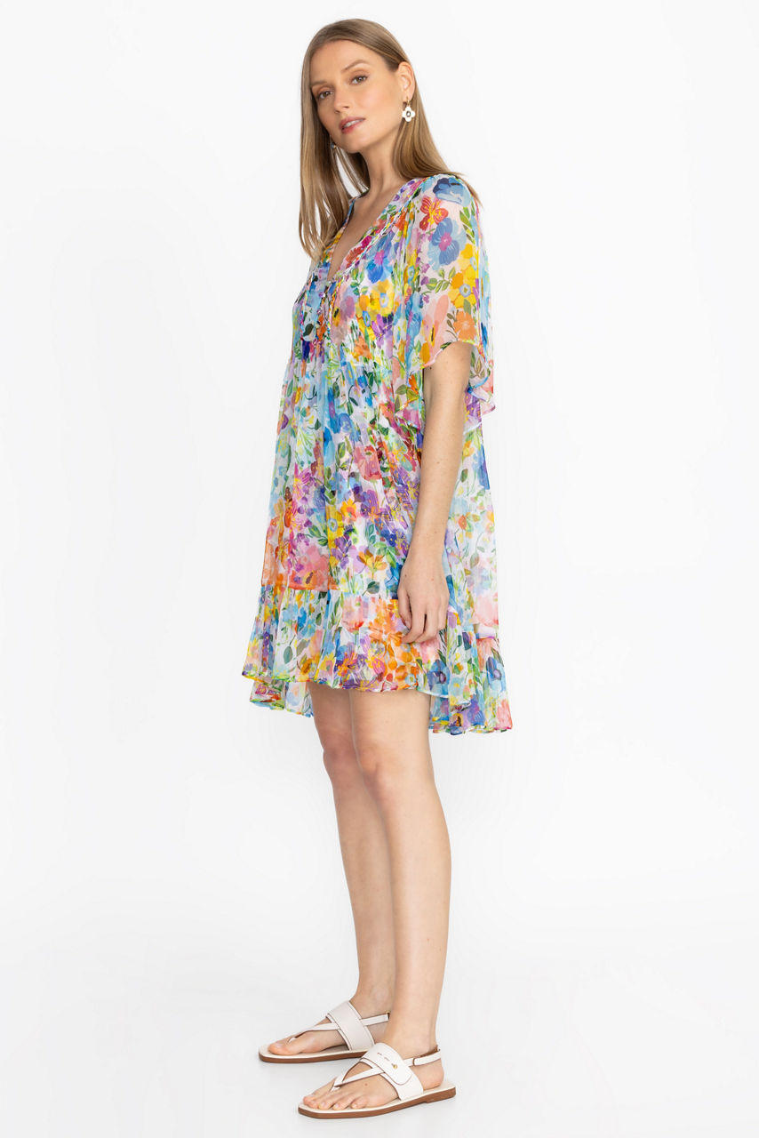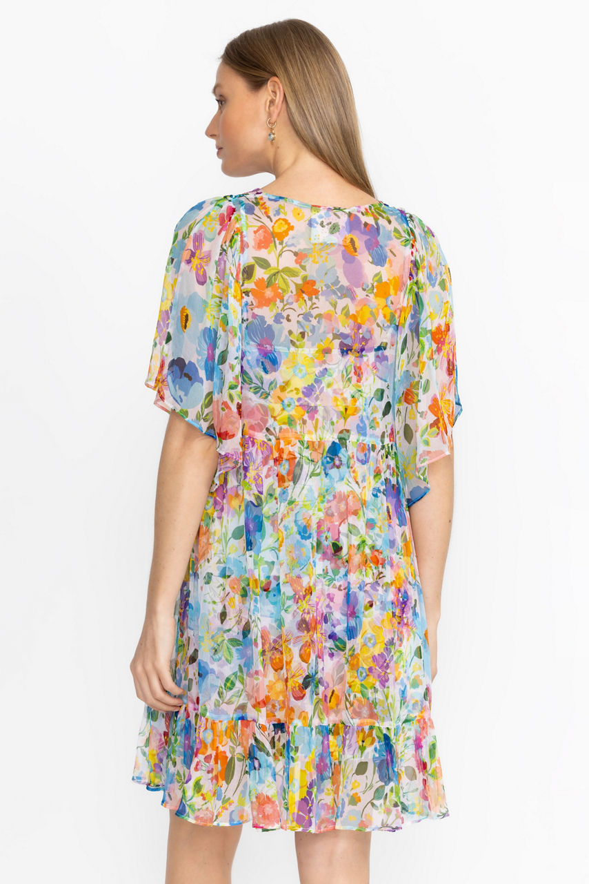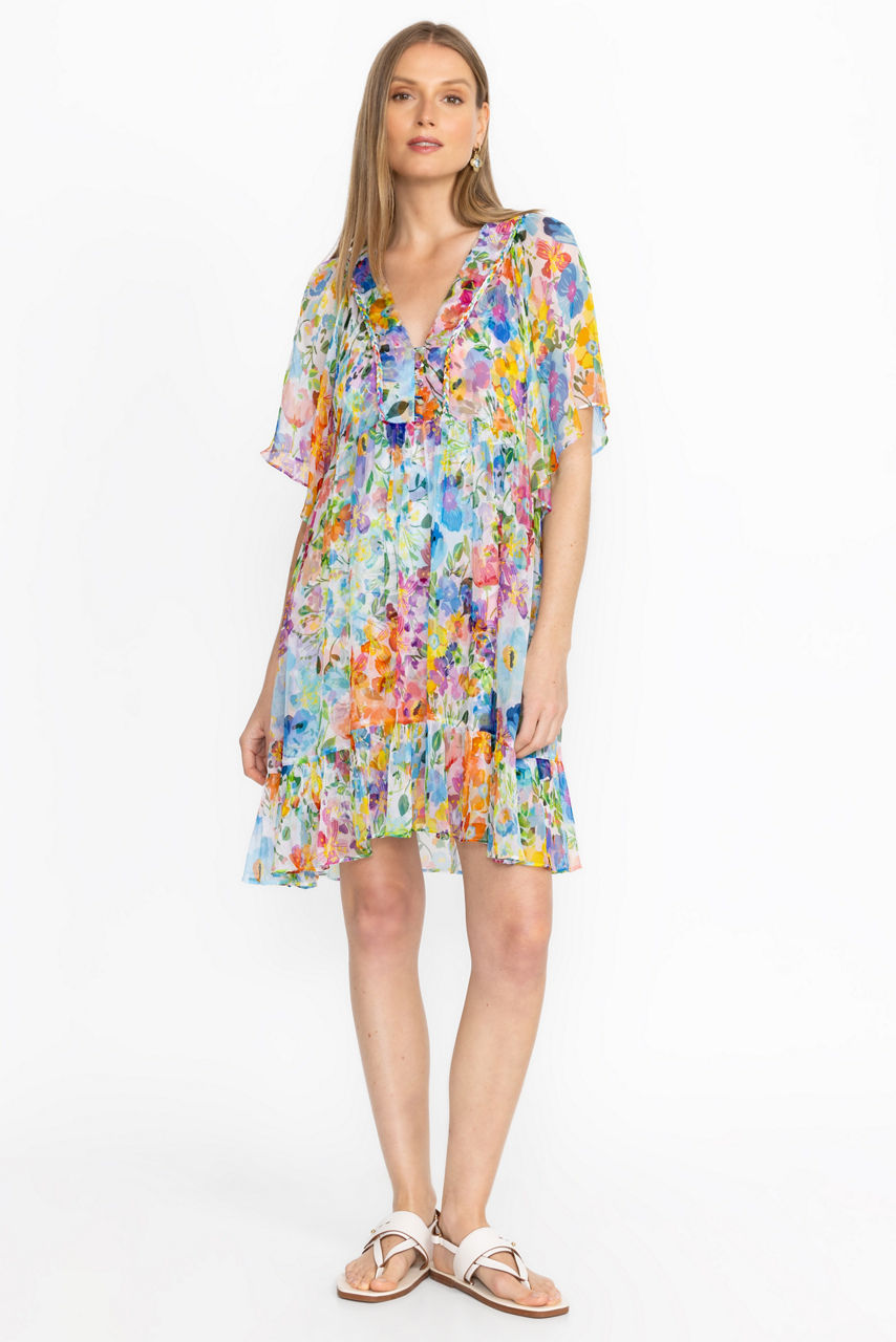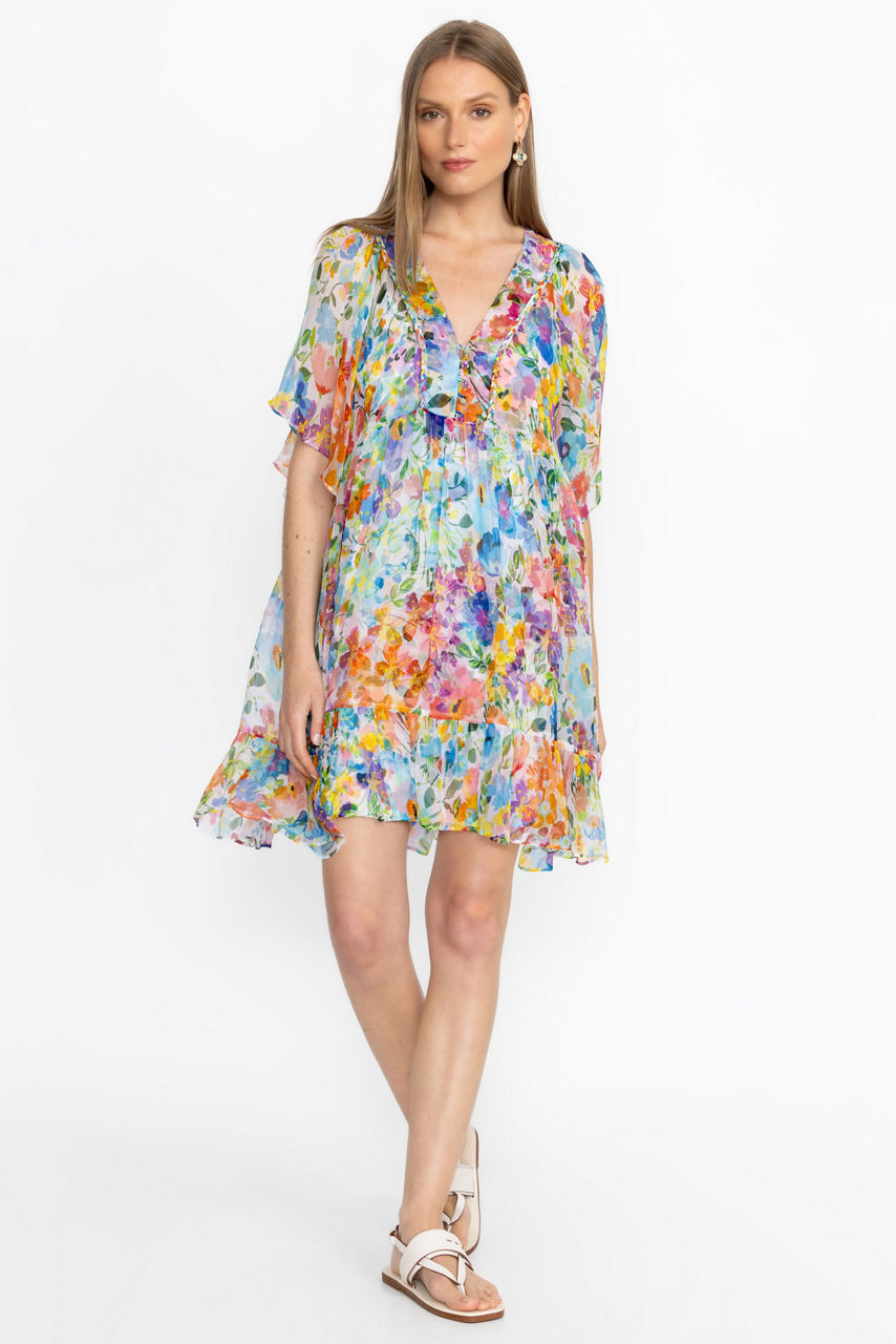 Crafted from 100% flowing silk, the Margareta Mini Dress offers a bold display of floral color. Featuring a V-neckline with a loop and button closure and gathered sleeves, this slip-lined dress is finished with a breezy tiered skirt. Pair with strappy sandals and a leather clutch for an elegant daytime event.