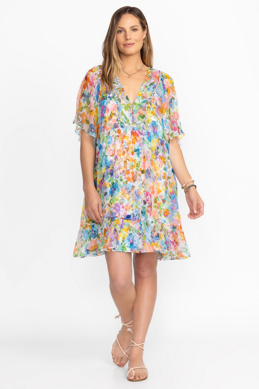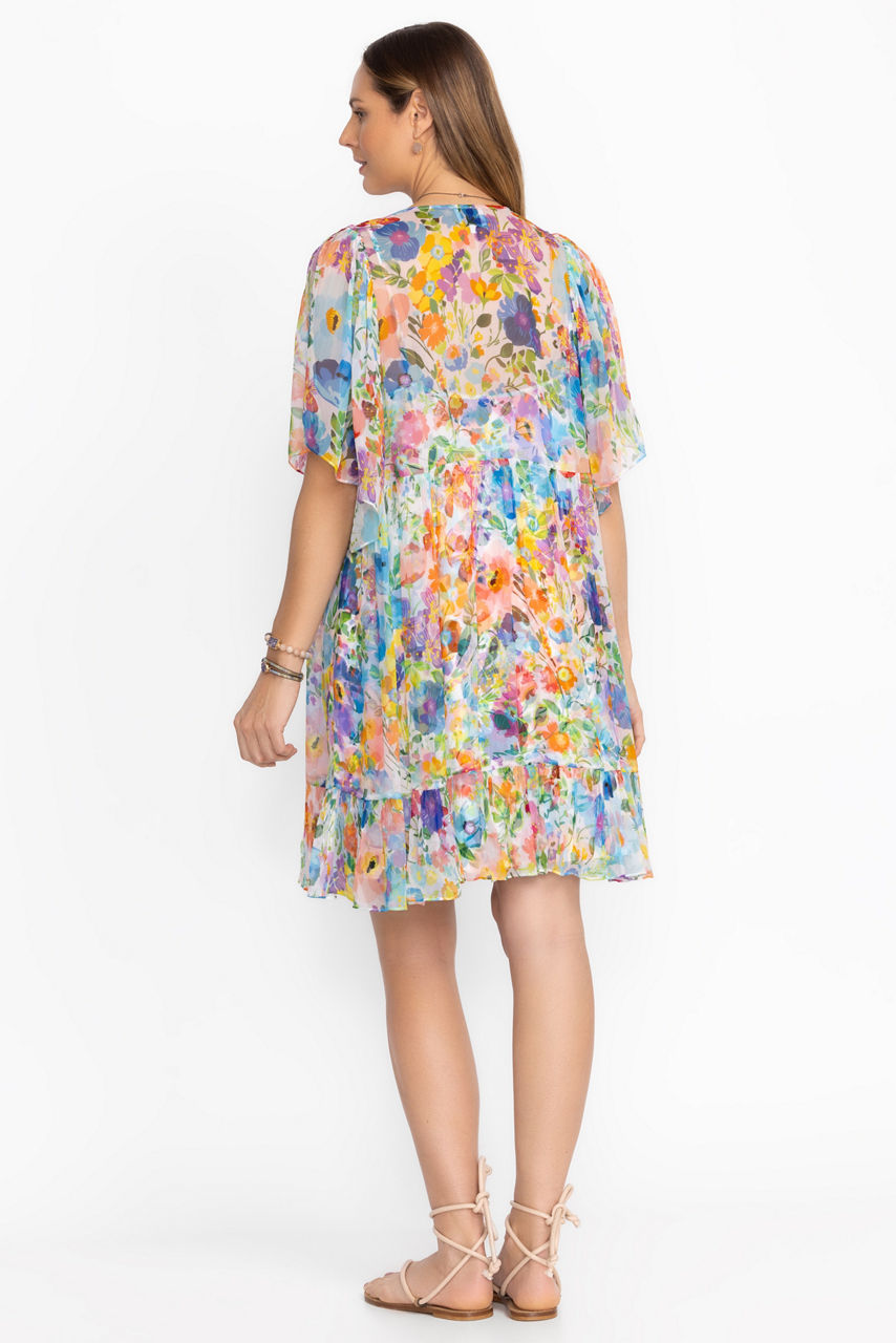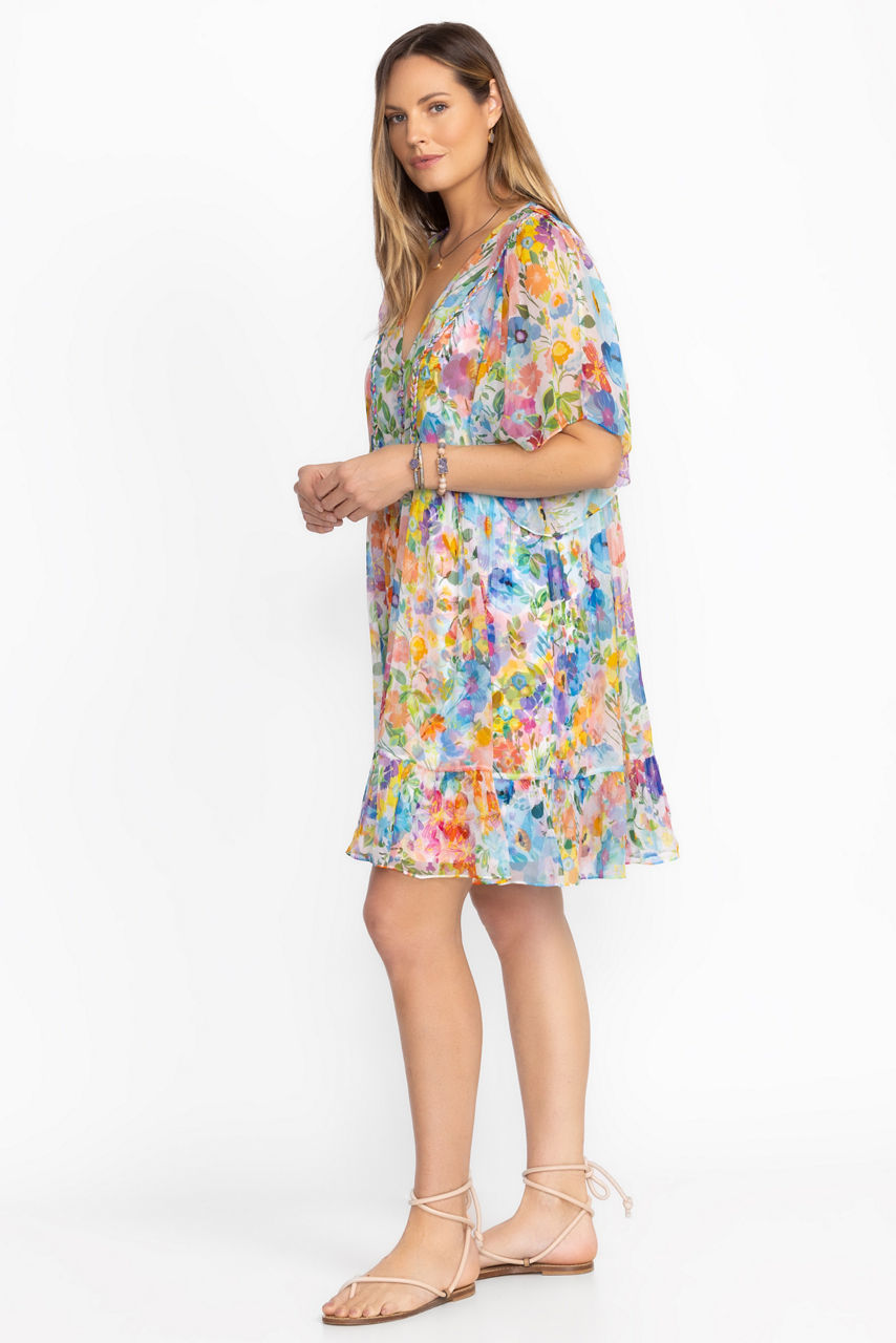 Crafted from 100% flowing silk, the Margareta Mini Dress offers a bold display of floral color. Featuring a V-neckline with a loop and button closure and gathered sleeves, this slip-lined dress is finished with a breezy tiered skirt. Pair with strappy sandals and a leather clutch for an elegant daytime event.