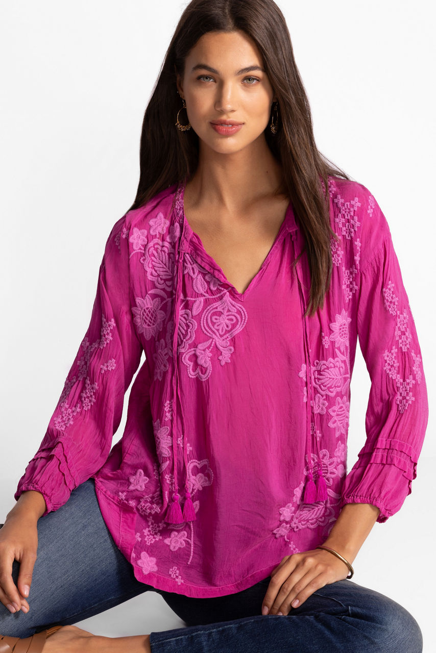 Crafted from 100% cupro, the Margot Blouse offers a refined elevated style. Designed with a split V-neckline with a tie and decorative tassels, this unique blouse offers 3/4 Bishop sleeves and gathers at the front and back. Pair with flowing palazzo pants and kitten heels for a night out with friends.