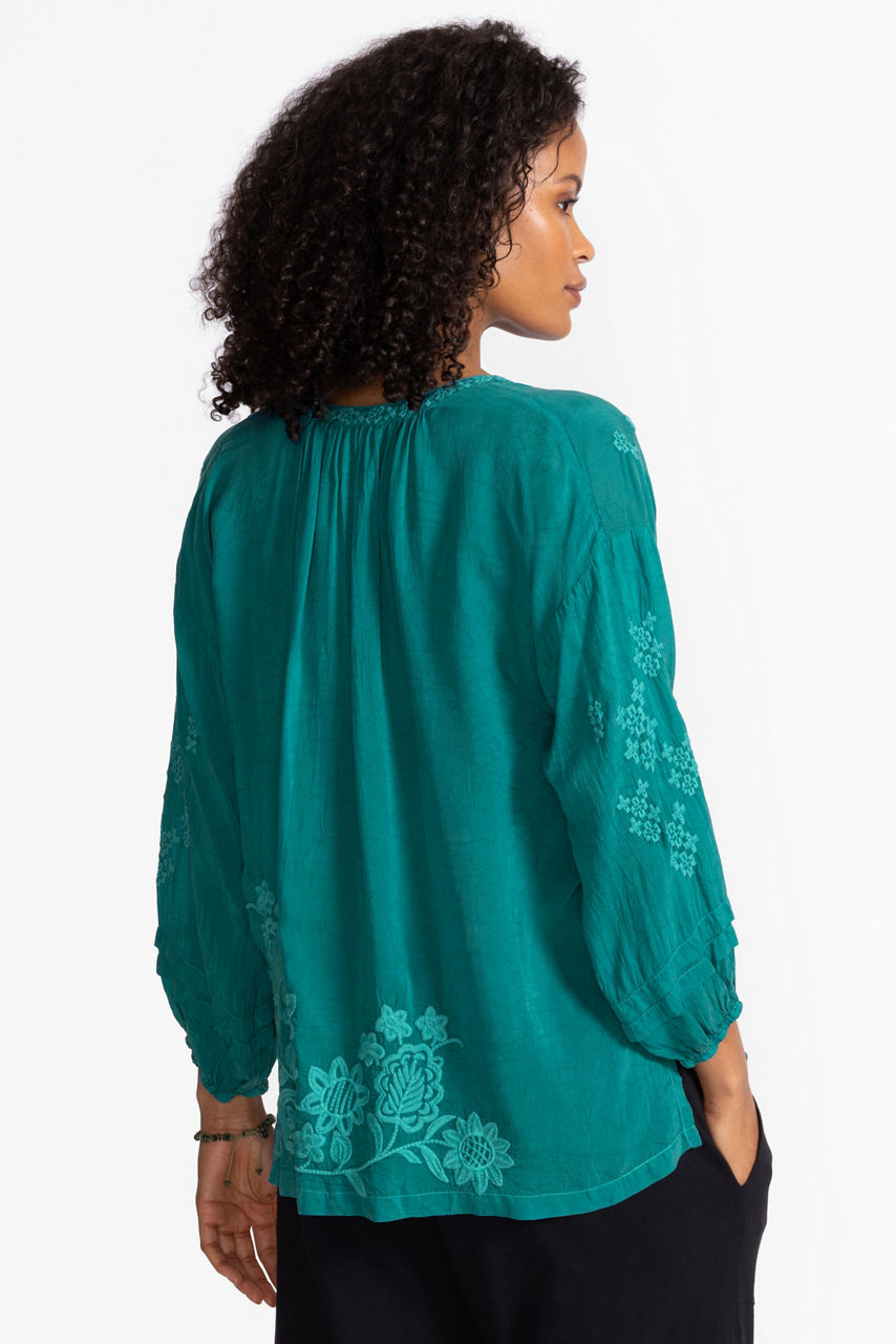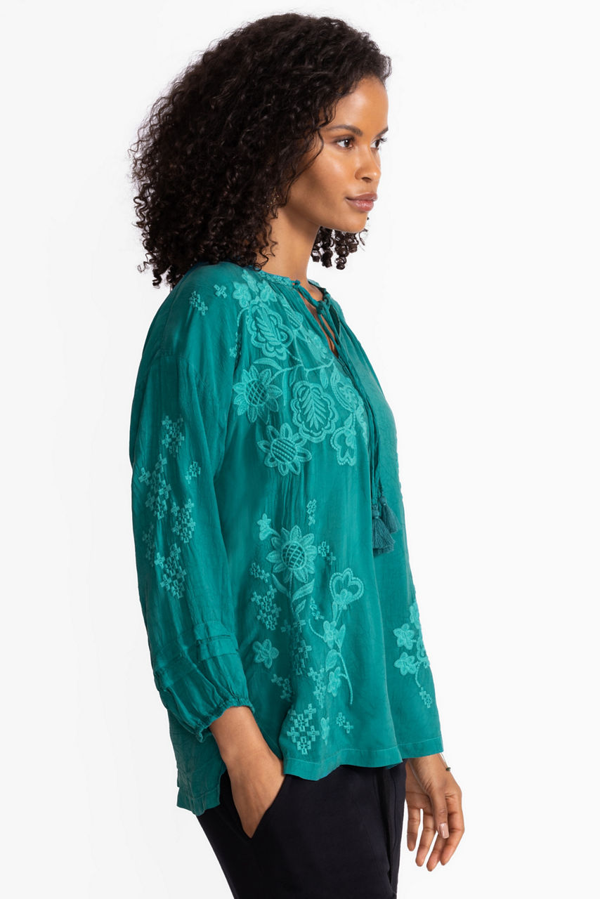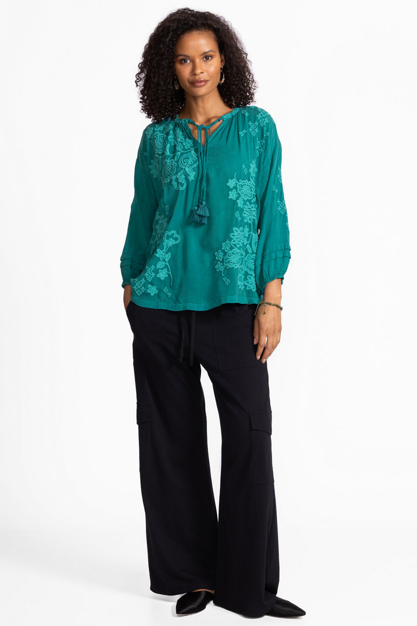 Crafted from 100% cupro, the Margot Blouse offers a refined elevated style. Designed with a split V-neckline with a tie and decorative tassels, this unique blouse offers 3/4 Bishop sleeves and gathers at the front and back. Pair with flowing palazzo pants and kitten heels for a night out with friends.