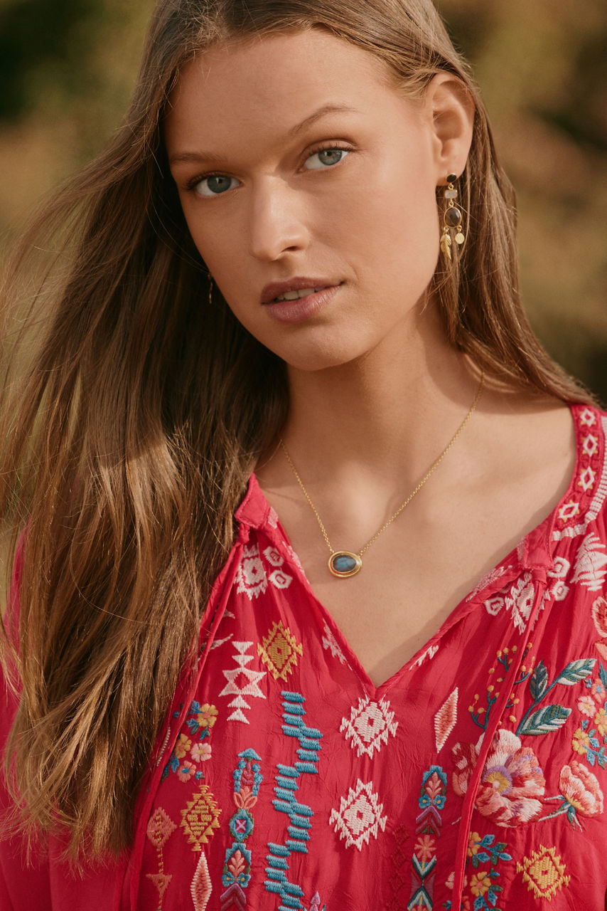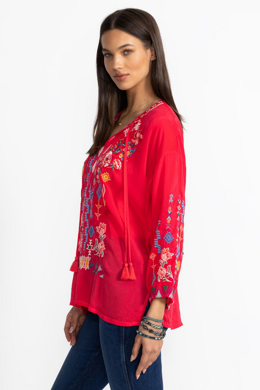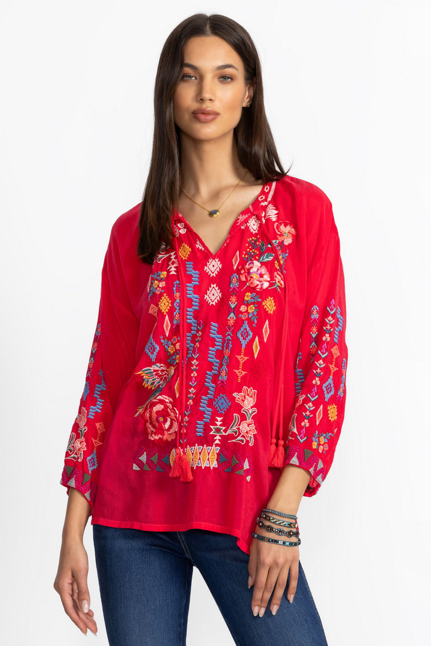 Embellished with bold embroidered details in rich primary colors, the Margot Blouse is vibrant and full of personality. Crafted from a lightweight fabric, this unique blouse features a split V-neckline and side slits for a relaxed fit. Pair with dark wash denim and trendy ankle boots for a casual lunch date.
