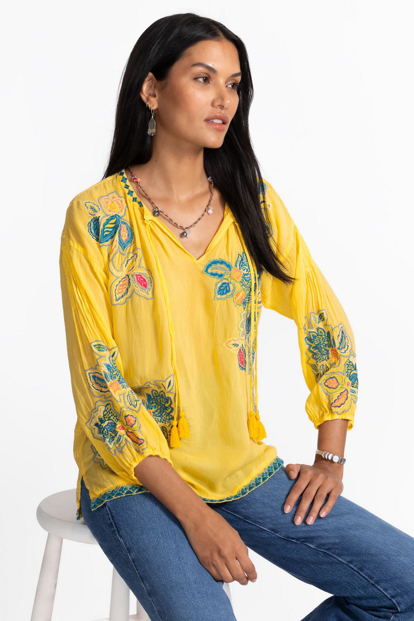 Imaginative and fun, the Margot Blouse is embellished with bold whimsical embroidered detailing. Crafted from a lightweight fabric perfect for warmer days, this blouse features a split V-neckline and elastic cuffs and is finished with side slits for a relaxed fit. Pair with linen pants and easy slides for a relaxing day by the pool.