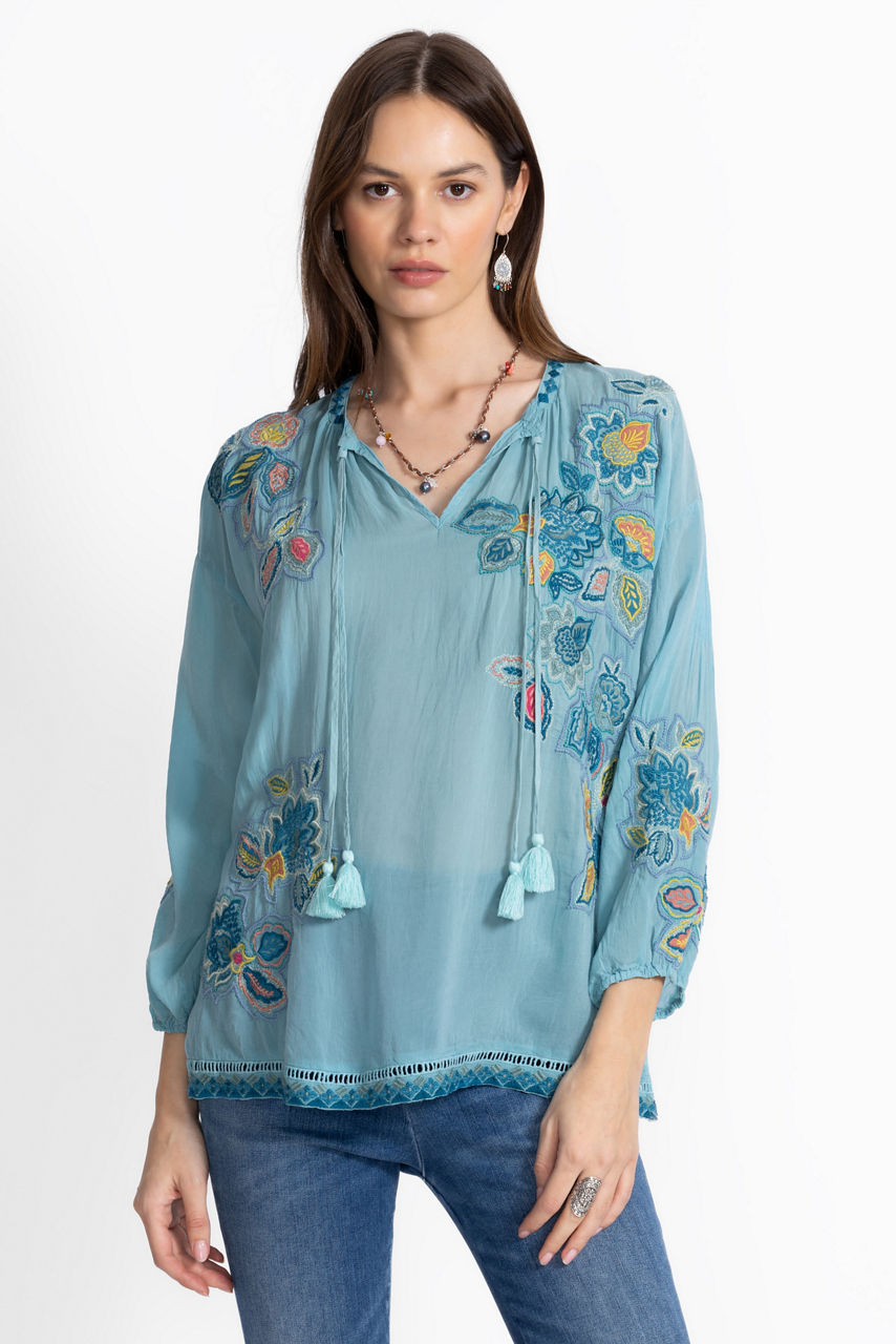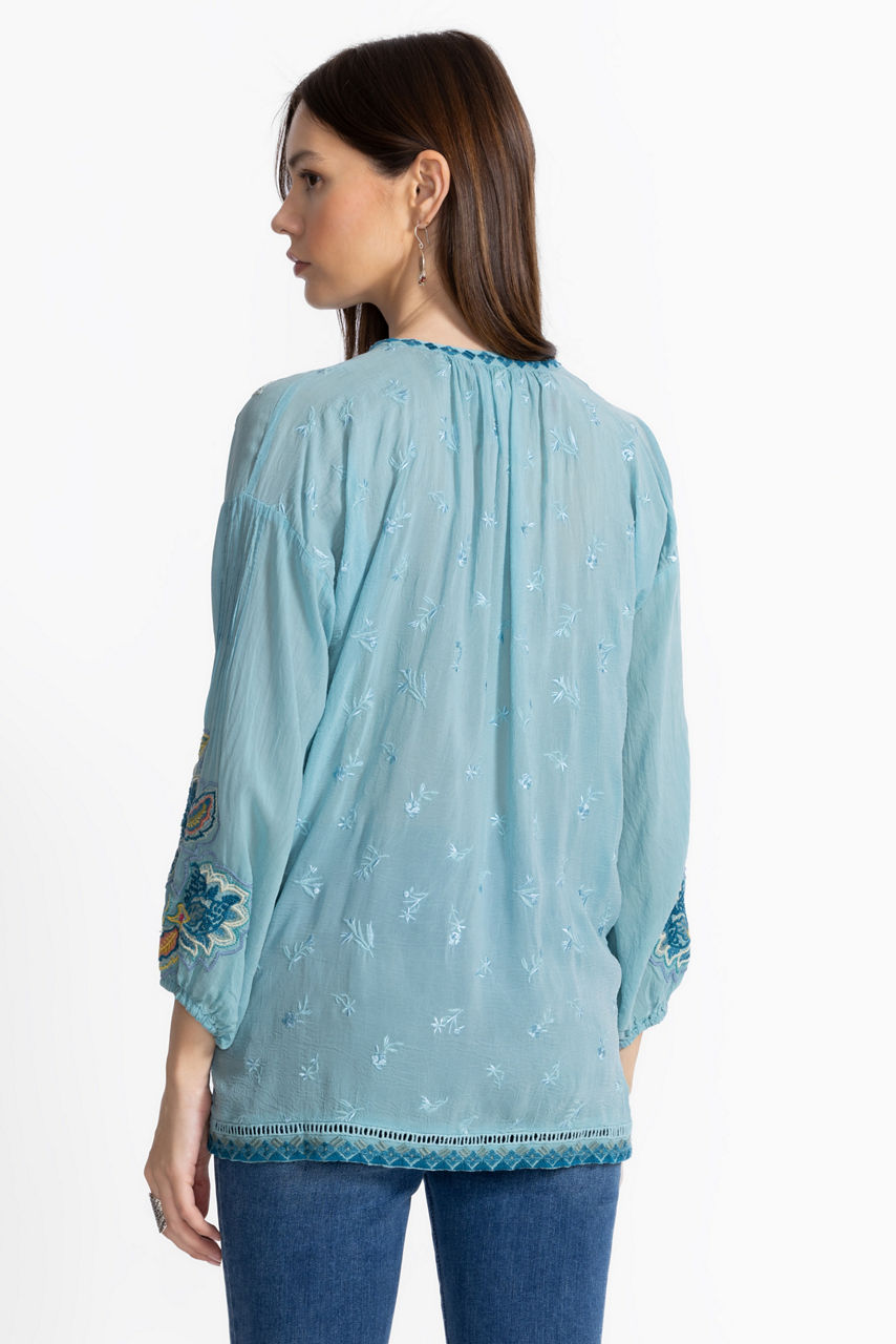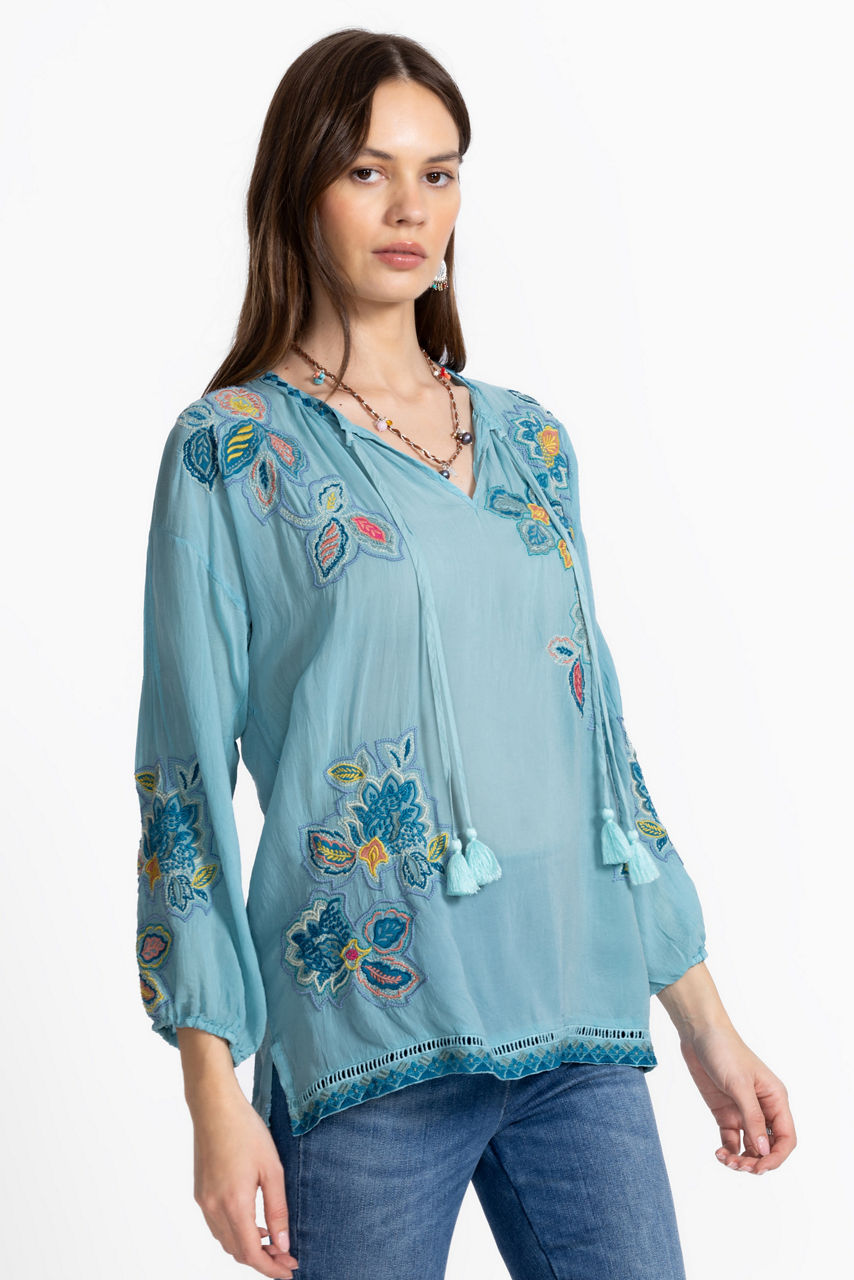 Imaginative and fun, the Margot Blouse is embellished with bold whimsical embroidered detailing. Crafted from a lightweight fabric perfect for warmer days, this blouse features a split V-neckline and elastic cuffs and is finished with side slits for a relaxed fit. Pair with linen pants and easy slides for a relaxing day by the pool.