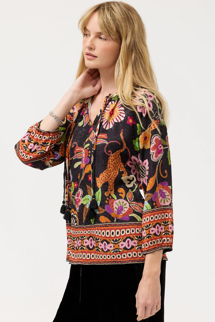 Adorned with a vibrant floral patterned, the Margot Blouse features a contrasting border at the sleeves and hemline. Designed with a split V-neckline and gently puffed Bishop sleeves, this vibrant blouse is finished with gathers at the collar and sleeves and is finished with side slits for a relaxed fit. Pair with trousers and bold flats for a polished weekday ensemble.