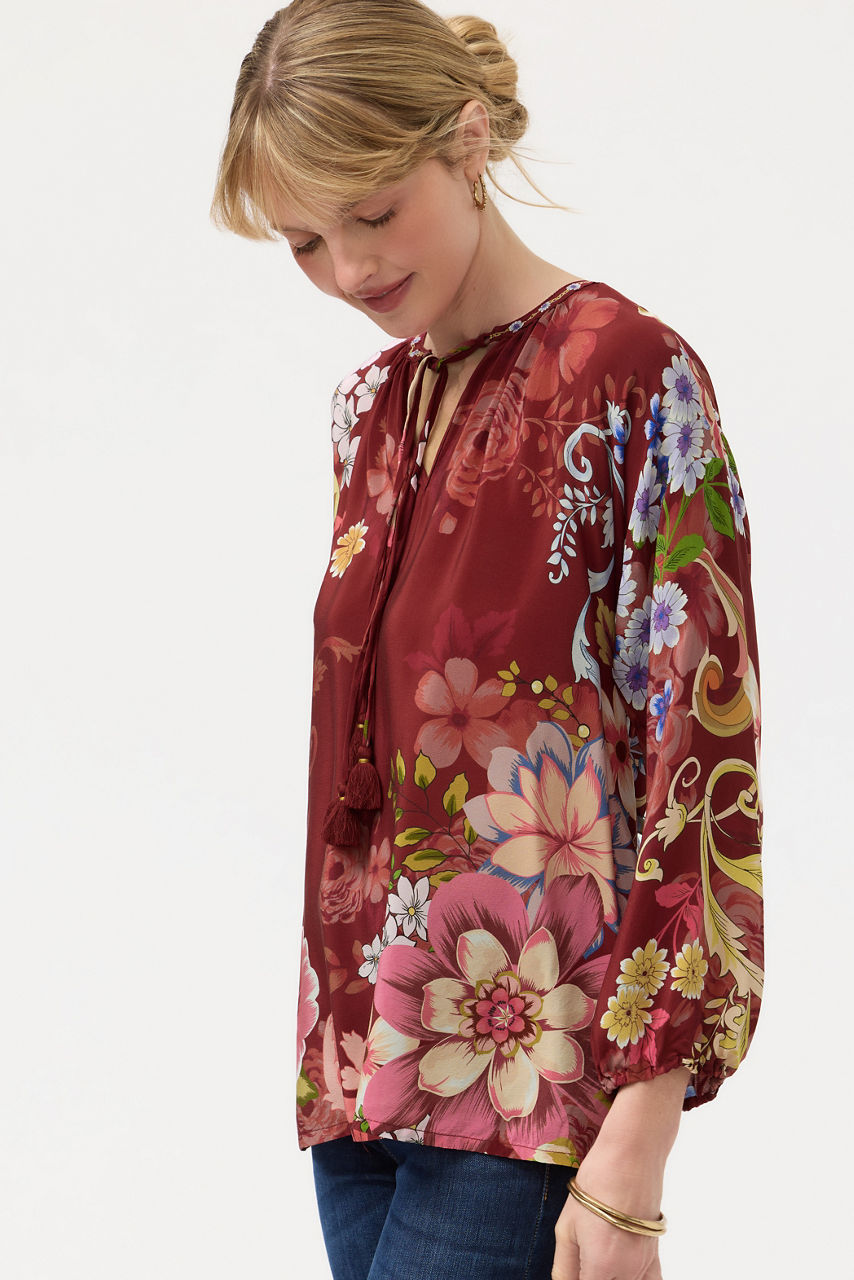 Crafted from 100% sumptuous silk, the Margot Blouse is embellished with a bold floral array. Designed with a split V-neckline and gently puffed Bishop sleeves, this vibrant blouse is finished with gathers at the collar and sleeves and finished with side slits for a relaxed fit. Pair with trousers and bold flats for a polished weekday ensemble.