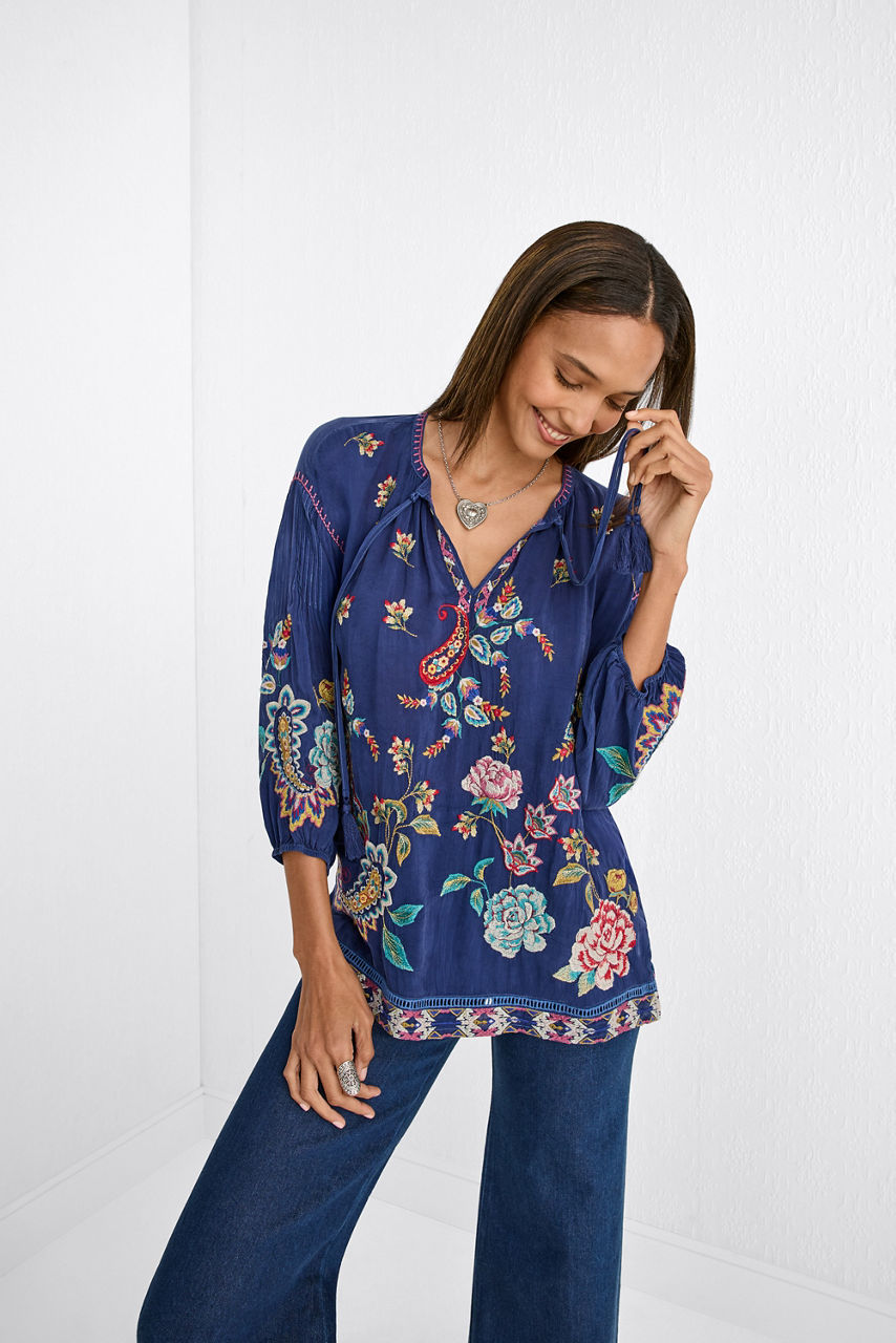 Beautifully embroidered with an intricate floral pattern in bold hues, the Margot Blouse is crafted from a light and airy fabric that breathes. Designed with a split V-neckline and delicate ties, this blouse is cut with elastic cuffs and side slits for a relaxed fit. Pair with dark wash denim and coordinating flats for a polished casual look.