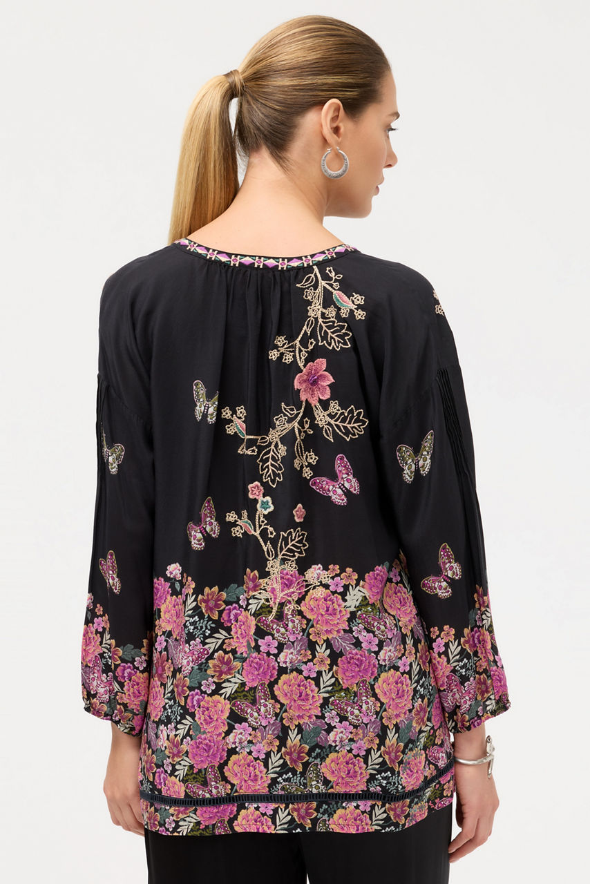 Beautifully crafted from 100% flowing silk, the Margot Blouse is adorned with fresh florals and butterflies in flight. Featuring a split V-neckline with beaded tassels and gathers at the neckline, this elegant blouse offers 3/4 sleeves with cuffs and is finished with side slits for a relaxed fit. Pair with cropped wide-leg pants and easy mule sandals for a modern casual look.