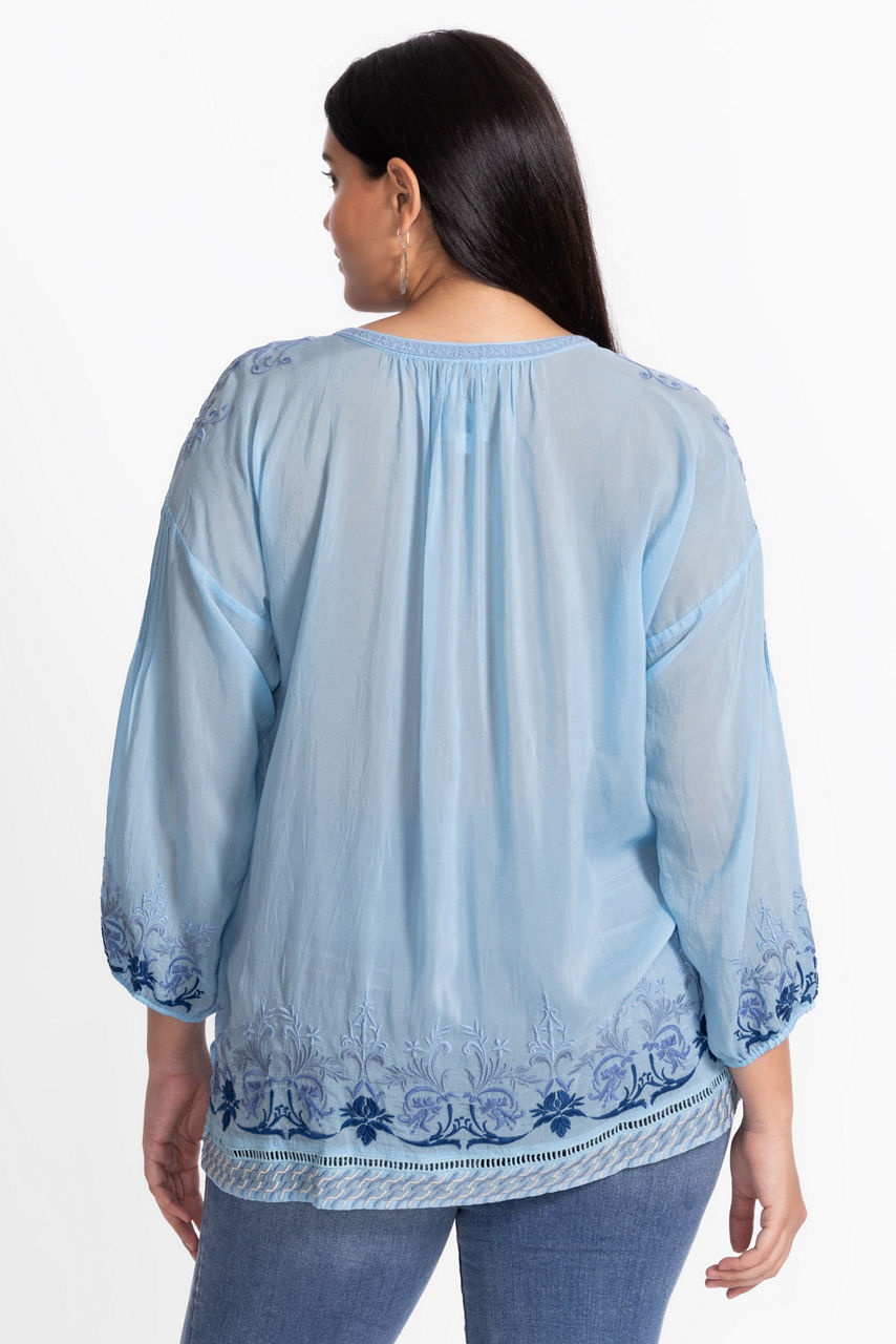 Beautifully embroidered with an intricate floral pattern in hues of blue, the Margot Blouse is crafted from a light and airy breathable fabric. Designed with a split V-neckline and delicate ties, this blouse offers elastic cuffs and side slits for a relaxed fit. Pair with dark wash denim and coordinating flats for a polished casual look.