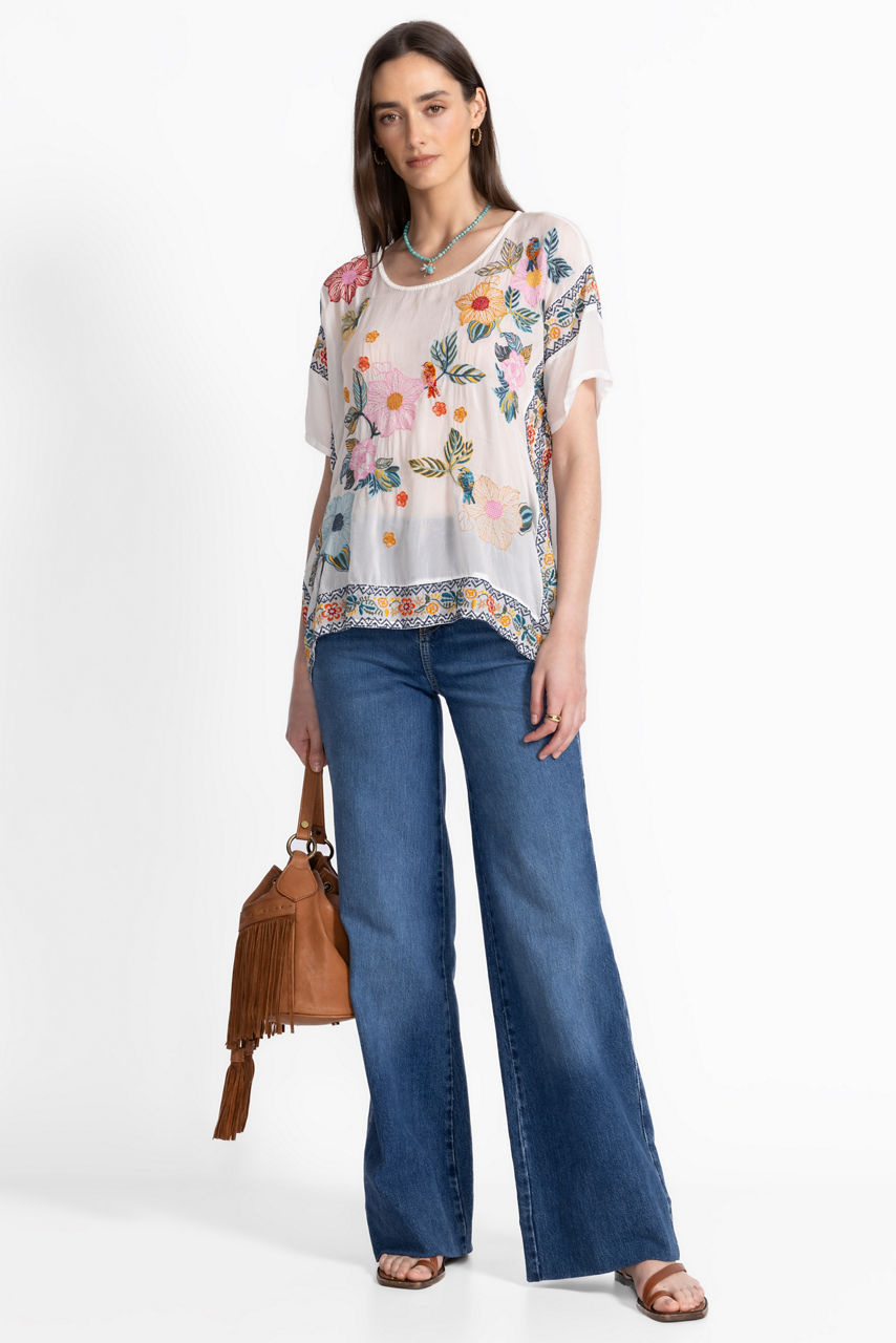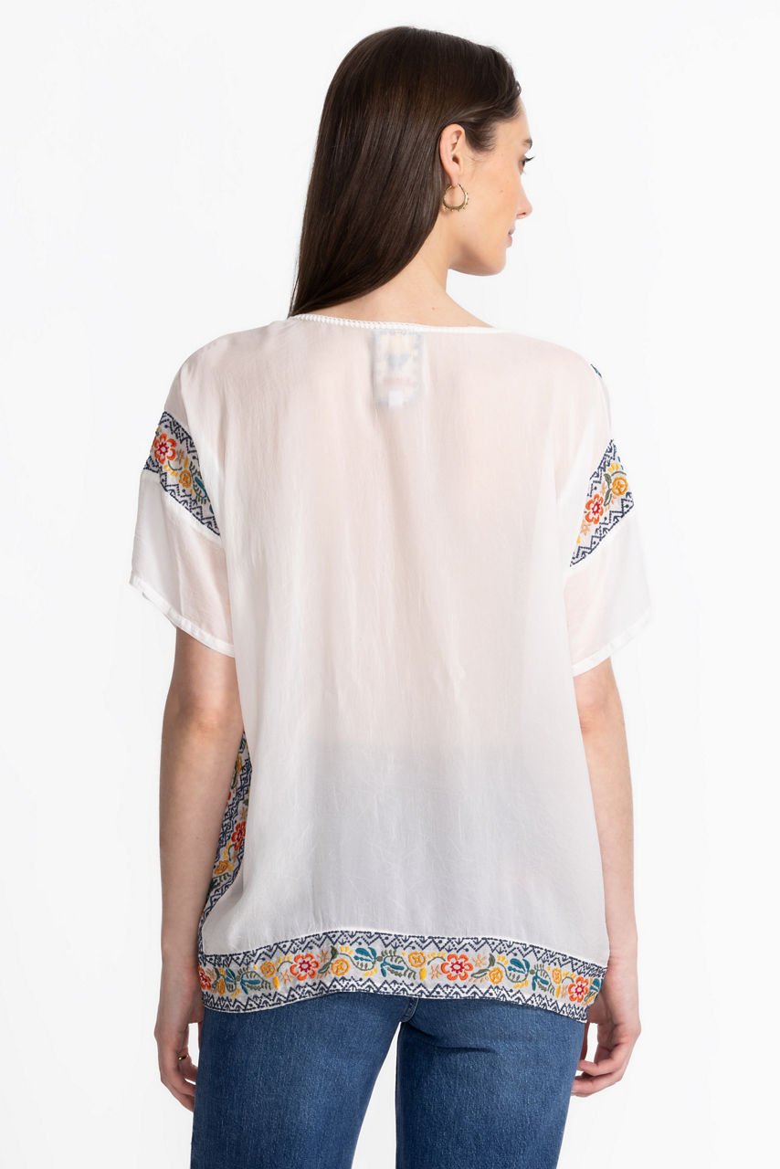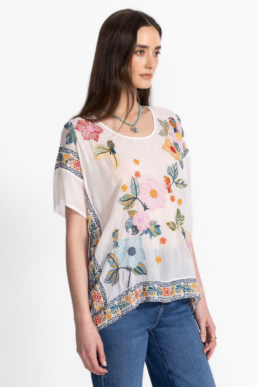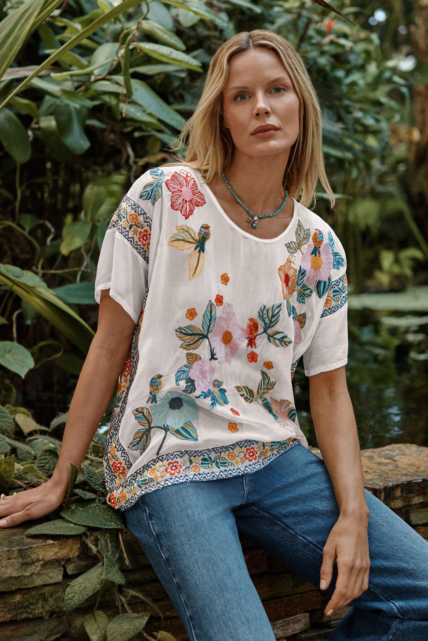 Charmingly adorned with a vibrant floral print, the Mariafe Blouse expertly combines casual comfort and impeccable style. Designed with a rounded neckline and short sleeves, this unique blouse features a handkerchief hem embellished with a vibrant embroidered trim. Pair with a colorful skirt and fashion sneakers for a casual vacation look.