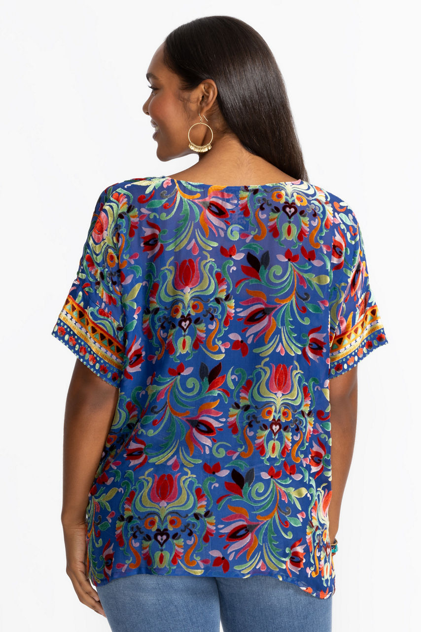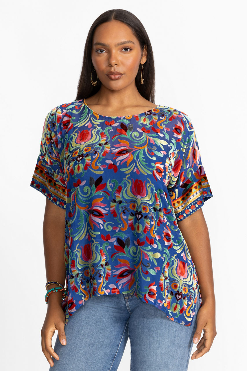 Crafted from a unique silk blend, the Mariafe Blouse is embellished with a vibrant floral pattern on a rich blue backdrop. Designed with a rounded neckline and relaxed Dolman sleeves, this slip-lined blouse is finished with a handkerchief hemline. Pair with skinny jeans and flats for a day of sightseeing.