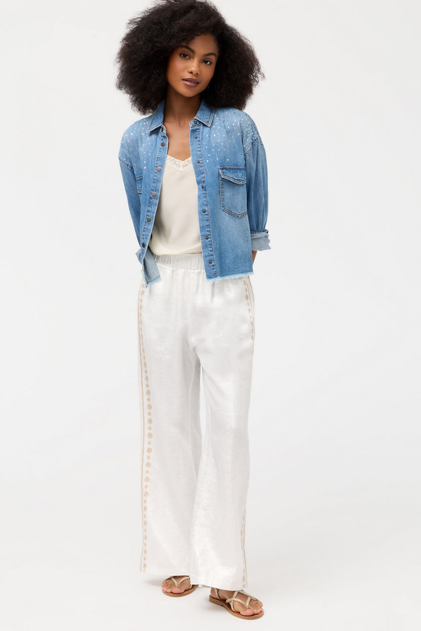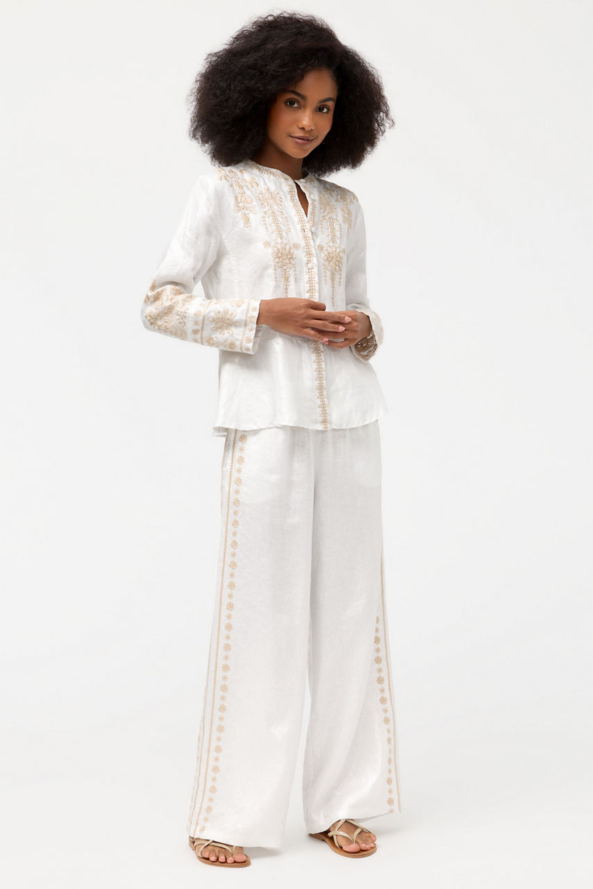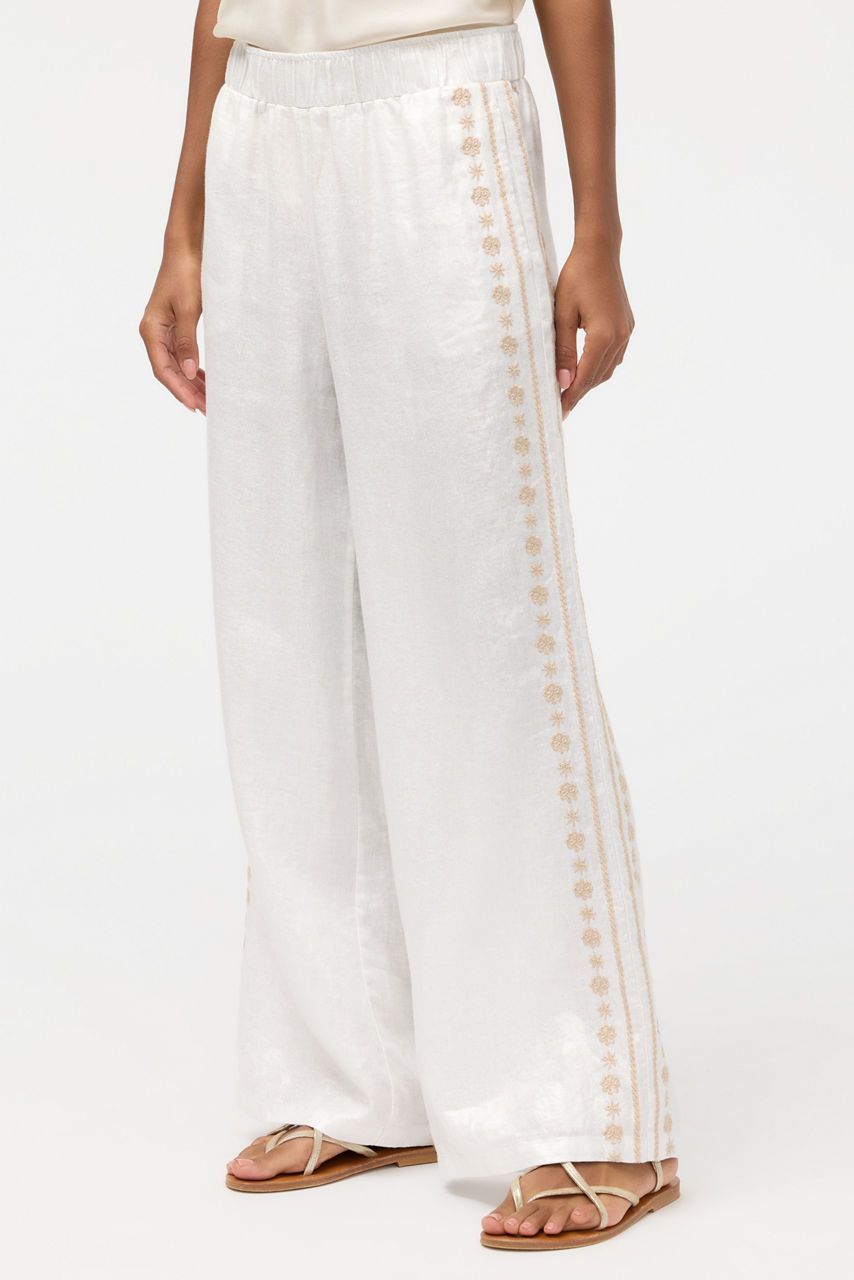 The Marik Linen Pants are crafted from 100% breathable linen and are a modern wardrobe staple. Featuring an elastic waist and wide, flowing legs, these unique pants are finished with intricate embroidered detailing for a custom look. Pair with the Marik Linen Peplum Jacket for a polished vacation-inspired look.