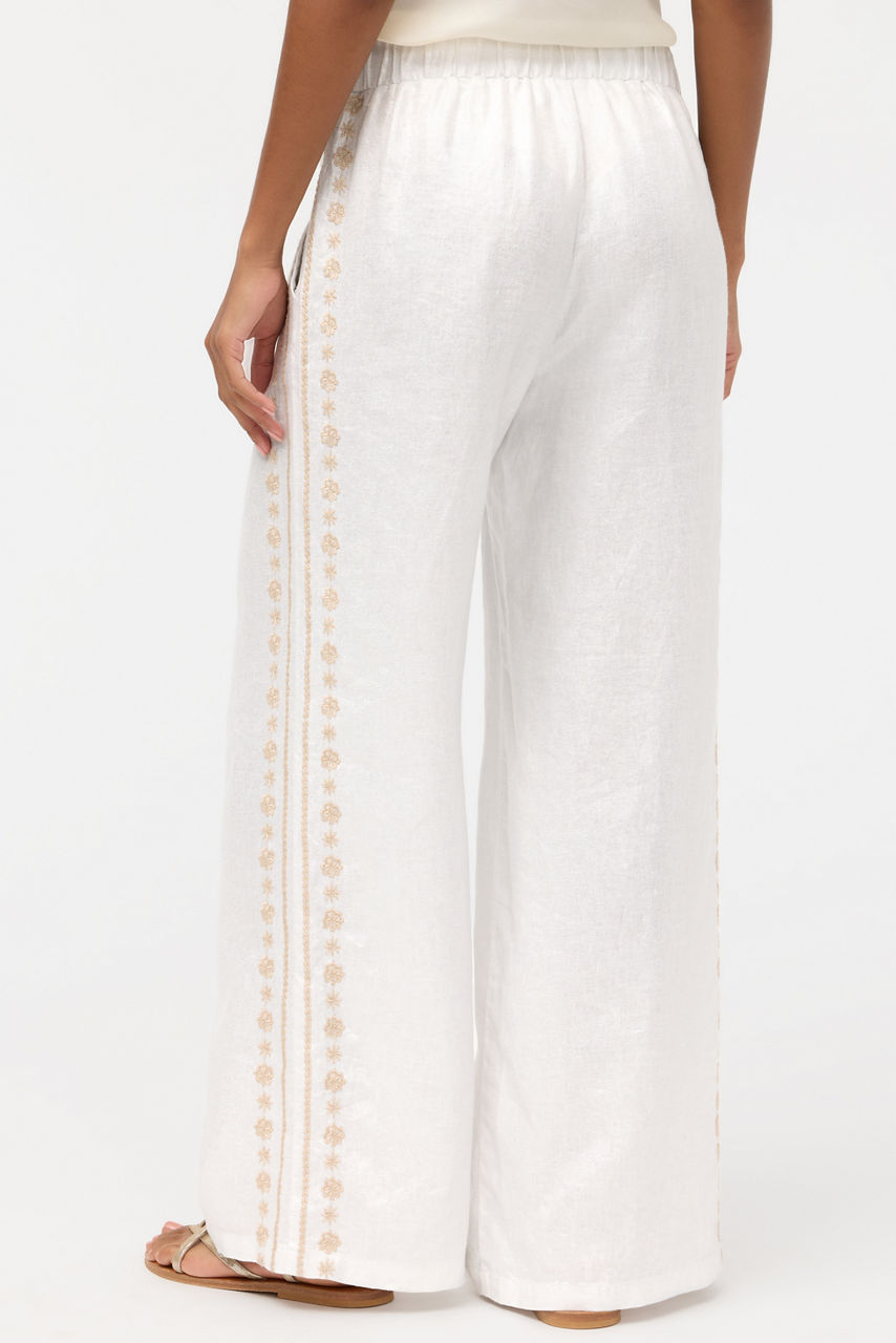 The Marik Linen Pants are crafted from 100% breathable linen and are a modern wardrobe staple. Featuring an elastic waist and wide, flowing legs, these unique pants are finished with intricate embroidered detailing for a custom look. Pair with the Marik Linen Peplum Jacket for a polished vacation-inspired look.