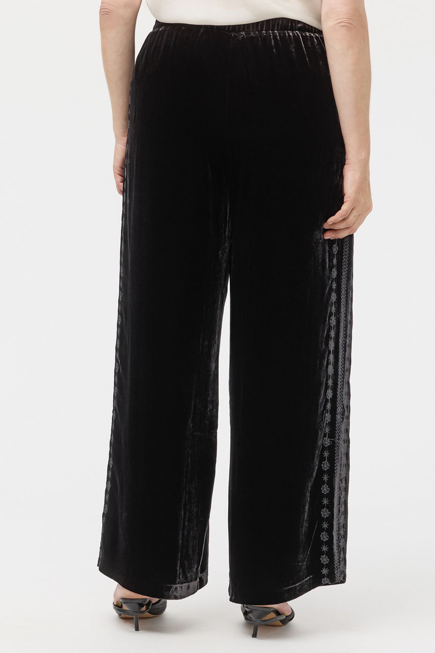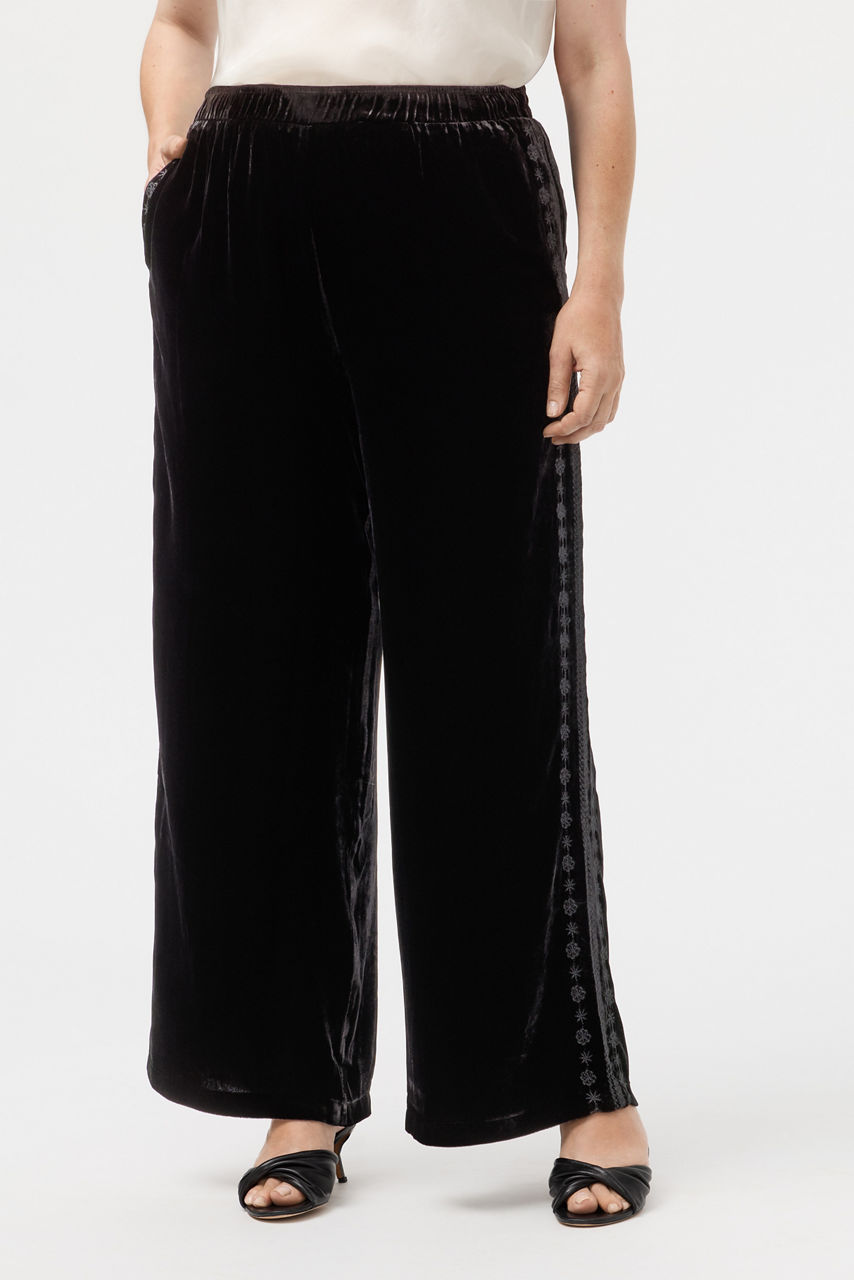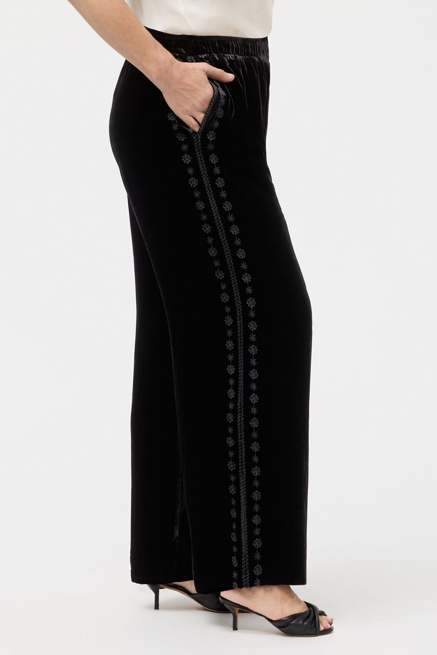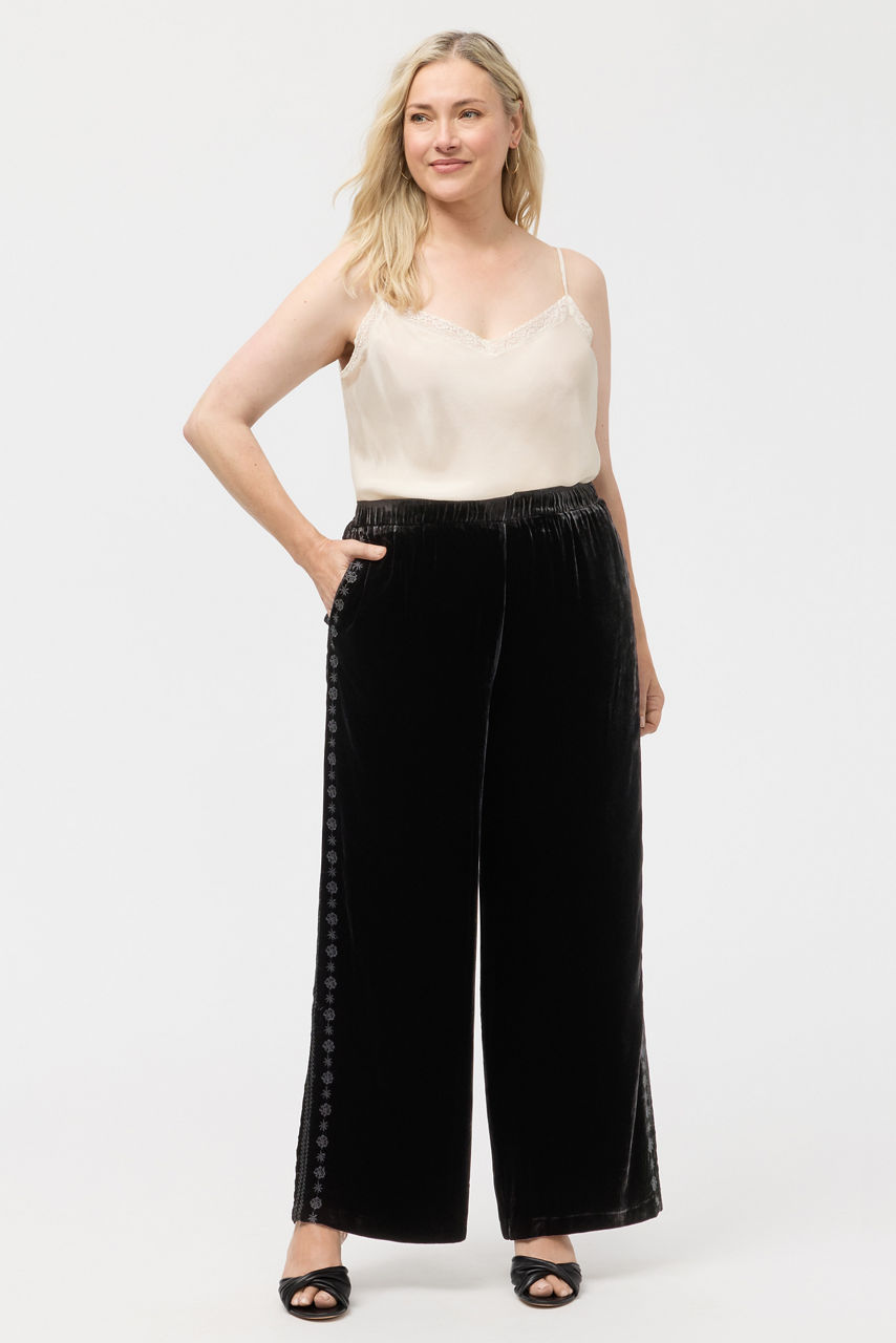 Beautifully crafted from a rich silk blend, the Marik Velvet Pants exemplify elevated style. Designed with an elastic waist and flowing wide-legs, these unforgettable pants are finished with intricate embroidered detailing along the leg line. Pair with a silk cami and a flowing kimono top for a polished timeless look.