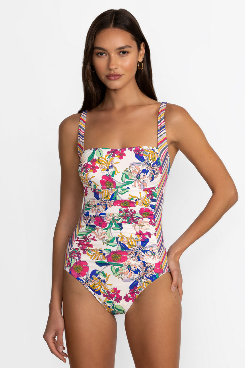 The Marilyn Ruched One Piece is expertly embellished with beautifully vibrant floral blooms. Featuring bold color and a dramatic square neckline, this suit offers a ruched front panel and adjustable straps along with side panels adorned with a contrasting stripe pattern for an enhanced silhouette. Pair with the Boat Neck Kaftan and slides for a sophisticated poolside ensemble.