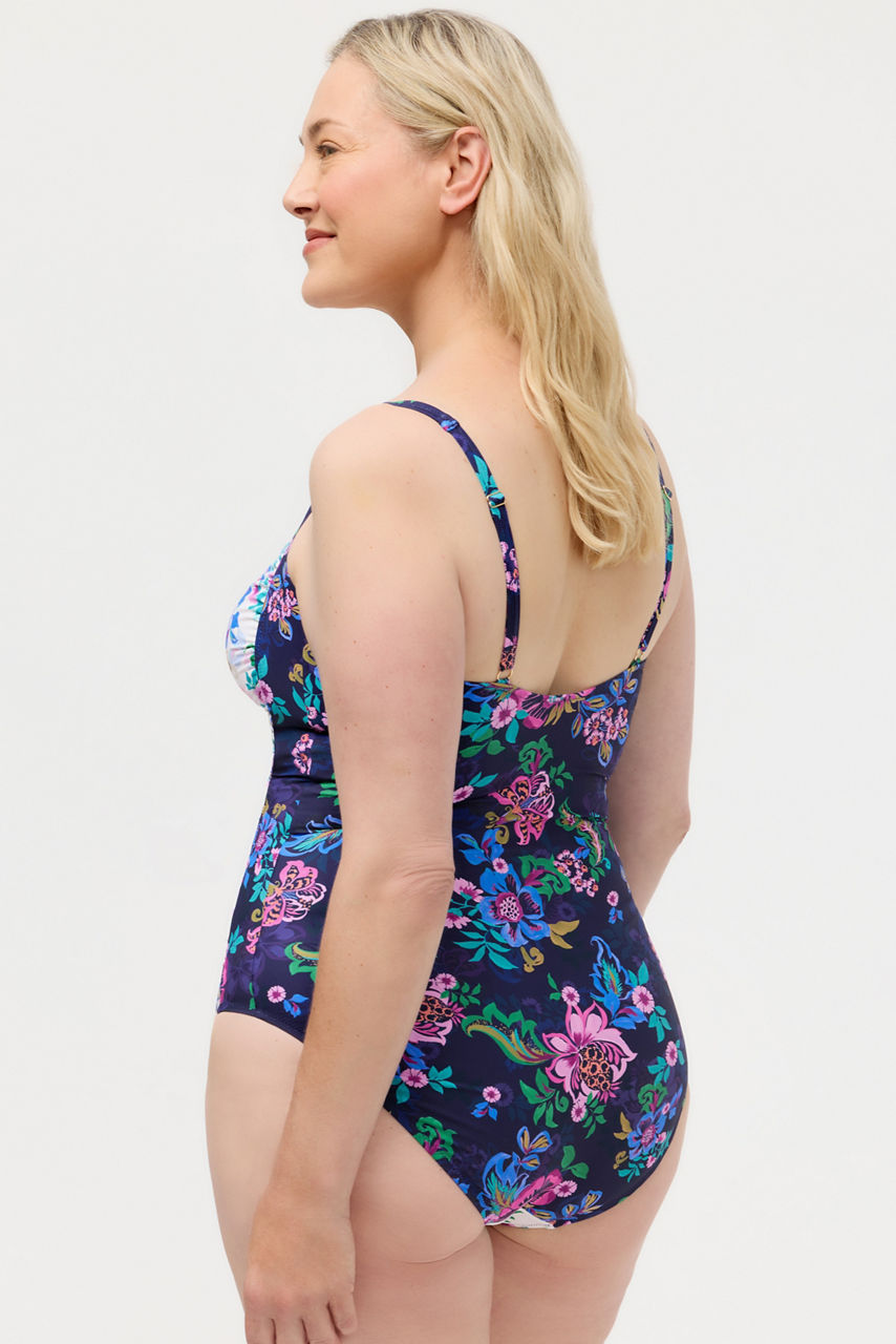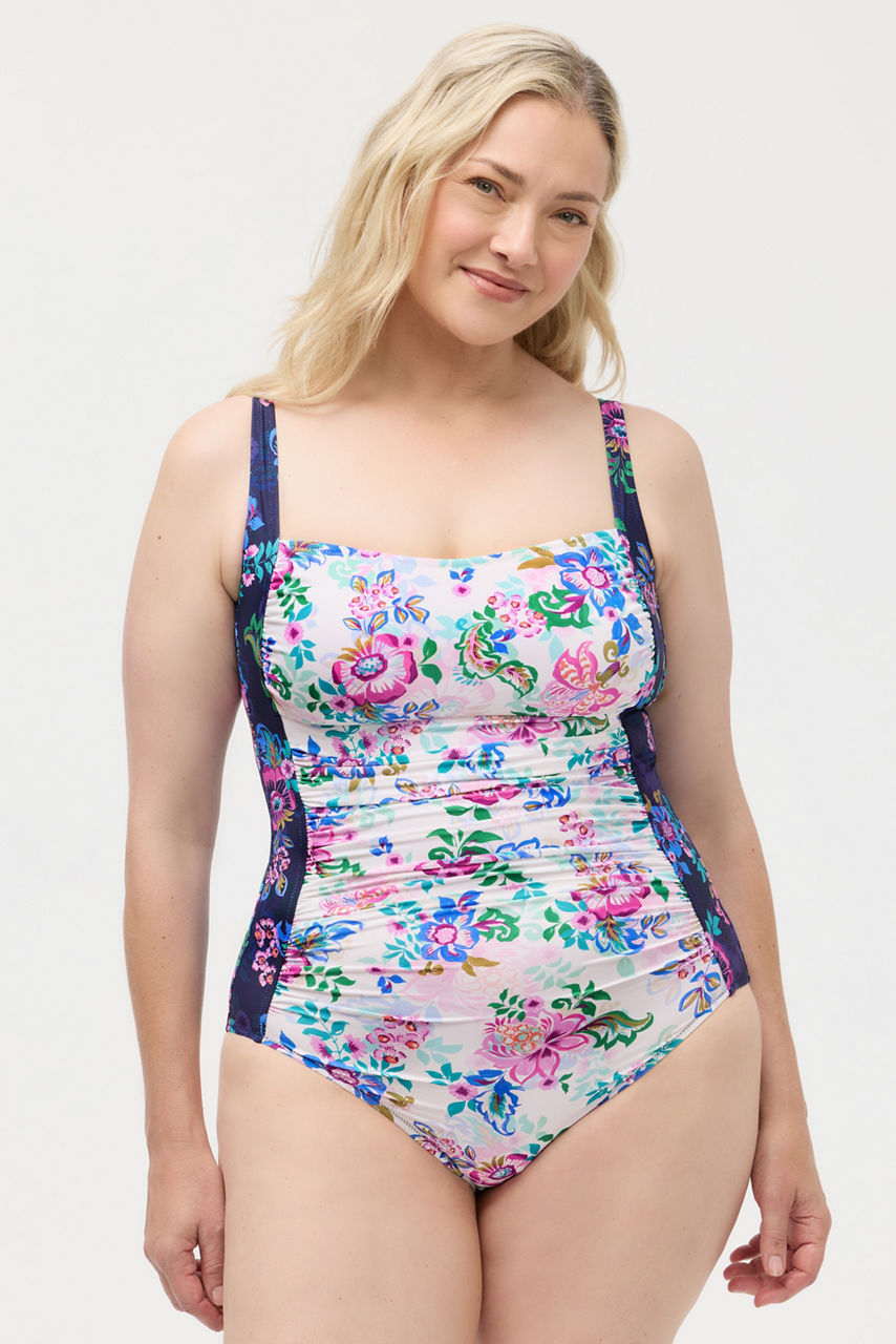 The Marilyn Ruched One Piece blends timeless glamour with a fresh, floral twist. Featuring flattering ruching through the torso, contrast side panels, and a chic square neckline, it s designed to sculpt and highlight your shape with effortless elegance. Adjustable straps and a vibrant mix of prints make it a standout choice for poolside lounging or seaside escapes.