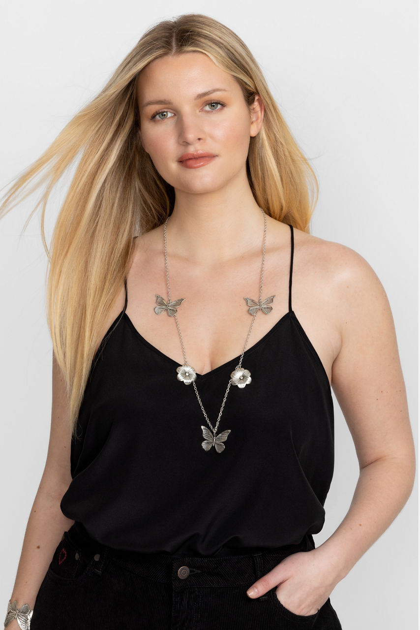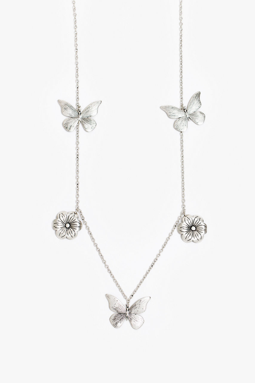 Crafted from 100% brass plated in stunning silver, the Mariposa Garden Necklace beautifully completes any look. Featuring delicate blooms and butterflies in flight suspended from a sparkling chain, this unique necklace offers a glimpse into nature's beauty. Style with a V-neck top and flowing linen pants to allow this necklace to shine.