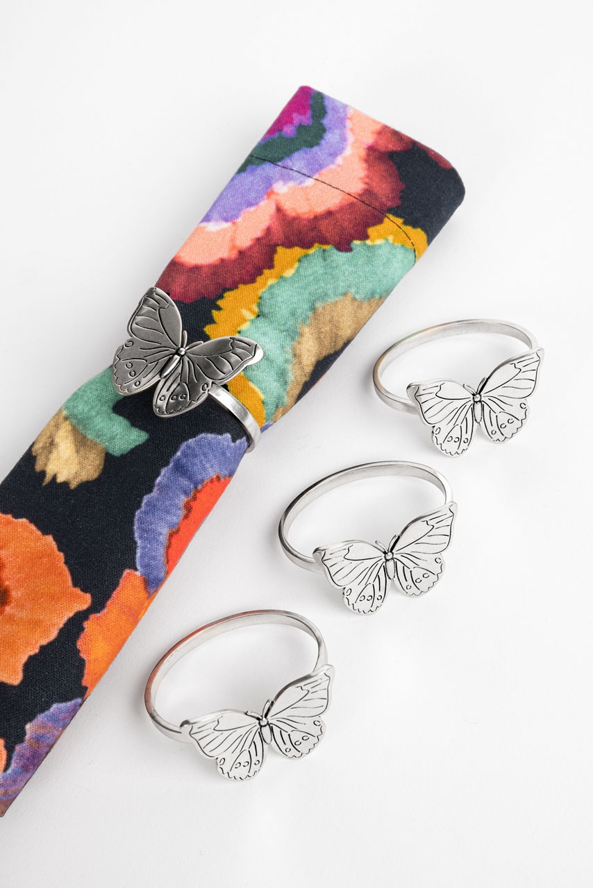 Crafted from 100% brass, the Mariposa Napkin Rings are offered in a stunning set of four. Featuring an intricately detailed butterfly in flight etched in a brilliant silver-tone, these napkin rings are a lovely for entertaining at home. Place against a saturated table cover with silver-toned place setting to enhance the elegance.