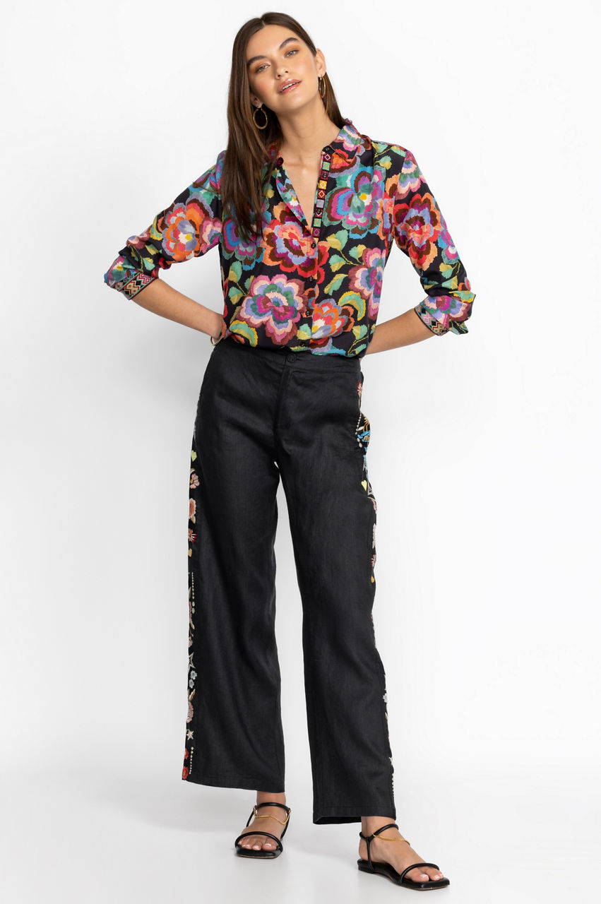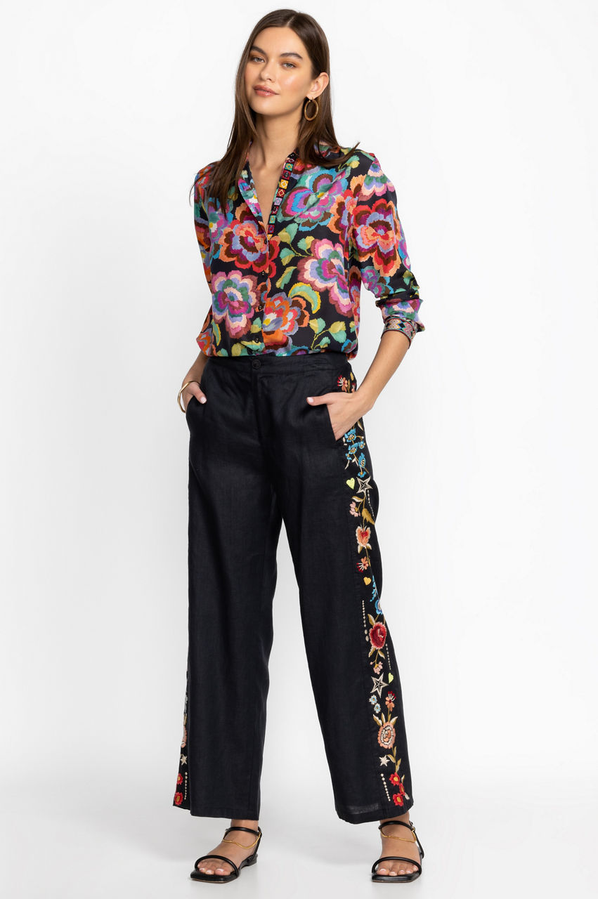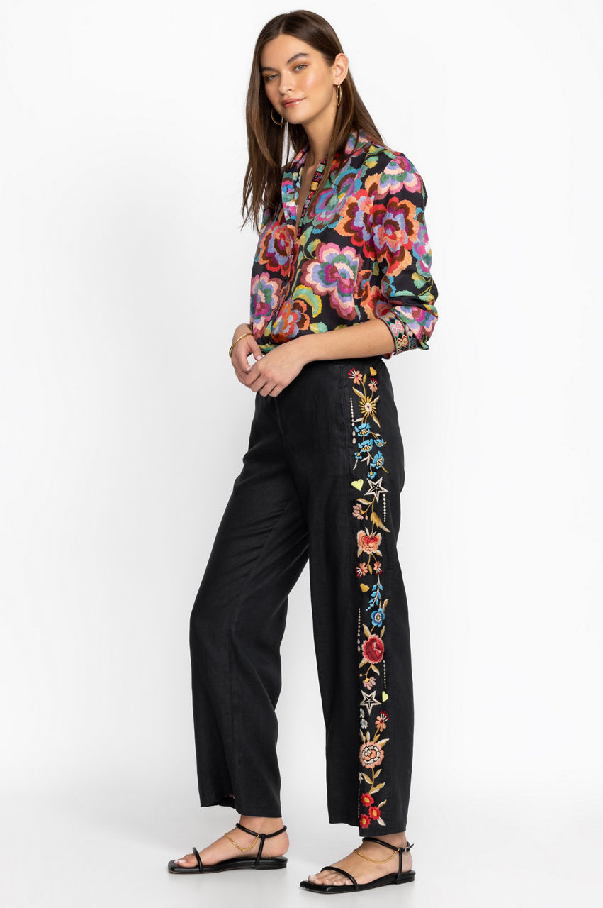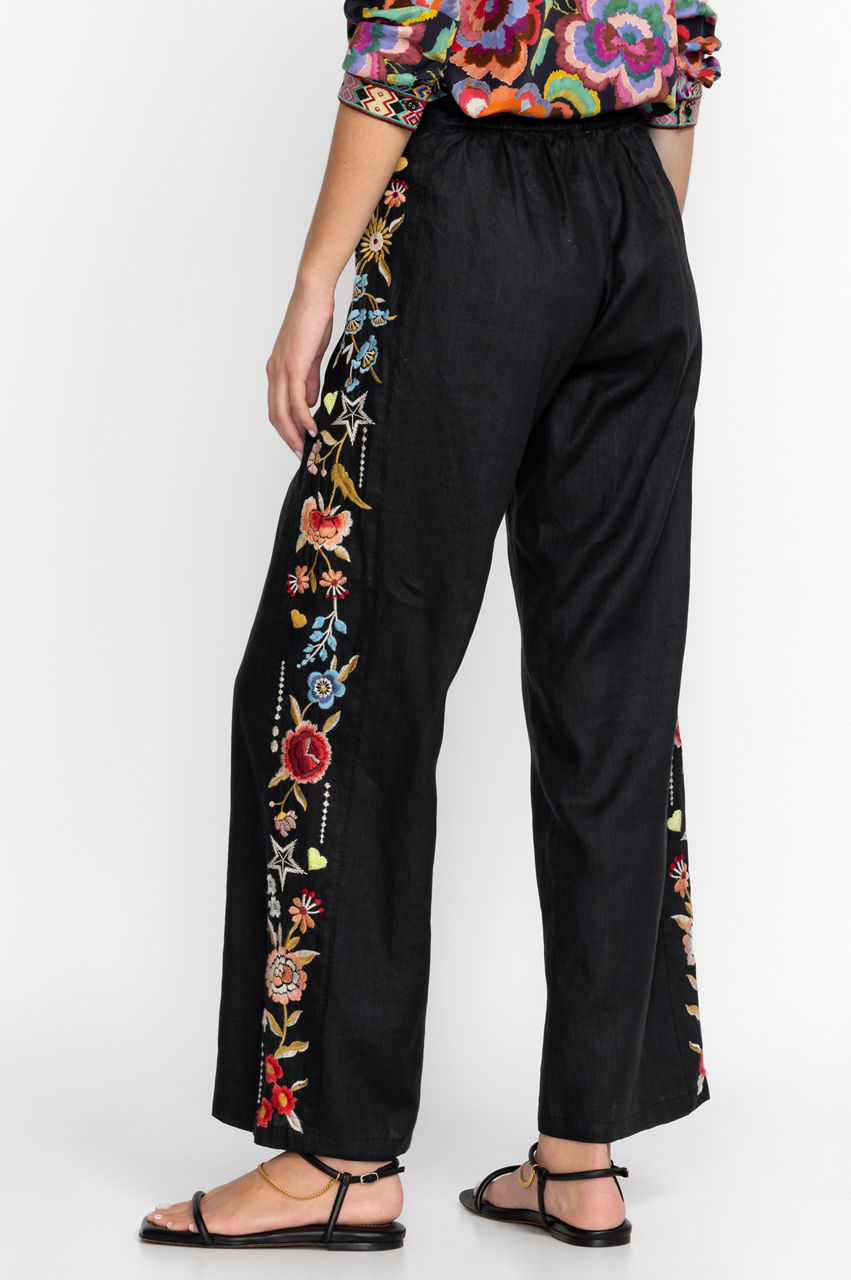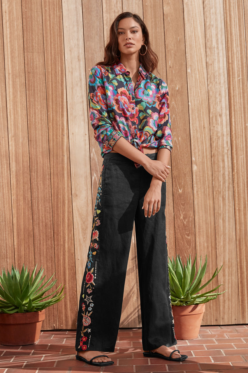 A fresh choice for brighter weather, the Maris Effortless Pants make daytime dressing a breeze. Versatile yet fashion-forward, these pants are designed from breathable linen and punctuated with a colorful floral placement embroidery that runs along the outside leg. Finished with a zipper fly and an elastic back waistband for a comfortable fit, these pants work wonders with both plain vests and luxe blouses.
