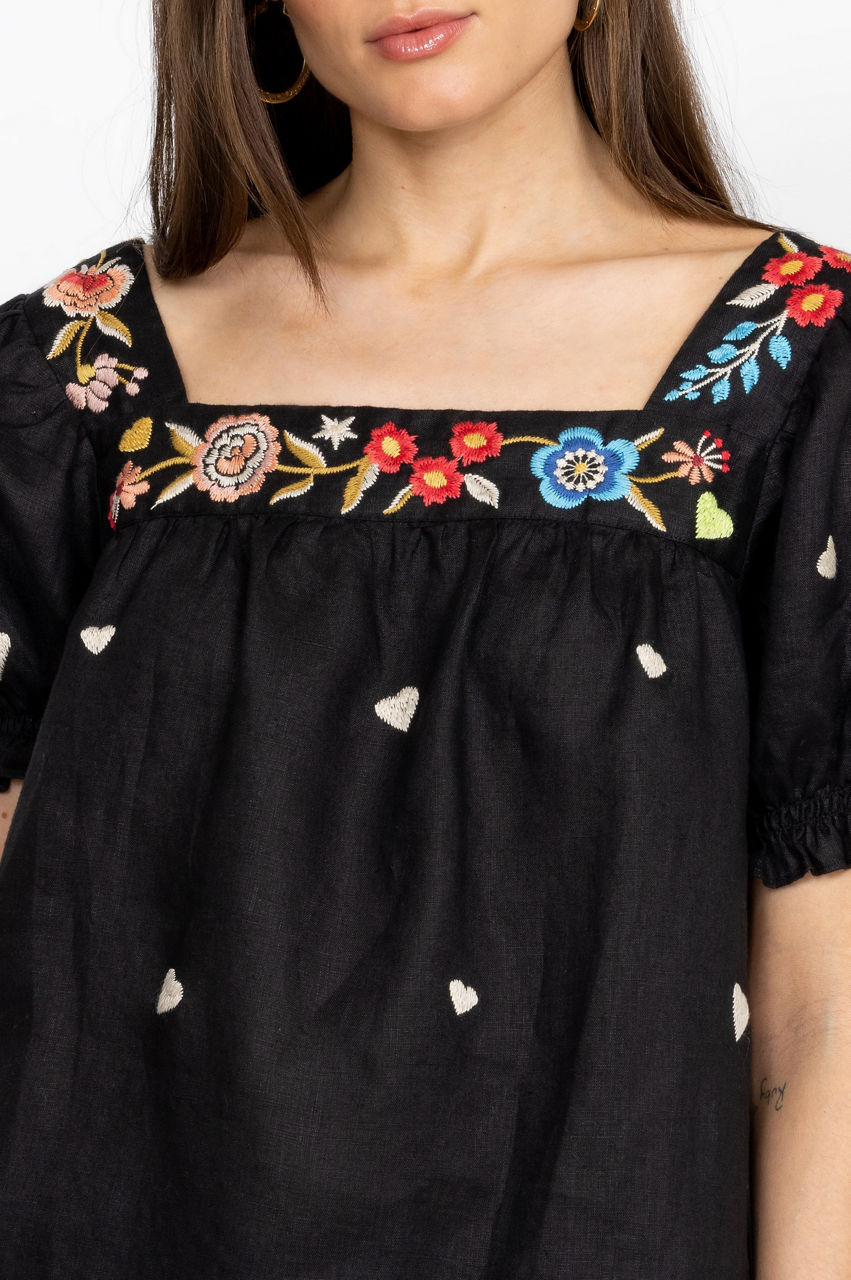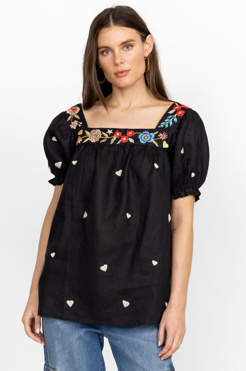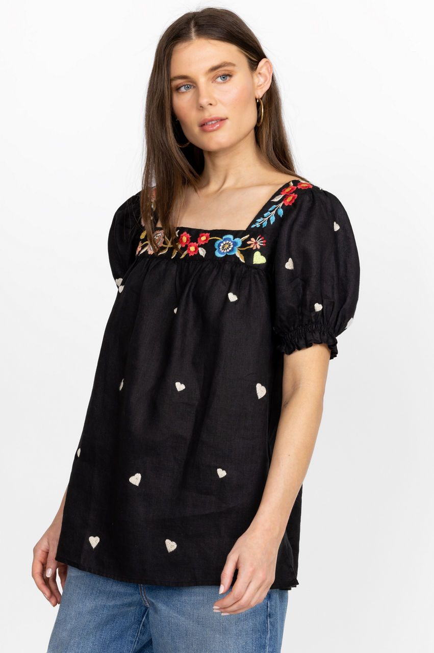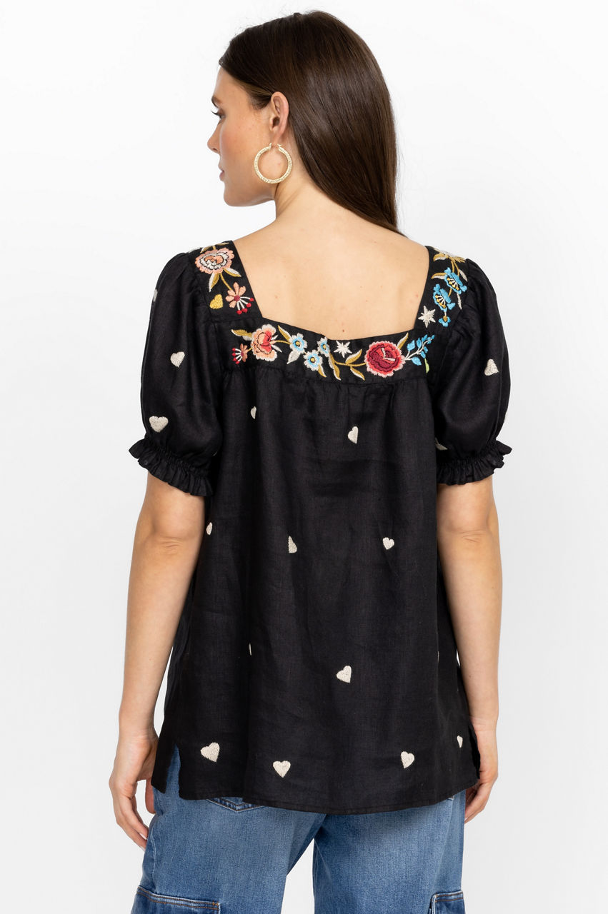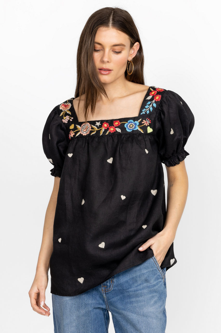 Embodying a romantic spirit, the Maris Square Neck Park Blouse is perfect for afternoons spent under the sunshine. Designed from pure linen, this blouse is enhanced by a square neck, short sleeves, and a vivid floral placement embroidery that runs along the neckline. Finished with subtle heart motifs, this blouse can be worn with jeans for a look that's equal parts playful and laid-back.