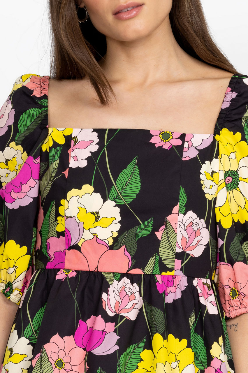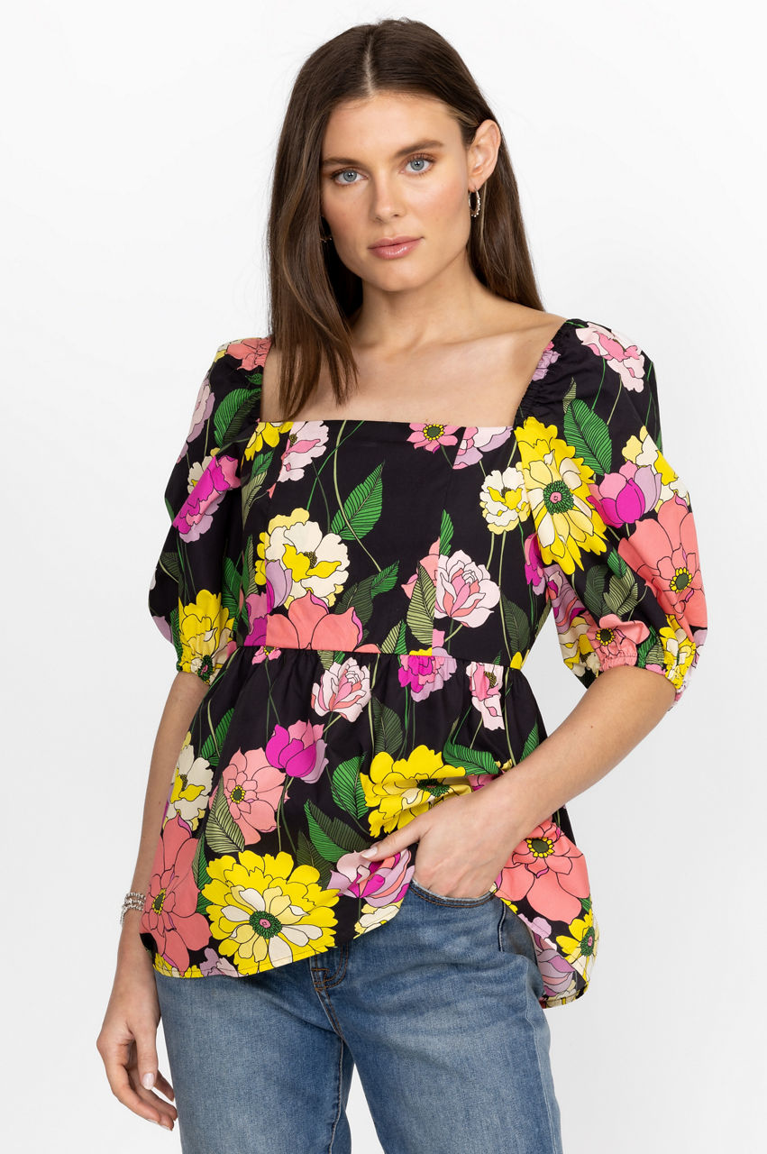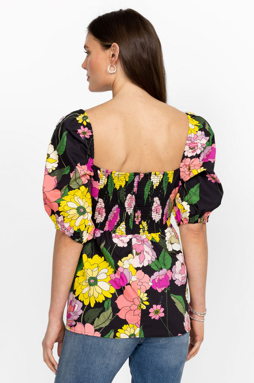 The height of feminine beauty, the Marisol Blouse is a refreshing addition to your new season wardrobe. Accentuated with rich yellow, pink, and green tones, this blouse is crafted from pure cotton and features a square neck, elastic sleeve cuffs, an abundance of blooming flowers, and shirring at the center back to add structure to the silhouette. Style with sophisticated pants for a smooth day-to-night transition.