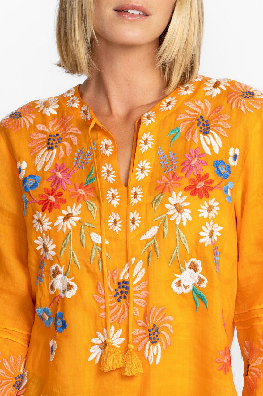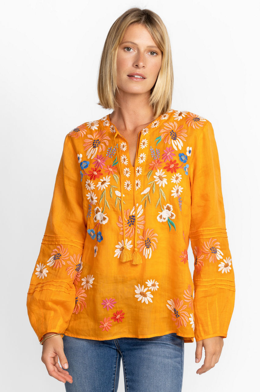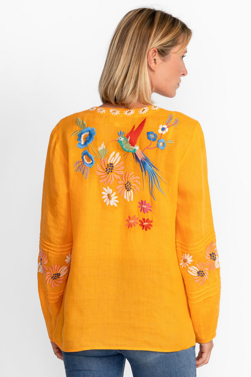 Saturated in color, the Marissa Pintuck Blouse is a celebration of the sunny season. Featuring an open neckline and radiant placement embroidery, this blouse adds a splash of vibrancy and whimsy to your wardrobe. Pair with shorts and sandals for a vacation-ready ensemble.