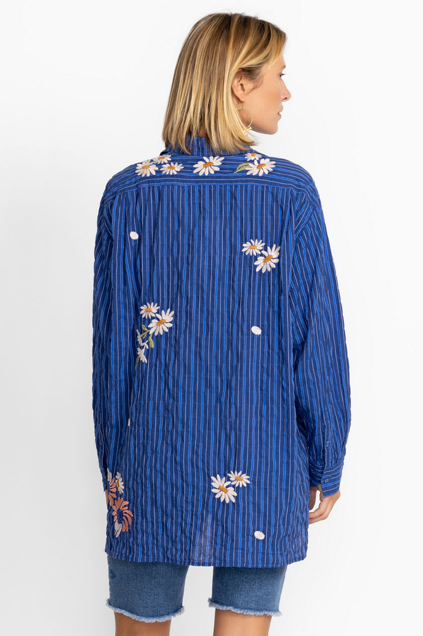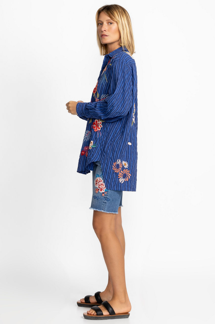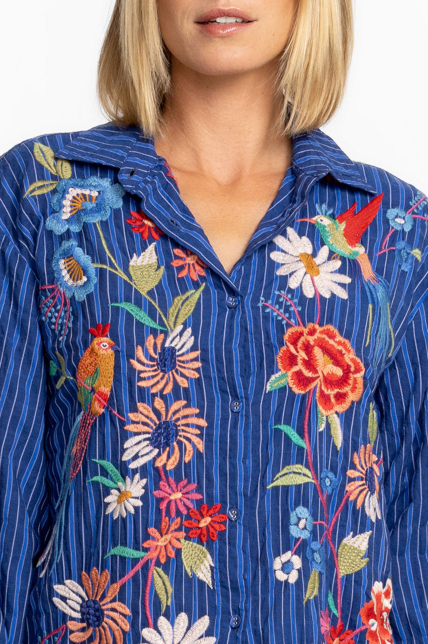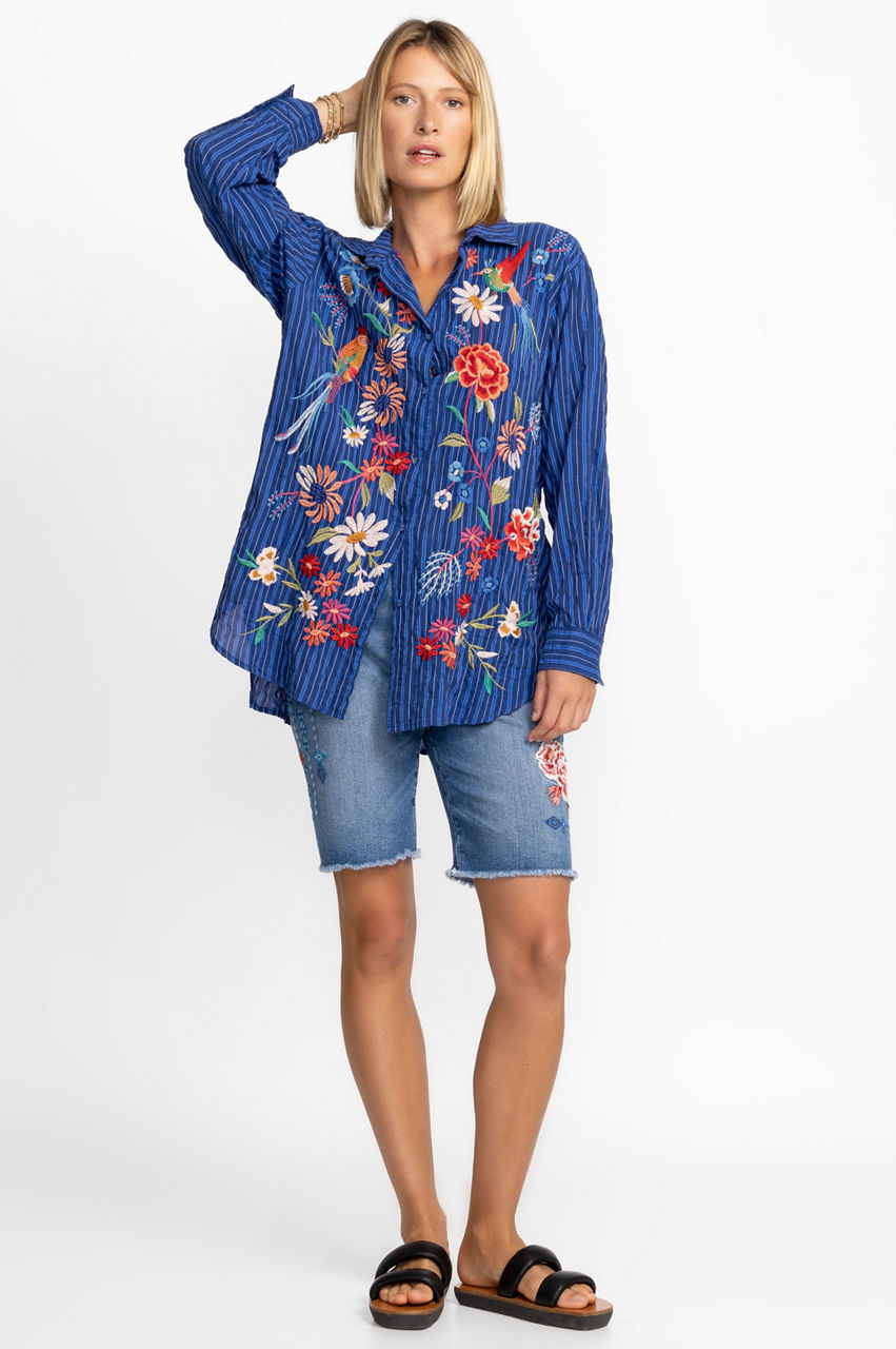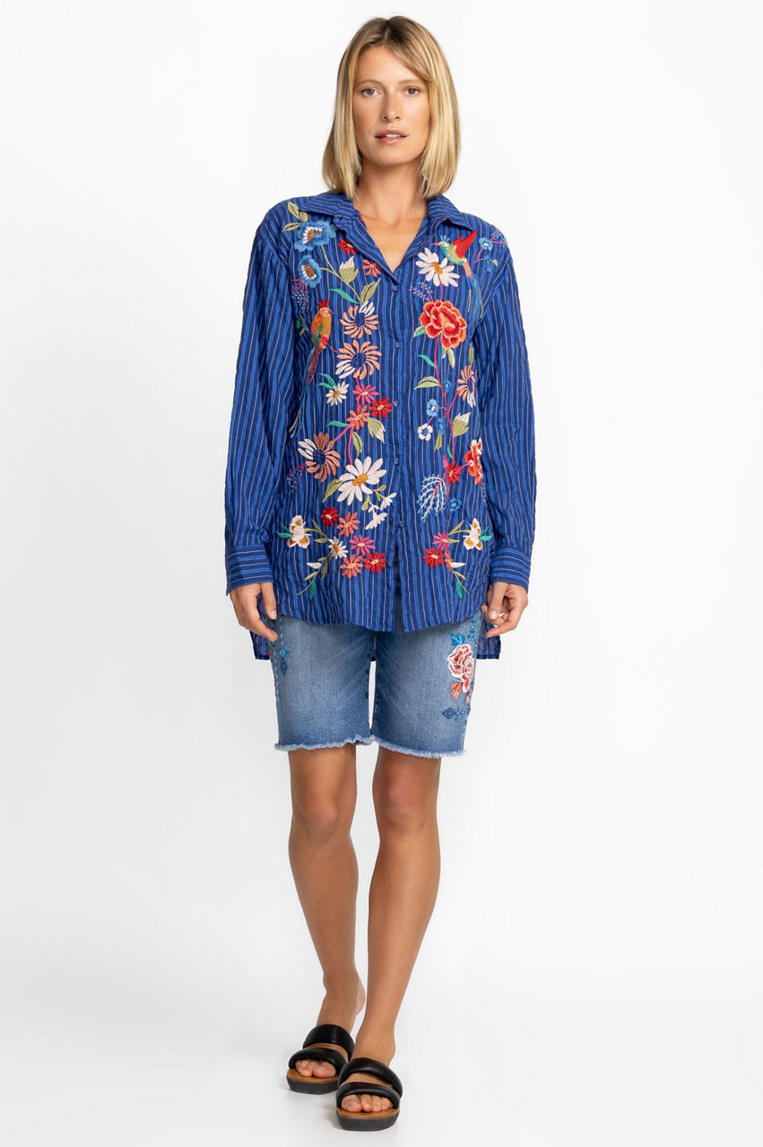 Inspired by nature's beauty, the Marissa Relaxed Oversized Tunic is a memorable opus of color. Crafted from a lightweight cotton blend, this blouse features covered buttons and elegant placement embroideries. Pair with pants and block heel sandals for a refreshing summer styling.
