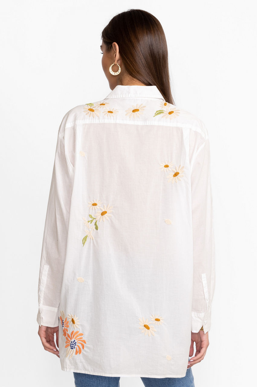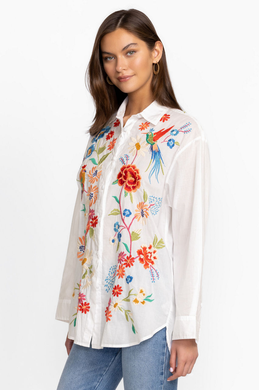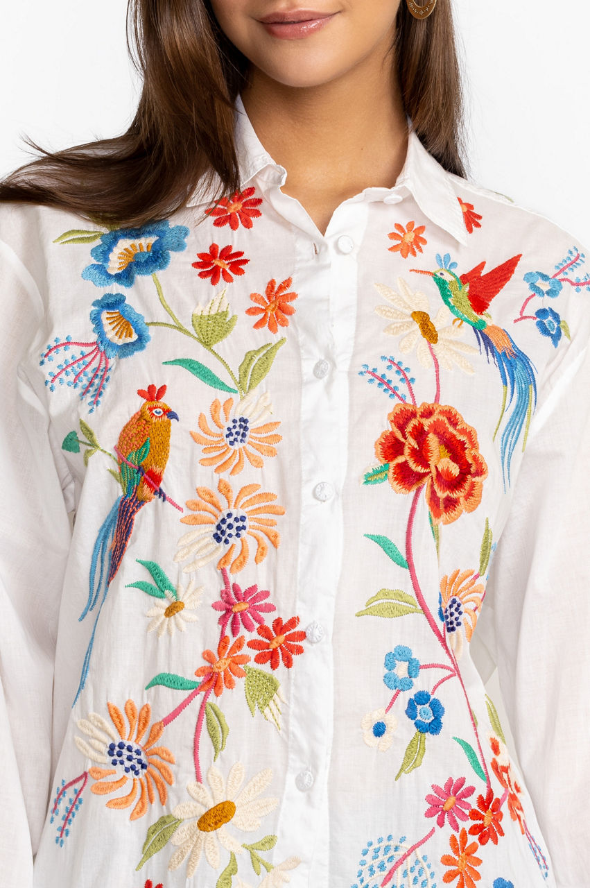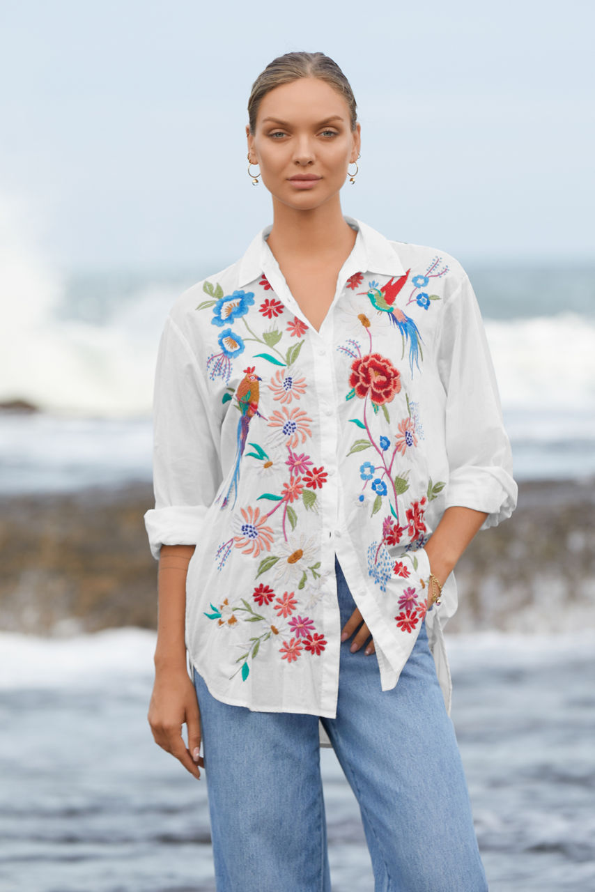 Inspired by nature's beauty, the Marissa Relaxed Oversized Tunic is a memorable opus of color. Crafted from a lightweight cotton blend, this blouse features covered buttons and elegant placement embroideries. Pair with pants and block heel sandals for a refreshing summer styling.