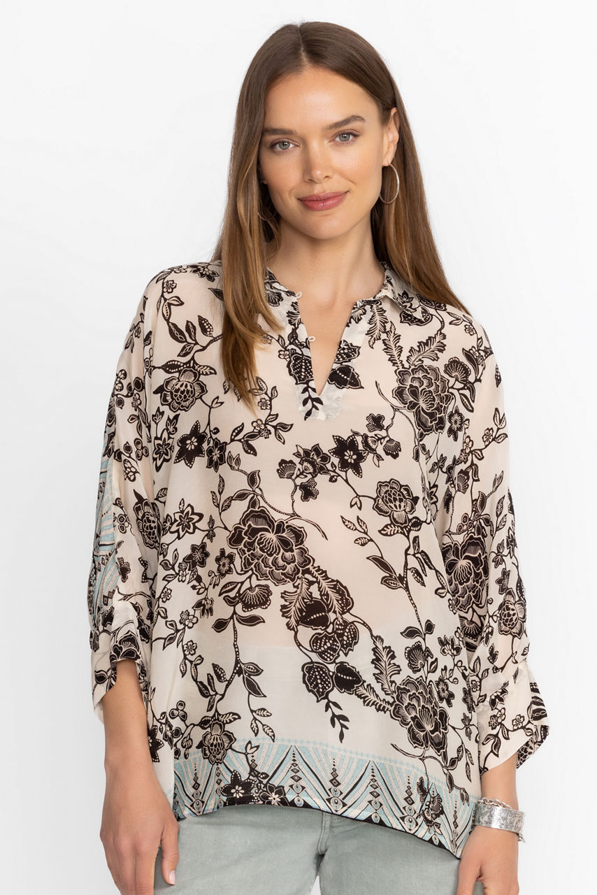 Crafted from a lightweight flowing fabric, the Marlow Blouse is adorned with an eye-catching floral pattern. Featuring a collared neckline with a keyhole front, this stunning blouse offers a drop sleeve and side slit vents for a relaxed fit. Pair with black fitted pants and leather flats for a casual work ensemble with elevated style.