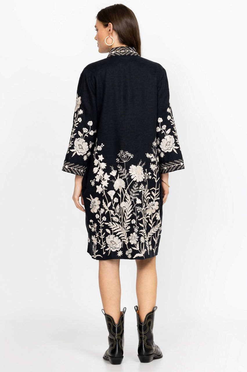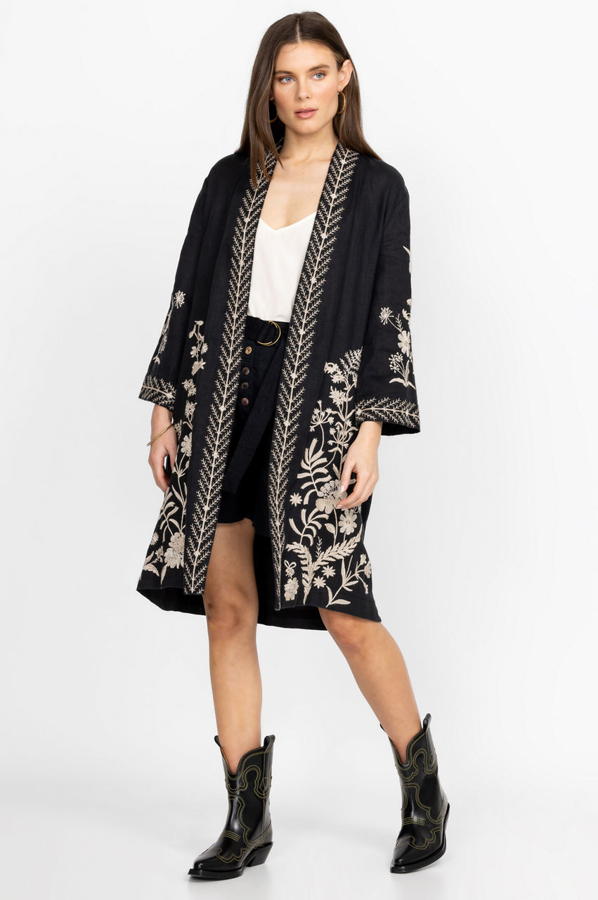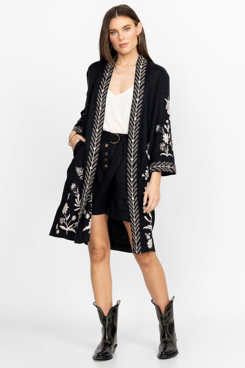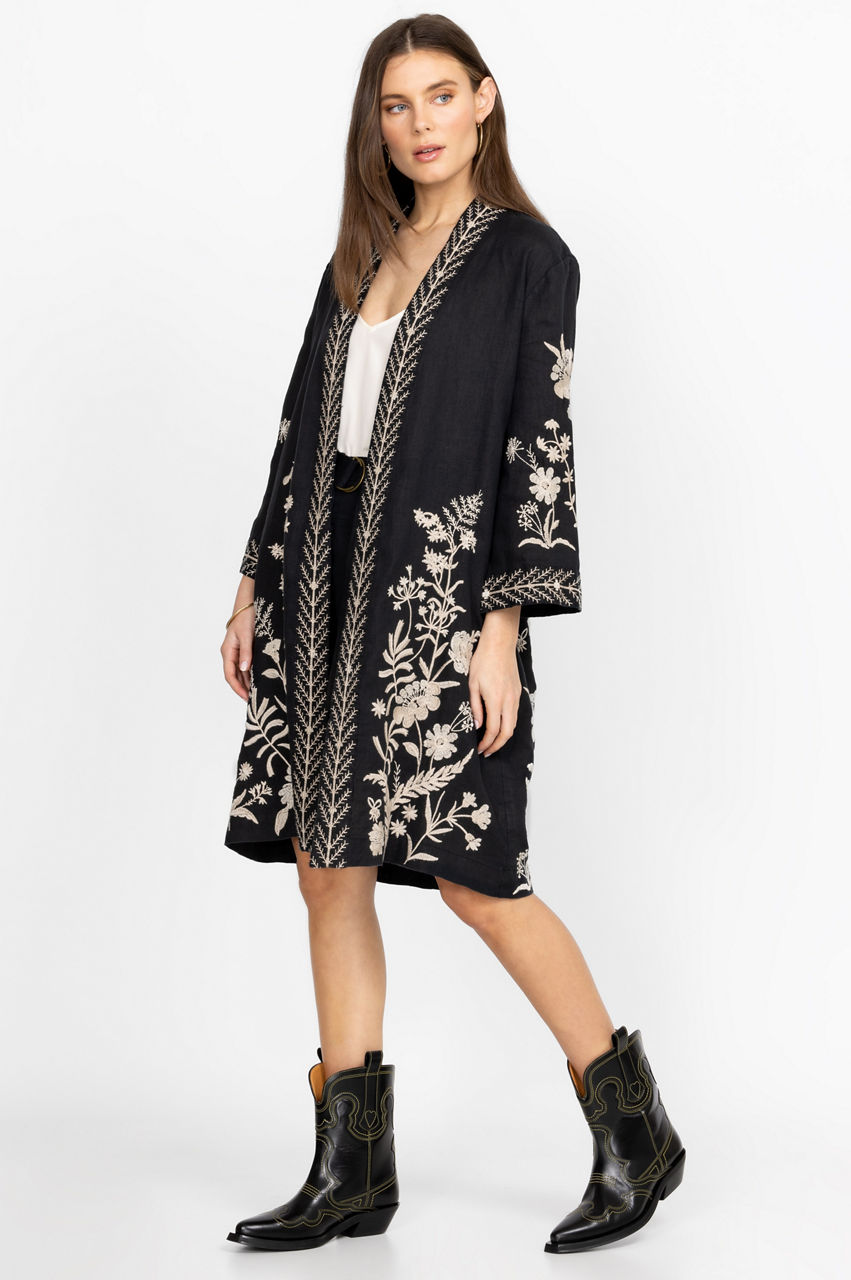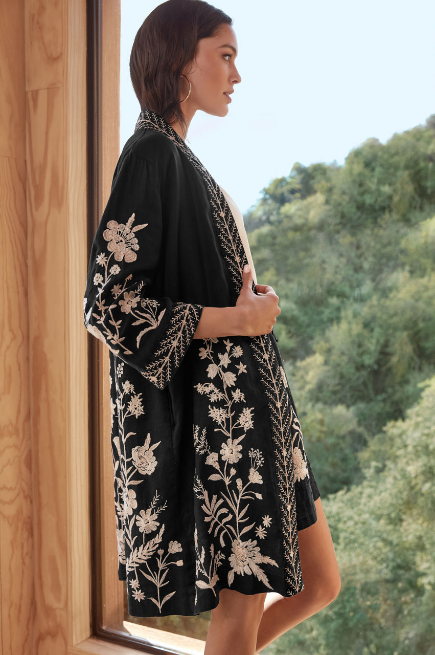 Demonstrating a passion for detail, the Marseille Linen Kimono Coat is a refined take on lightweight layering. This kimono coat is designed from breathable linen and boasts an open front, long sleeves, functional pockets, embroidered trims along the edges, and an additional placement embroidery comprising feminine florals. For the evening, style over a dress and for the daytime, pair with denim and a vest.